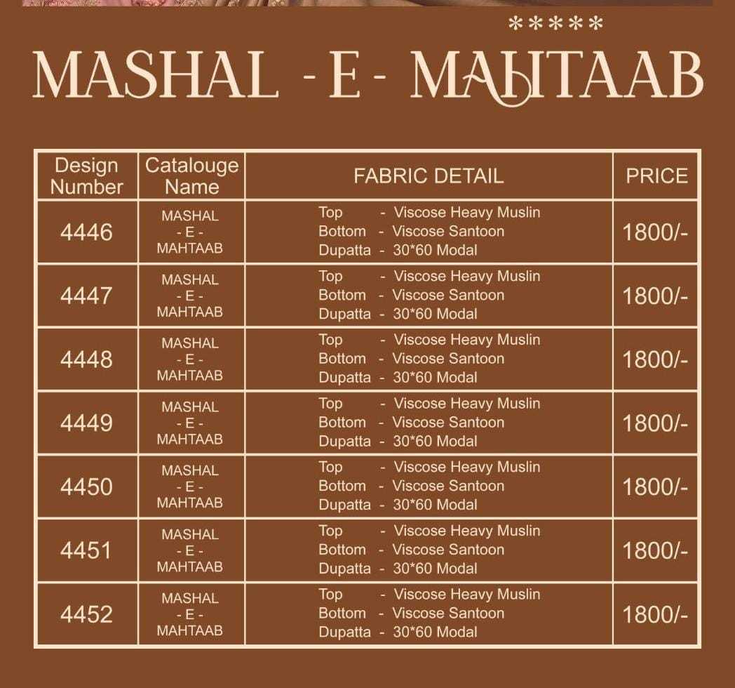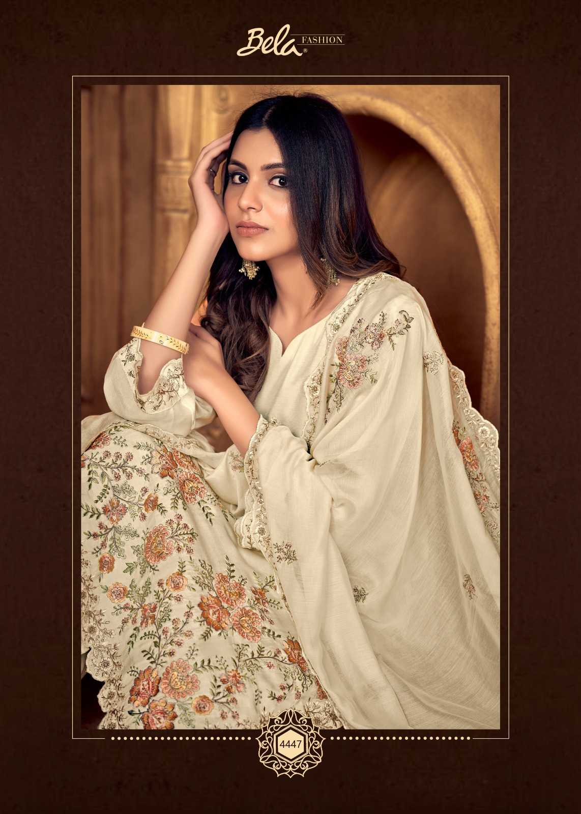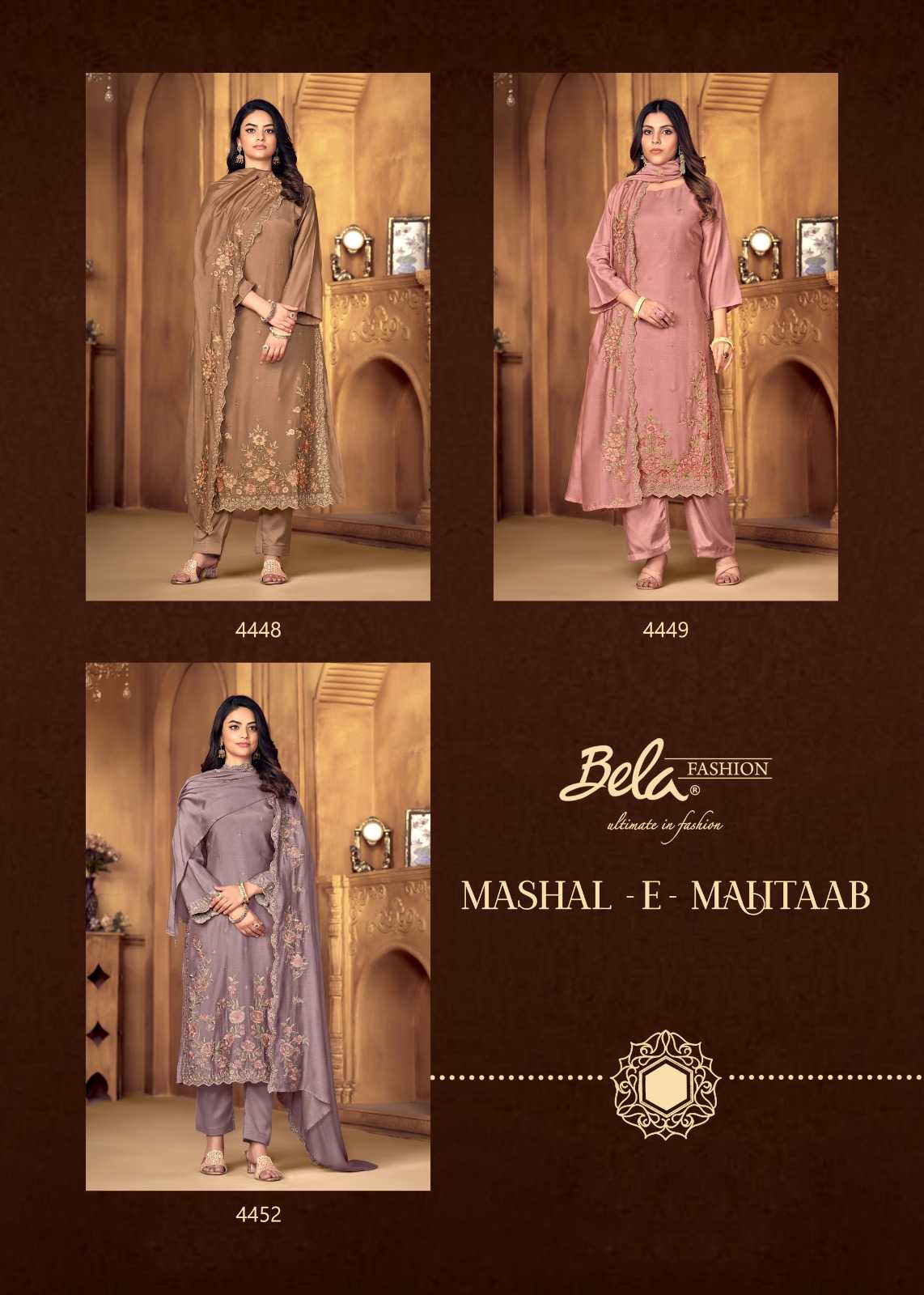 Brand name - Bela Catalog name - mashal e mahtaab Series 4446 to 4452 Fabrics & rate list attached GST EXTRA Set to set |