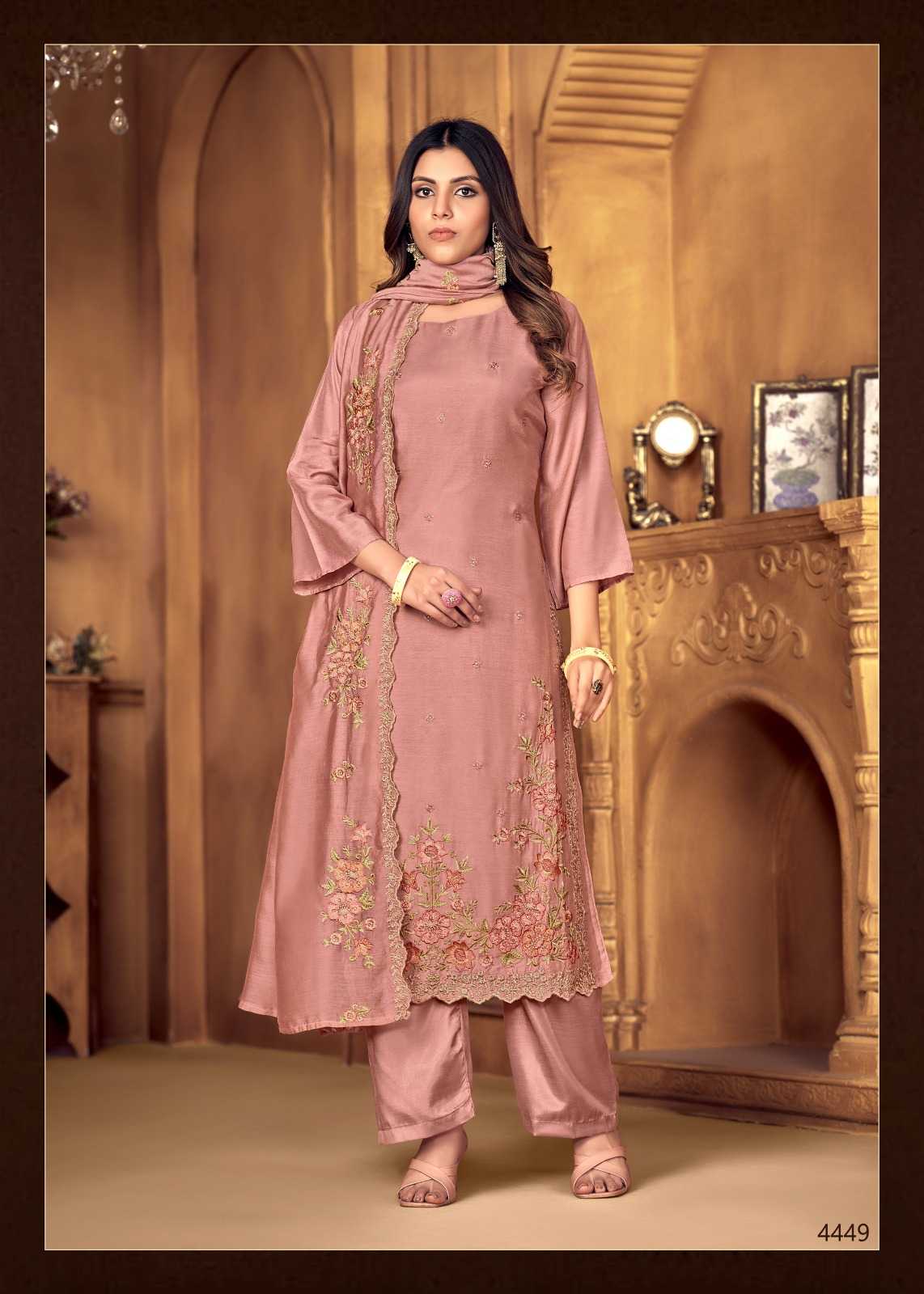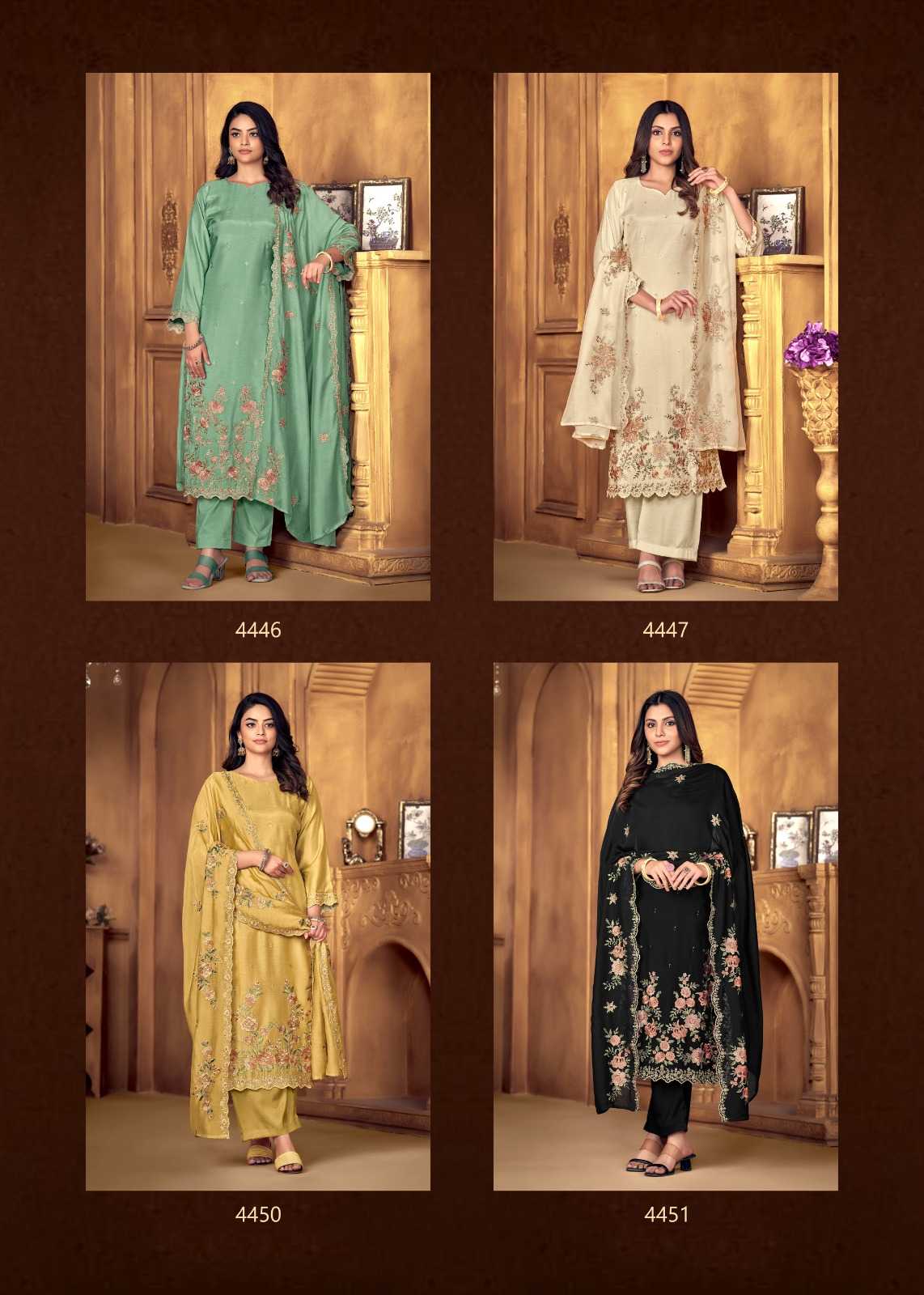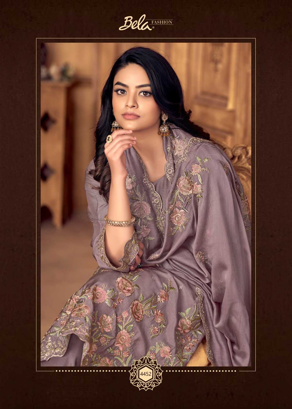 Brand name - Bela Catalog name - mashal e mahtaab Series 4446 to 4452 Fabrics & rate list attached GST EXTRA Set to set |