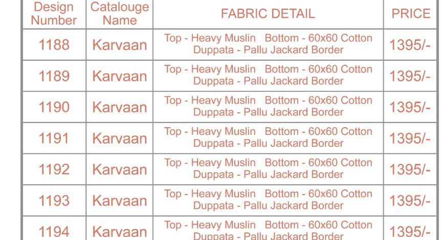 Series - 1188 to 1194. Catlog name - KARVAAN . GST 5 Percent Extra. Delivery from tomorrow |