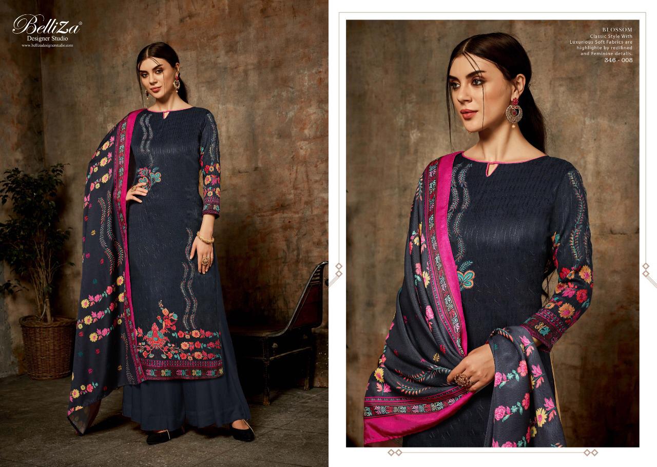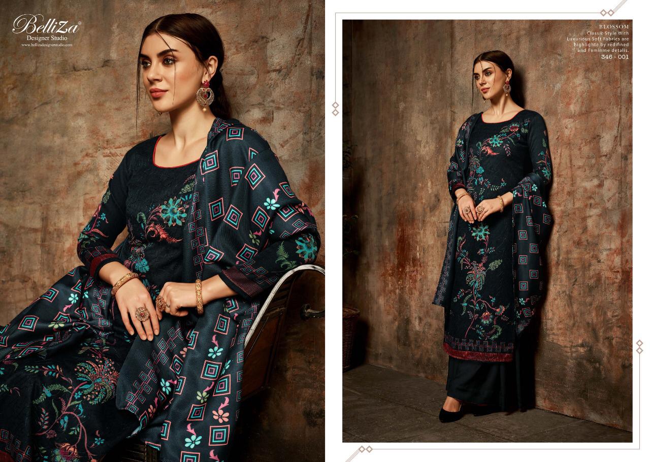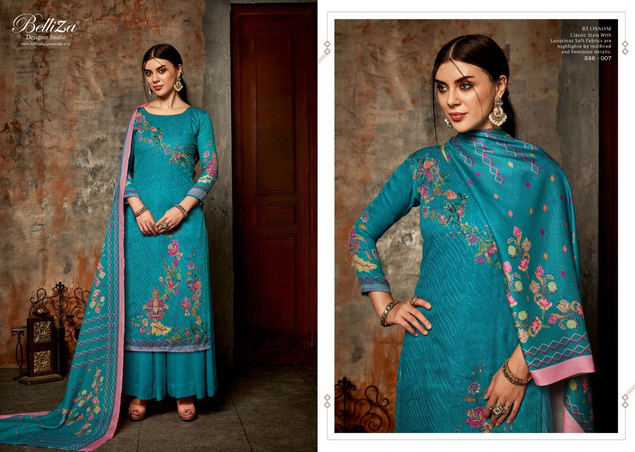 ...BelliZa DesigNer StuDio... âÂÂpresentsâ âÂÂBLOSSOMâ ...Aari Embroidery Work... Top: 100% Pure Pashmina Digital Print with Aari Embroidery work (2.50 mtr apx) Dupatta: Pure Pashmina Shawl with four side lace. (2.30 mtrs apx) Bottom: Pure Pashmina Spun (3 mtrs apx) Pcs: 10 Selling Rate :685/- (Applicable GST extra) Witness the magic of falling in love with Pashmina â At Belliza, Quality Fabrics with exquisite designs at Best Price is our Cherished Legacy. |