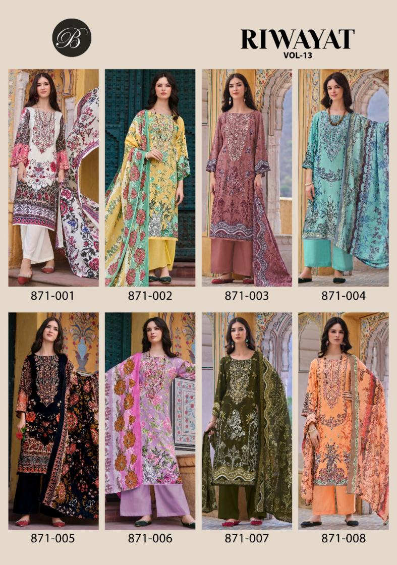 # RIWAYAT VOL 13 BY BELLIZA ......BelliZa DesigNer StuDio...... presents ”RIWAYAT VOL 13" 🔺Dupatta: 100% Pure MAL MAL Cotton Dupatta Digital Print (2.30 mtrs apx) 🔺Bottom: 100% Pure Viscose Rayon (3 mtrs apx) 🔺Pcs: 08 🔺 Rate: 575/- |