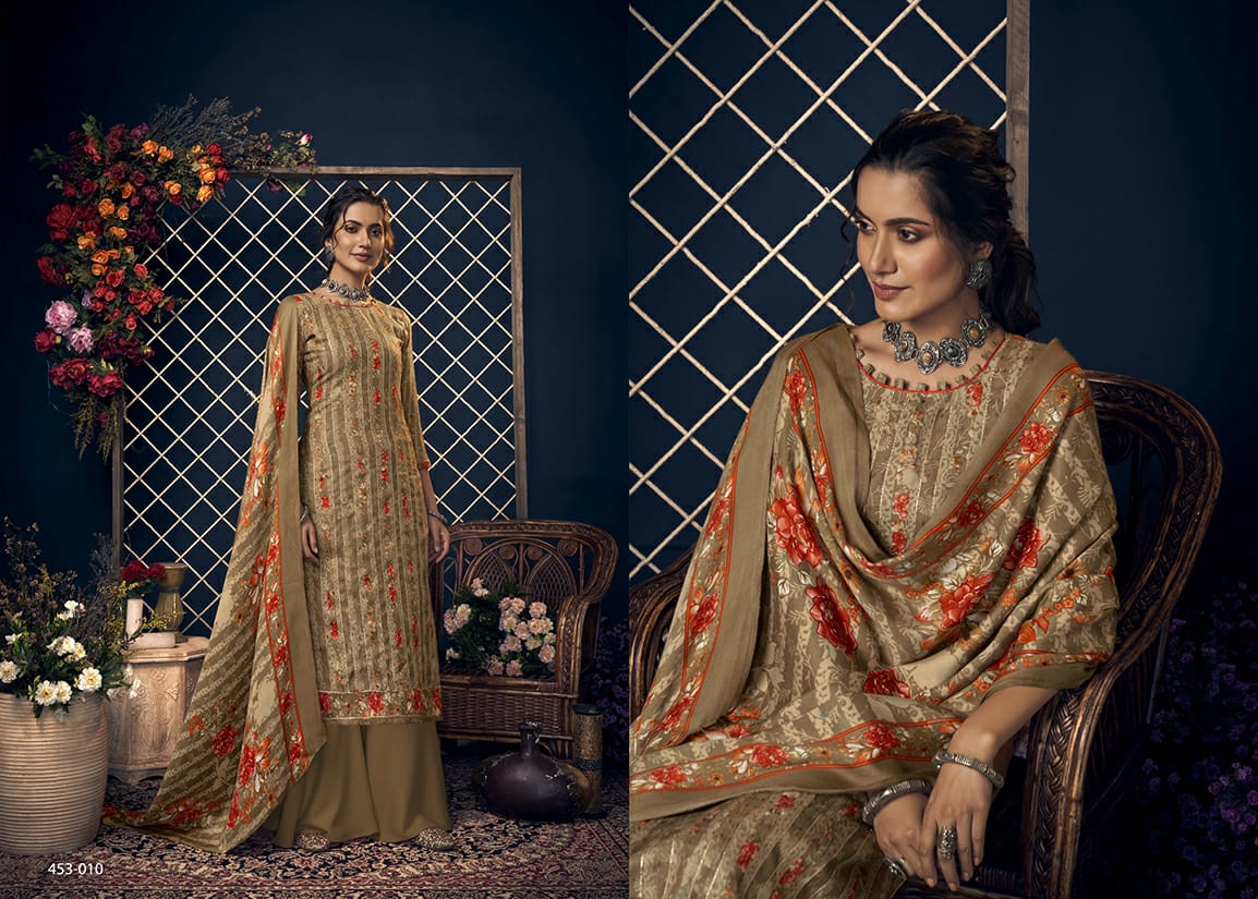 # Pure Pashmina # Exclusive Handwork ......BelliZa DesigNer StuDio...... presents "KASHMIRIYAT" designer handwork collection ♦️Top: 100% Pure Pashmina Digital Print with Exclusive Sleek Kasab Gota Work. (2.50 mtrs) ♦️Dupatta: Pure Pashmina Shawl with Four side Lace (2.30 mtr) ♦️Bottom: Pure Pashmina Spun (3 mtrs apx) ♦️Pcs: 10 ♦️Selling Rate: 585/- (GST extra) At Belliza, Quality Pashmina Fabrics with Exquisite Designing at Best Price is our Cherished Legacy. |