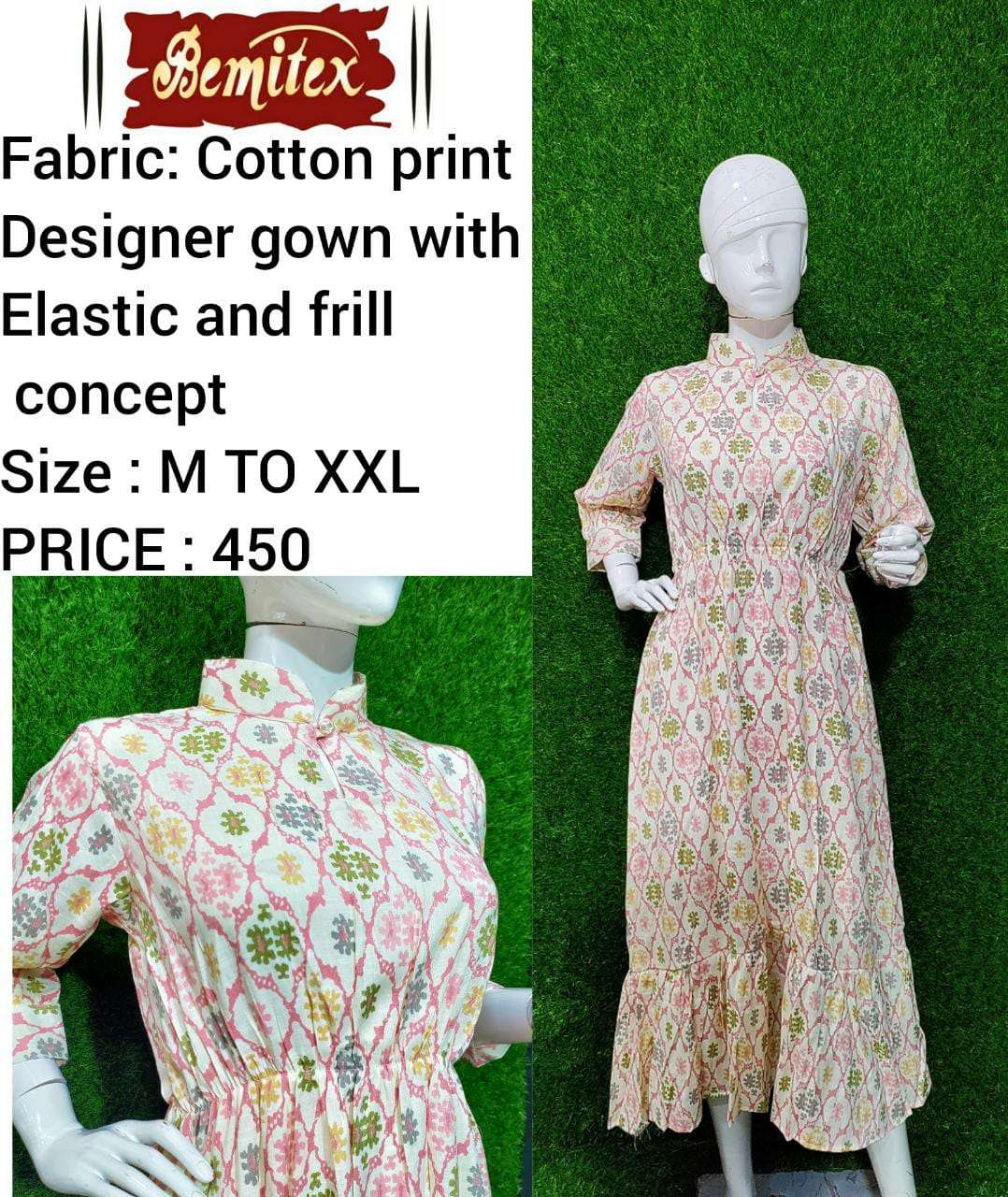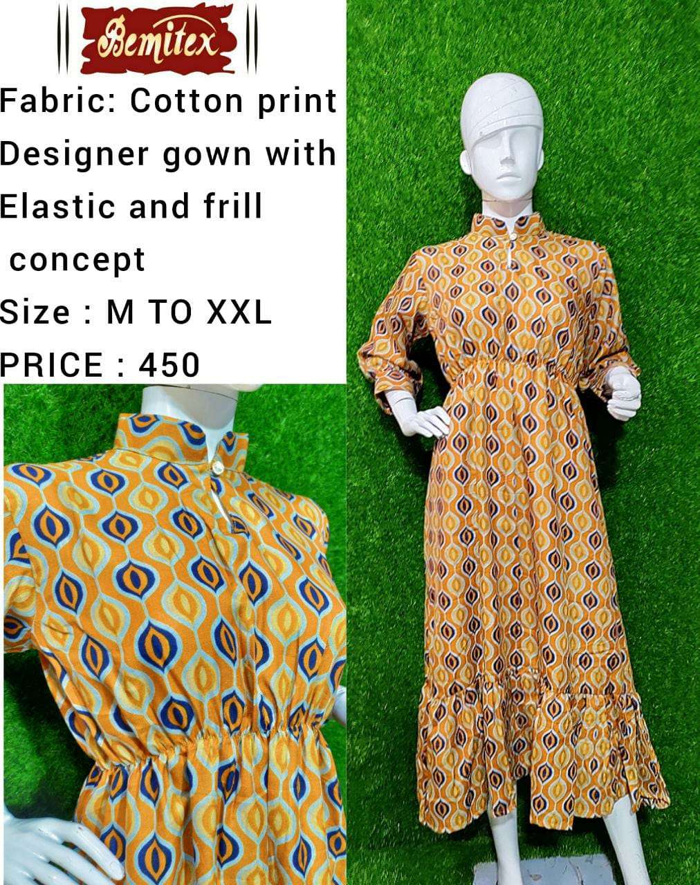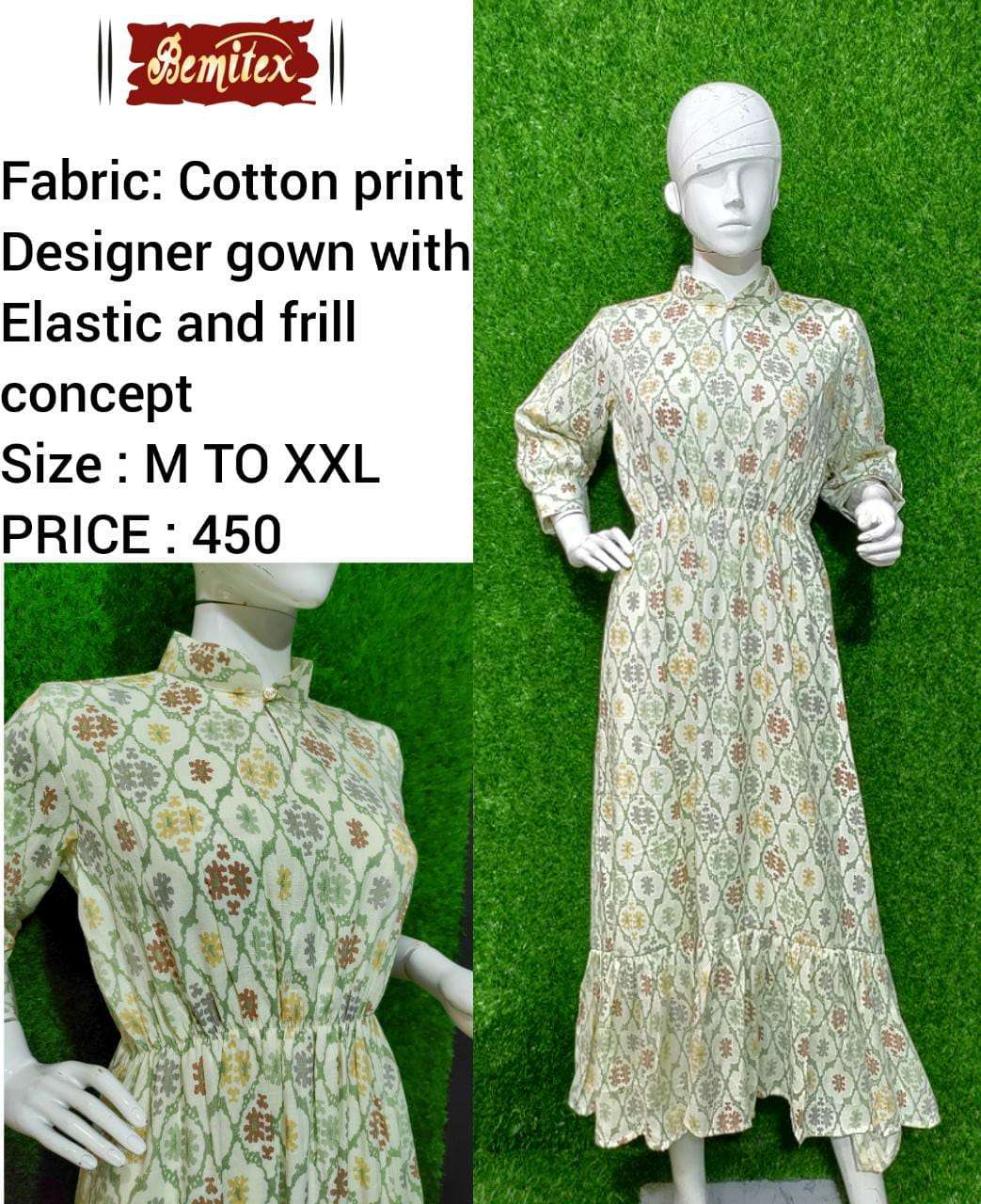 bemitex pr cotton print gown kurti with elastic and frill combo set