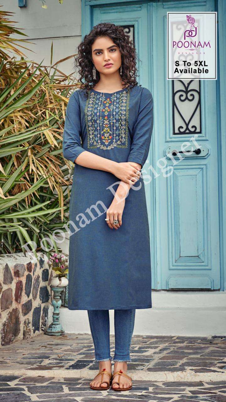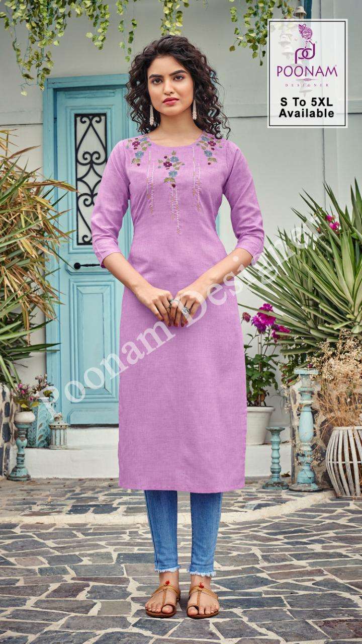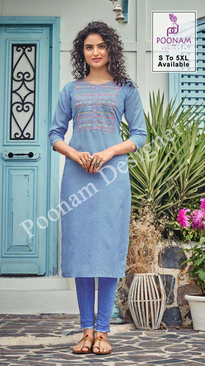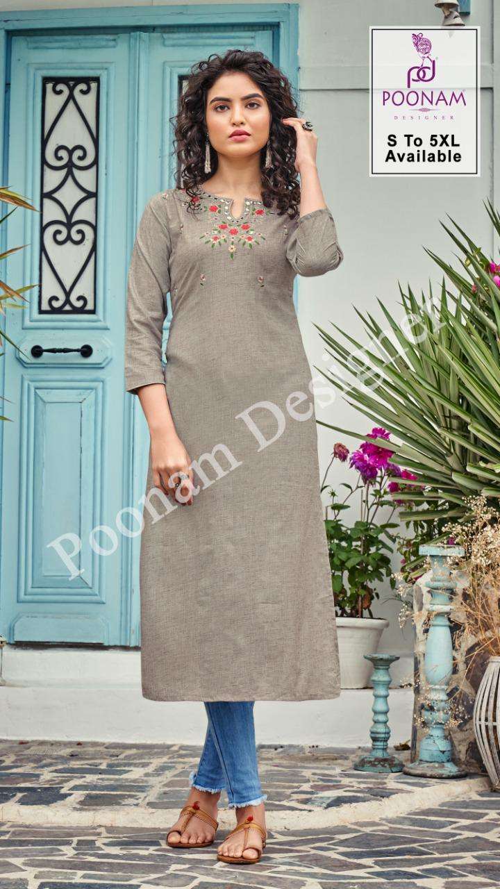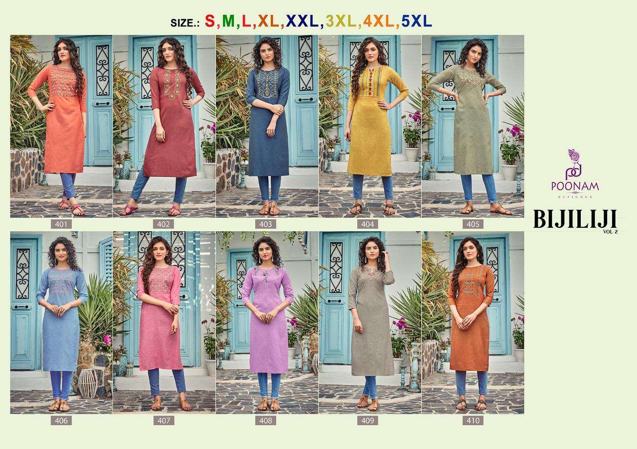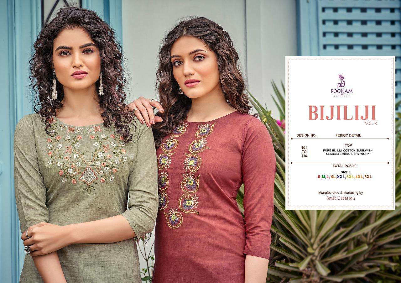 Poonam Designer® â (Smit creation)      â B I J I L I J Iâ        Top (kurti) - Pure Bijiliji        Cotton with classic        Embroidery work.         Length = 46â            Size            S,M,L,XL,XXL,3xl,4xl,5xl.             Dispach - 08/07/21          (Thursday) 299/- per pcs . Set to set. |