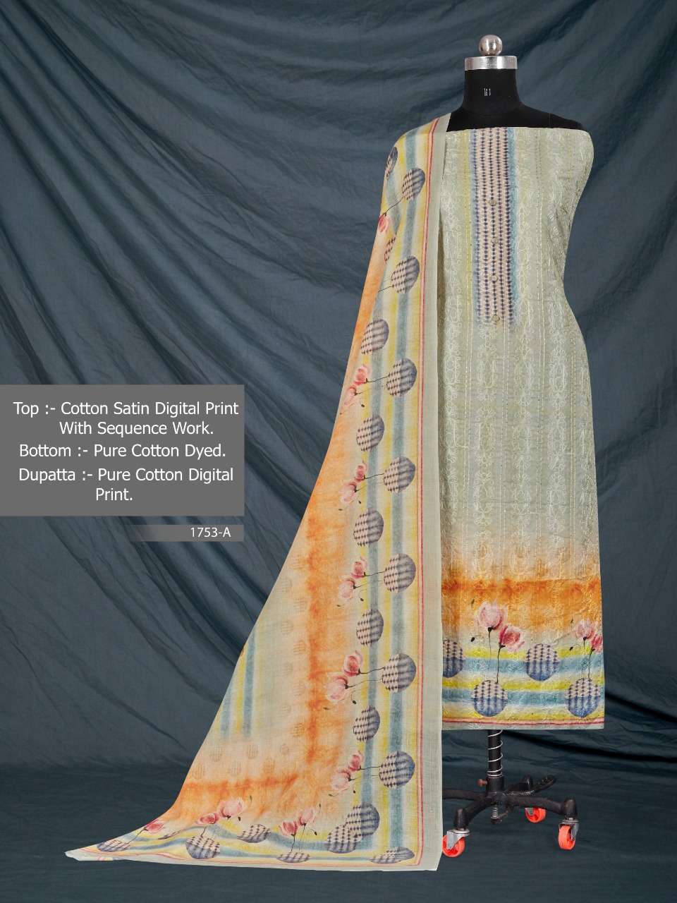 BIPSON Brings ..... TOP :-Cotton Satin Desiner Digital Print with sequence Chain Stitch work 2.5MTR BOTTOM :- Soft Cotton Solid Dyed .2.7mtr DUPATTA :- Pure Mal Cotton Beautiful Digital Print .2.25mtr 4 Colour Set Rate: ₹765/- |