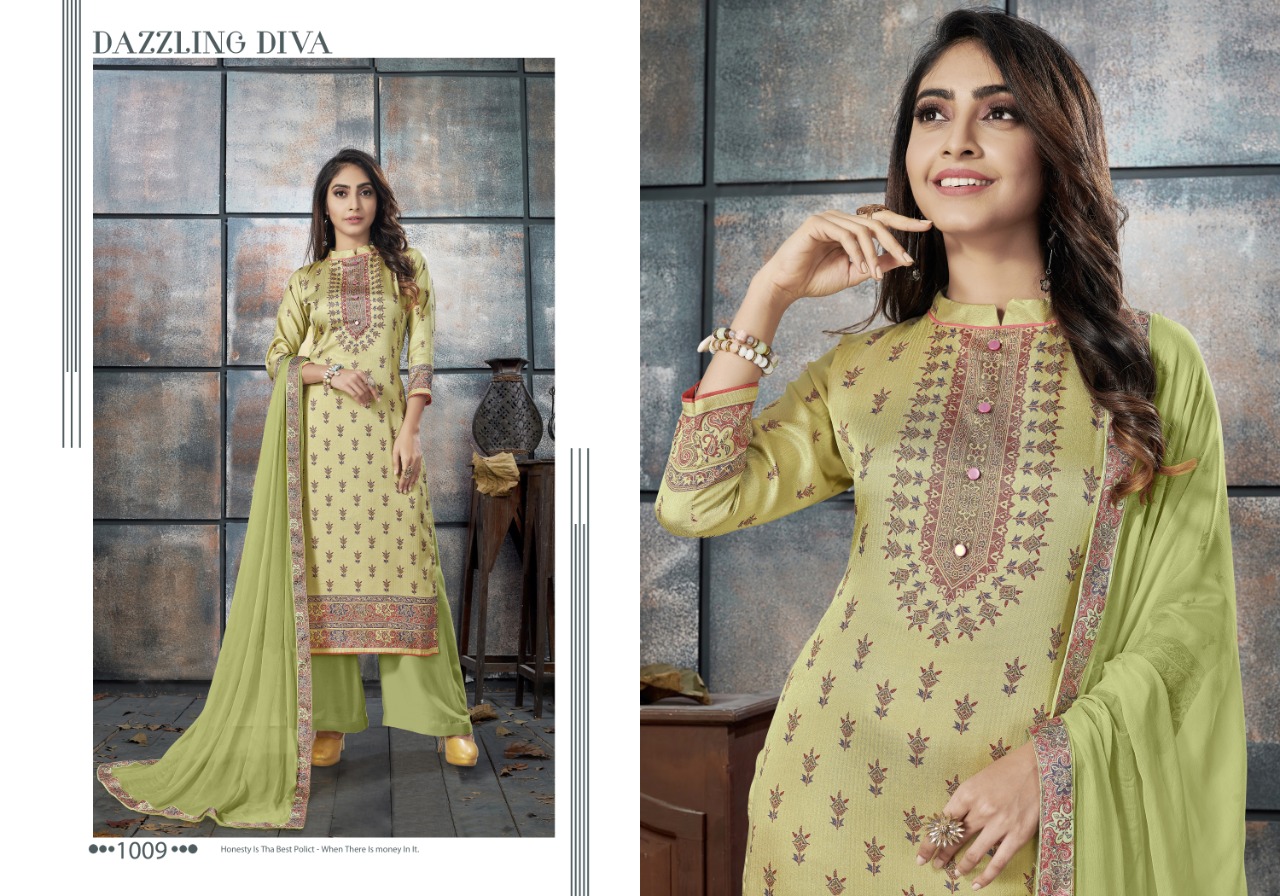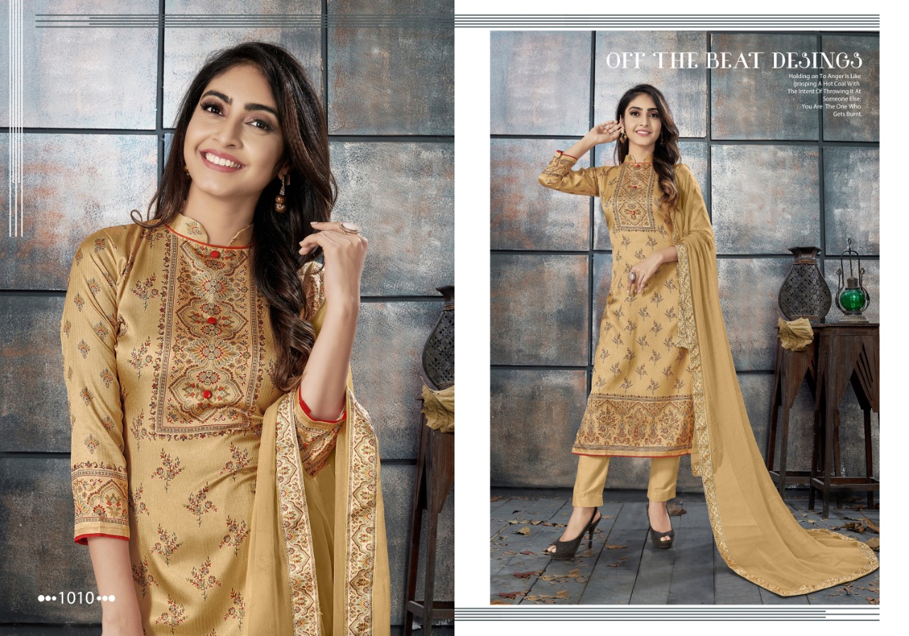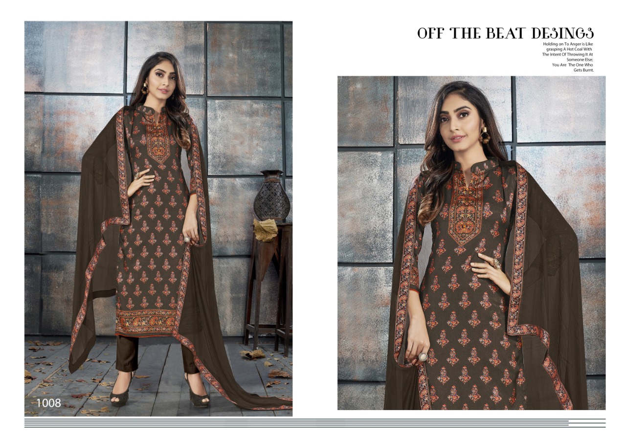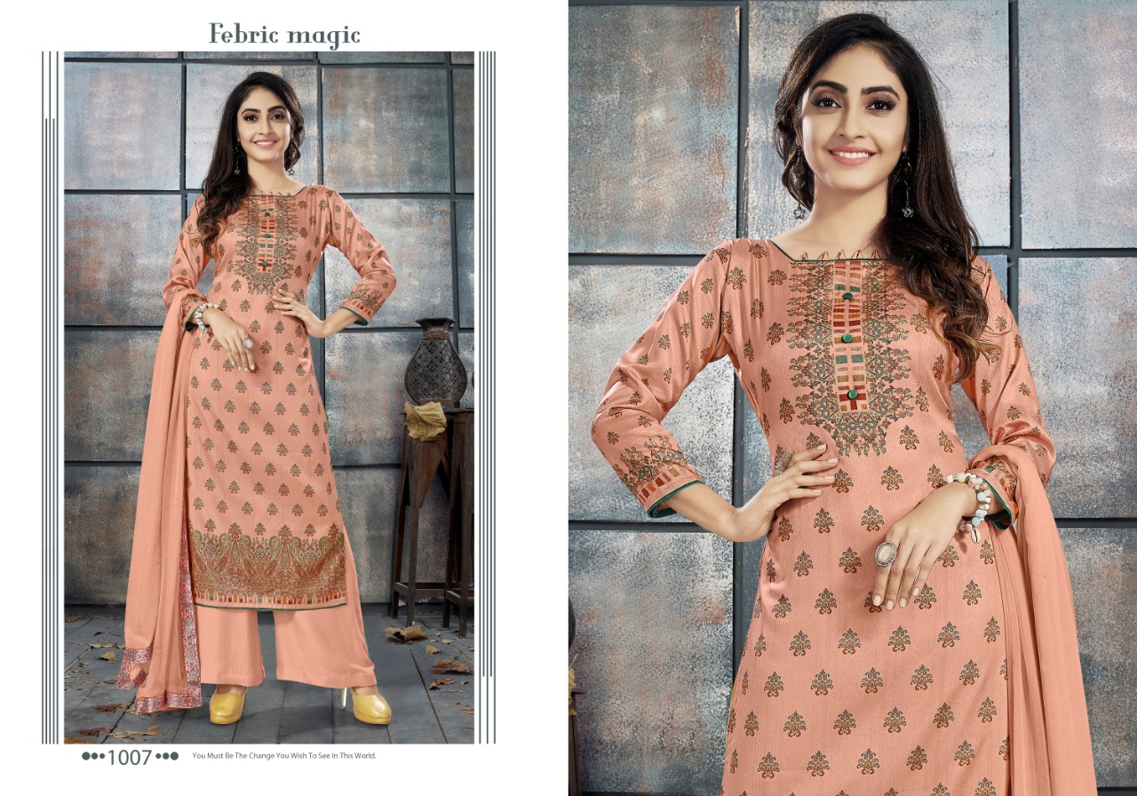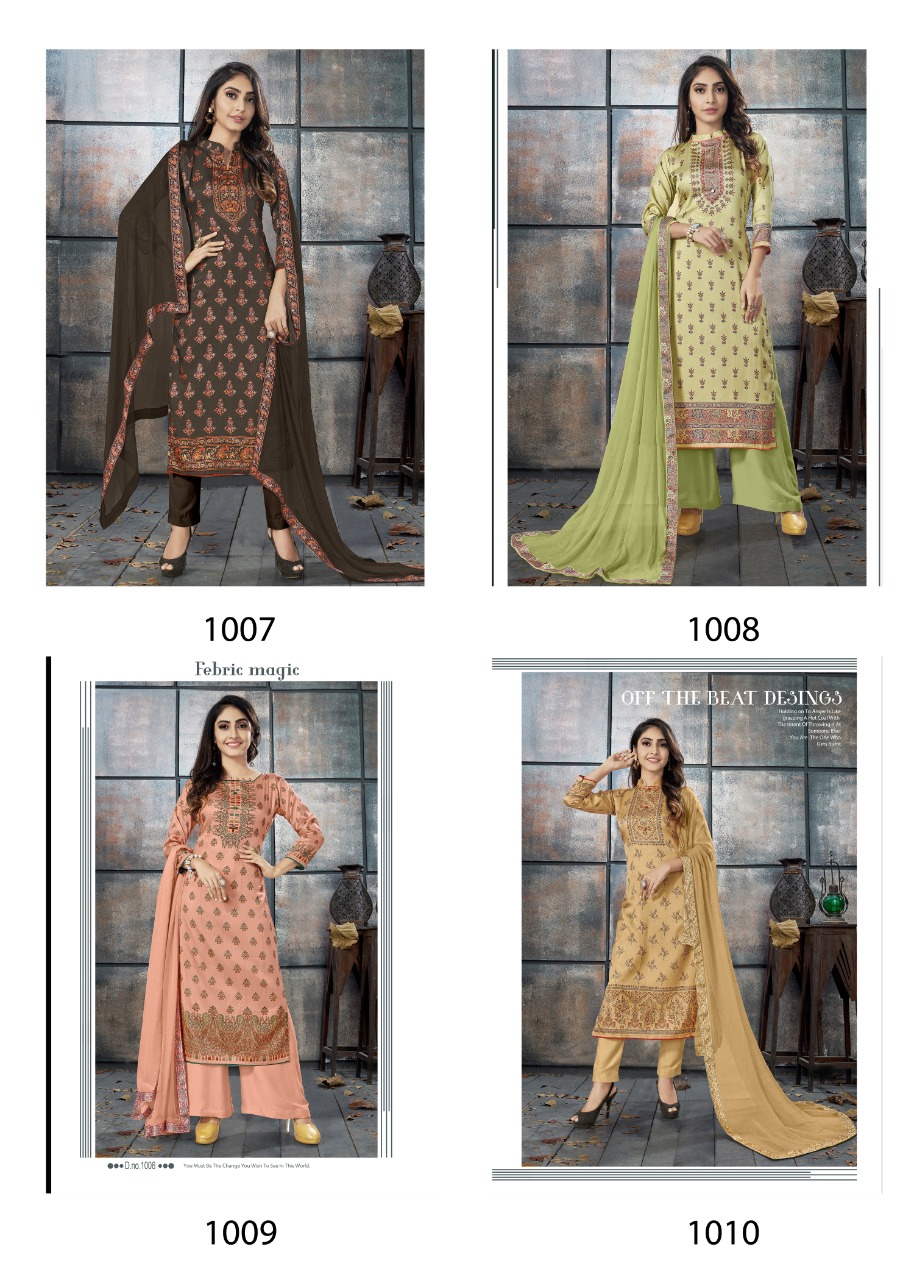 WINTER EXLUSIVE COLLECTION _ELEGANCE 1007-1010 _ TOP :- _ Tusser Silk Digital_ Print . Bottom :- Pure Tusser Dyed . Dupatta :- _Pure Bemberg Dyed With 4 Side Digital Patti . _ *@ 845 /- * Set to set . GST 5 Percent Extra. Delivery from tomorrow |