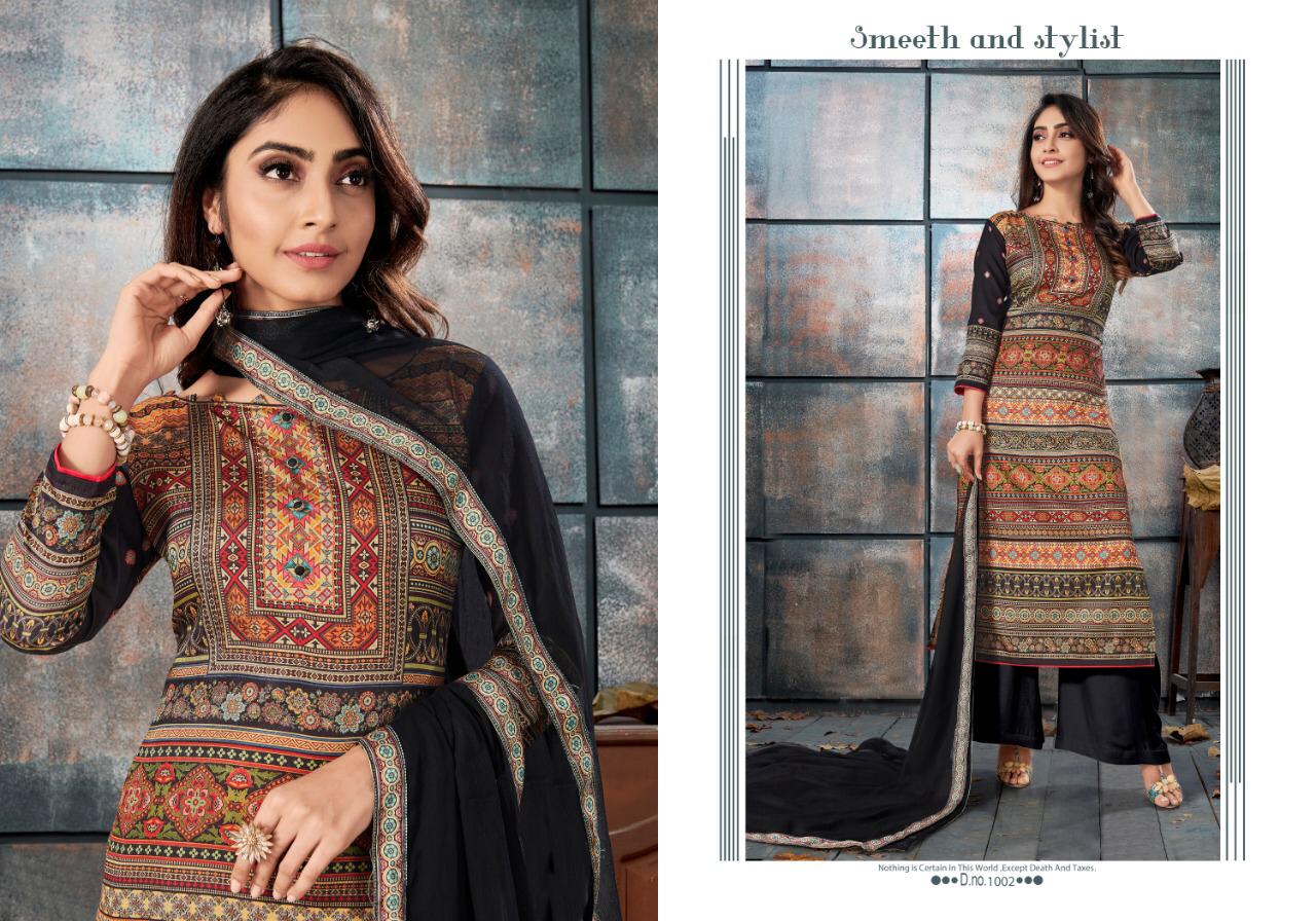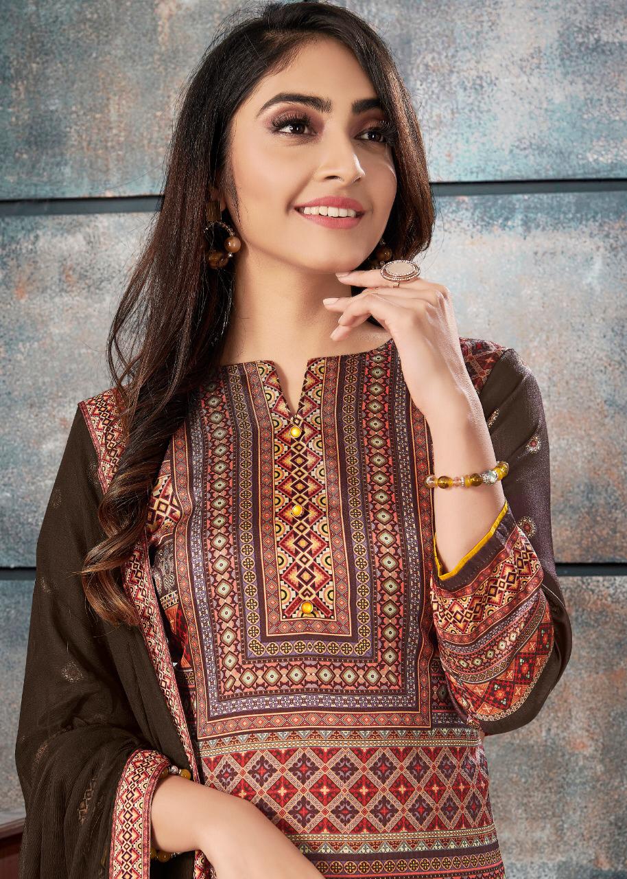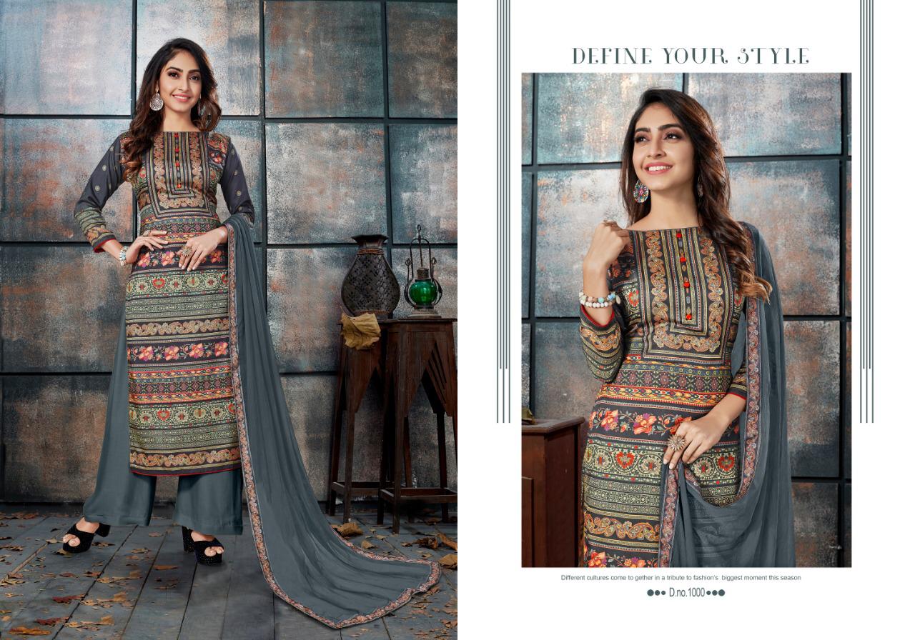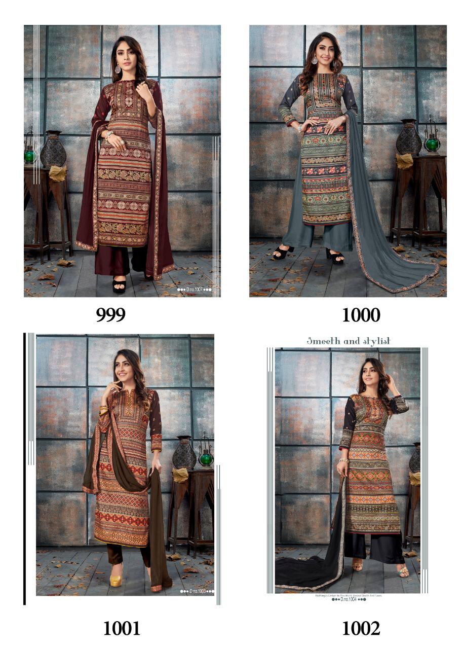 WINTER EXLUSIVE COLLECTION _ELEGANCE 999-1002 _ Set to set. GST 5 Percent Extra. Delivery 2 days TOP :- _ Tusser Silk Digital_ Print . Bottom :- Pure Tusser Dyed . Dupatta :- _Pure Bemberg Dyed With 4 Side Digital Patti . _ *@ 845 /- * |