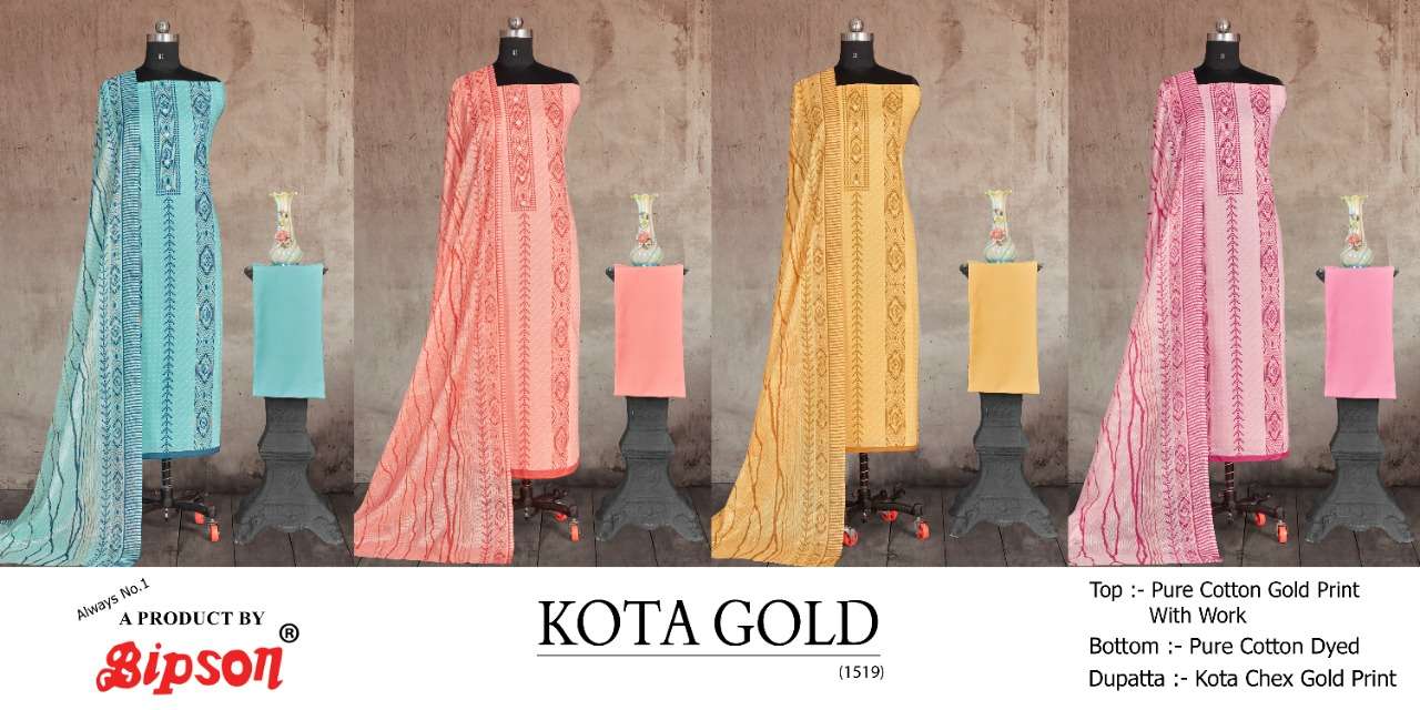 BIPSON  Brings ..... ```Premium Cotton Collection `     KOTA GOLD      Dn no 1519 TOP :- _ Pure Cotton GOLD Print With Work .2.5MTR BOTTOM :- _Pure Cotton Dyed .2.7mtr DUPATTA :- _ KOTA CHEX GOLD Print 2.25mtr @495 per pcs. Set to set |
