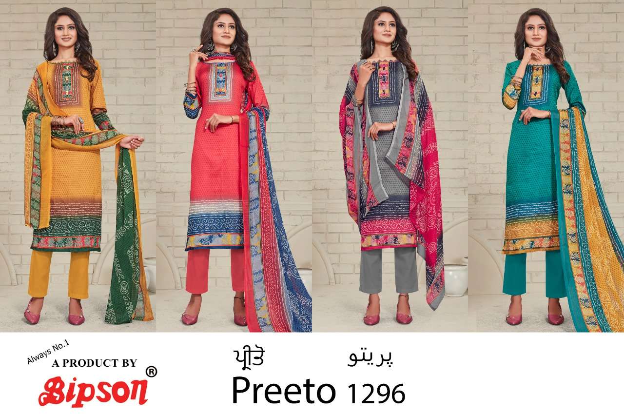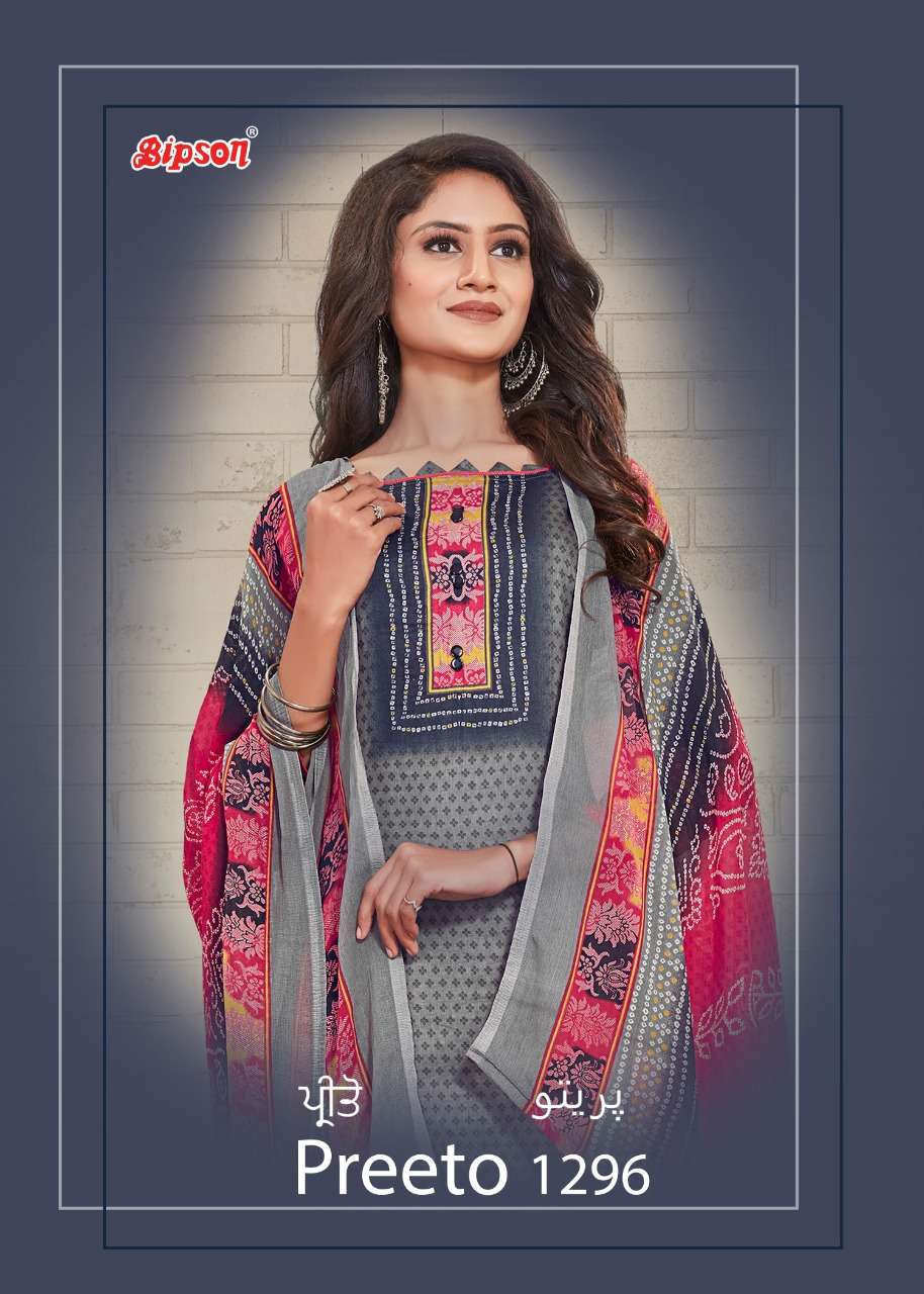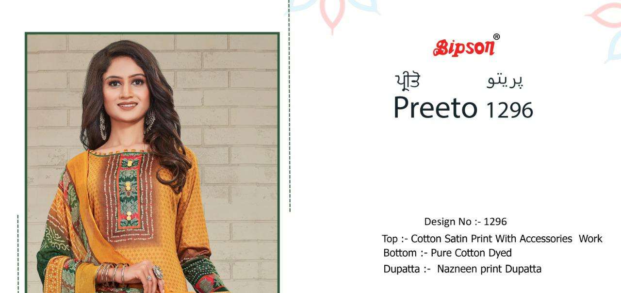 BIPSON  Brings ..... Premium Cotton Collection _ PREETO - 1296 _ TOP :- _ Glace Cotton Print With Work ._ BOTTOM :- Pure Cotton Dyed .  DUPATTA :- _ NAZNEEN PRINT ._  @ 515 /- Set to set |