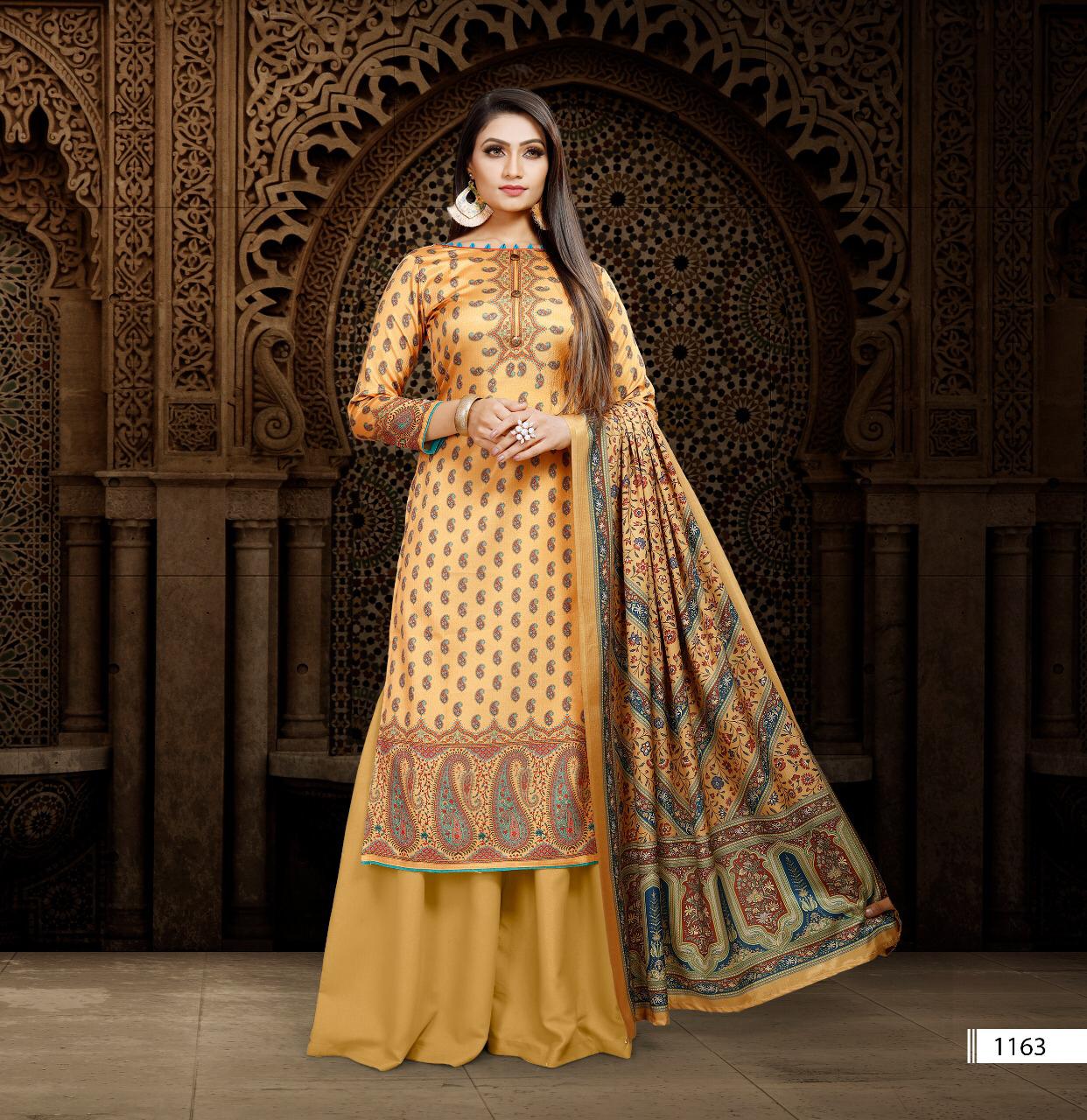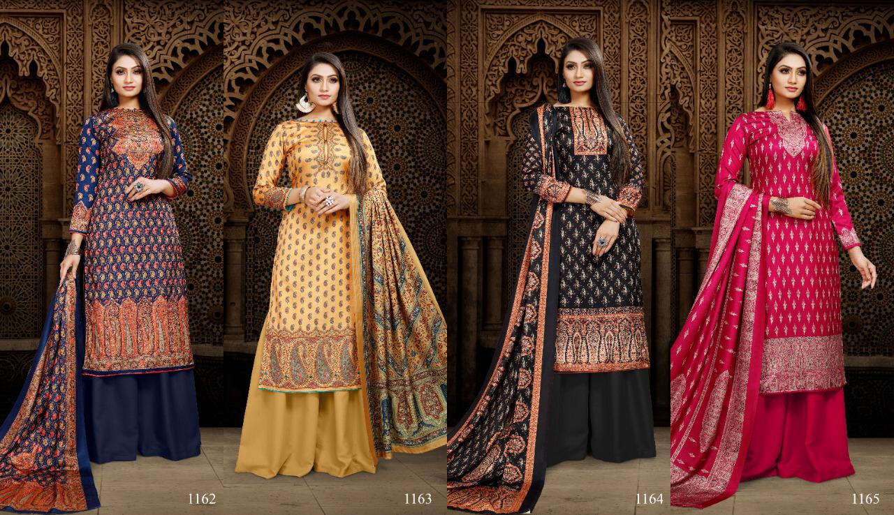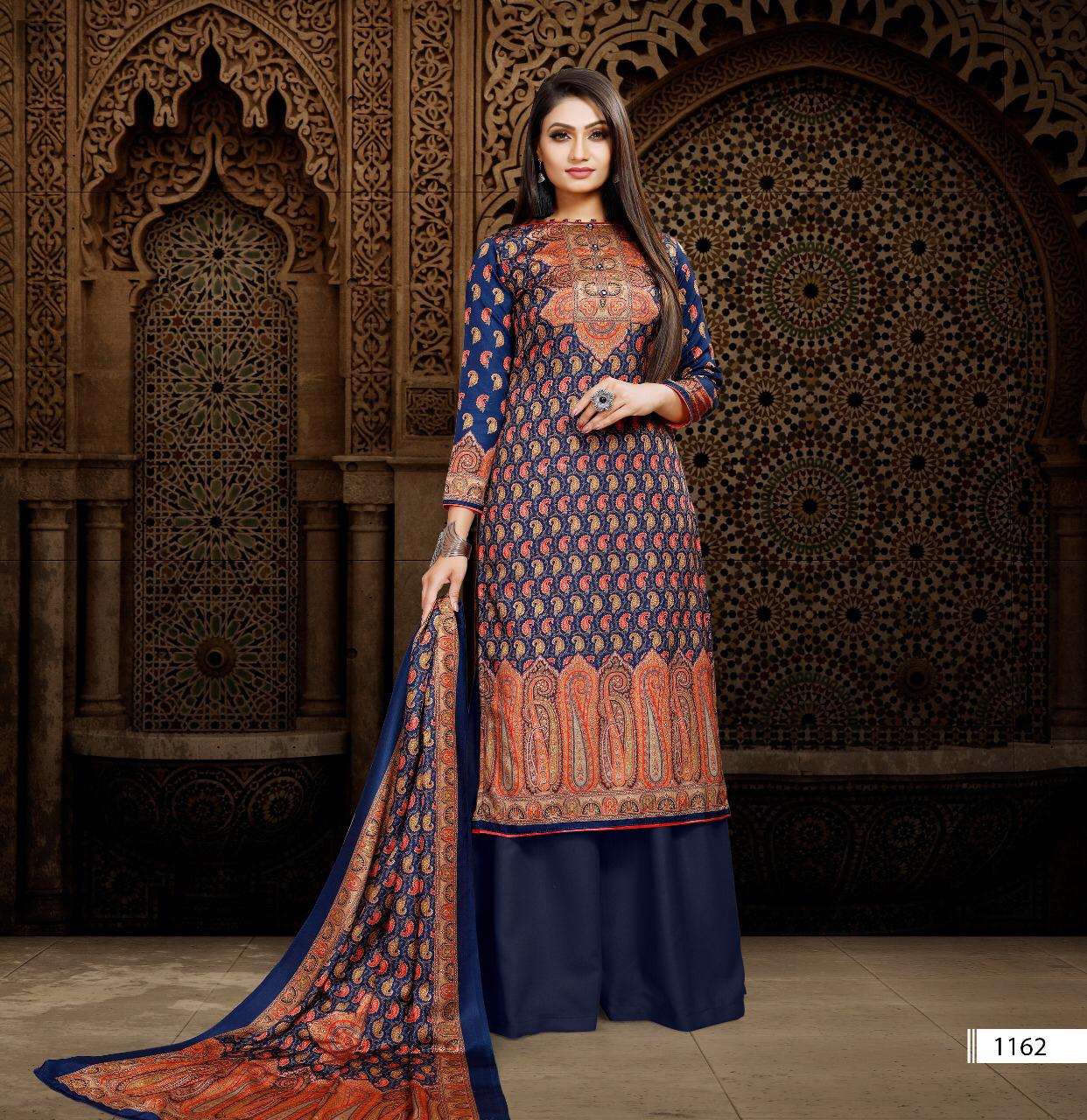 WINTER EXLUSIVE COLLECTION QUEEN 1162 to 1165 TOP :- _ Tusser Silk Digital_ Print . Bottom :- Pure Tusser Dyed . Dupatta :- _Tusser Silk Digital Print . _ 4 ps catlouge *@ 845 /- Set to set . Delivery from tomorrow |
