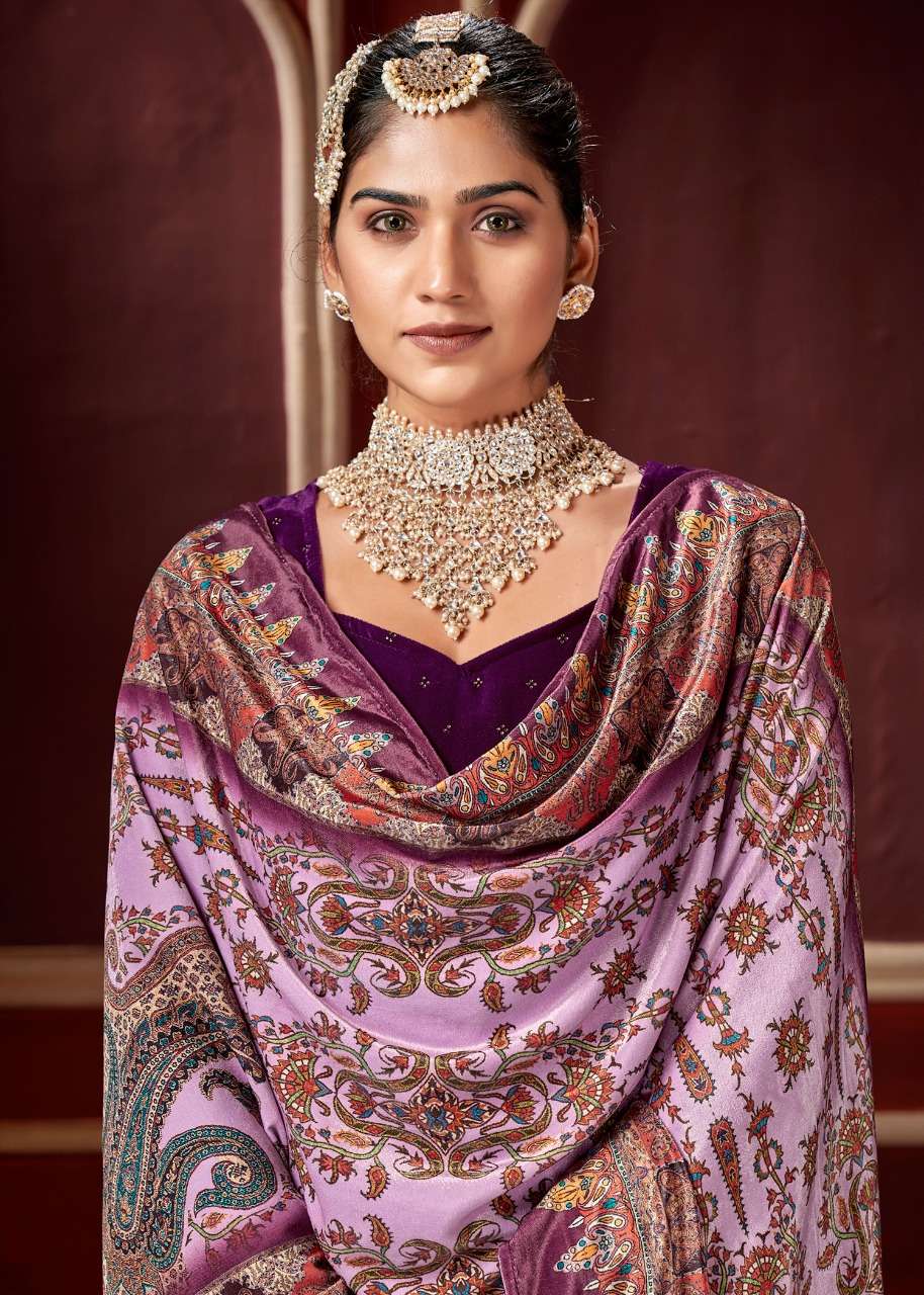 Bipson Print Pvt Ltd SWAROVSKI Fabric details: Bottom: Pure Pashmina dyed ; Cut: 2.7 mts Dupatta: Pure VELVET 9000 digital printed dupatta; Cut: 2.25 mts Pcs : 4 |