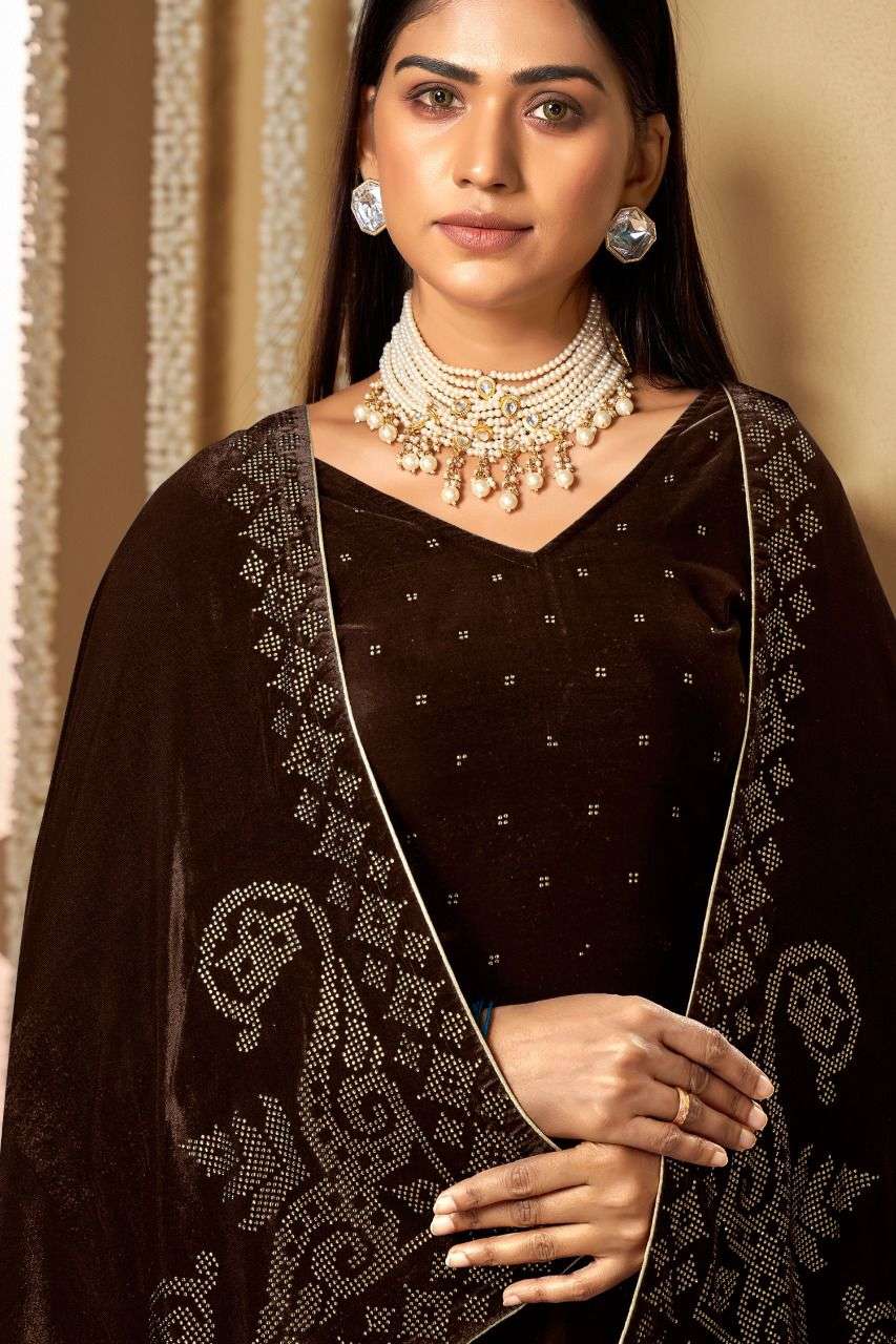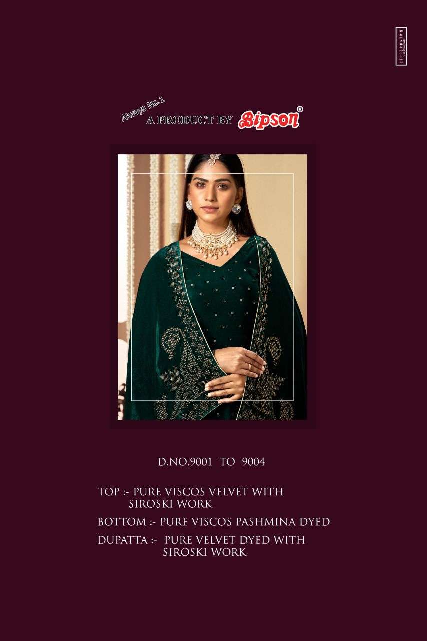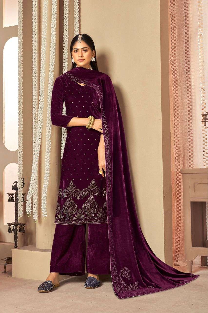 *BIPSON PRINTS PVT LTD * *TOP :PURE VISCOSE Velvet Dyed With Siroski Work 2.5 MTR BOTTOM Pure VISCOS Pashmina Dyed 2.5 MTR DUPATTA :- _ Pure Velvet Dyed with SIROSKI Work 2.25 MRT *@ 1445 /- * |
