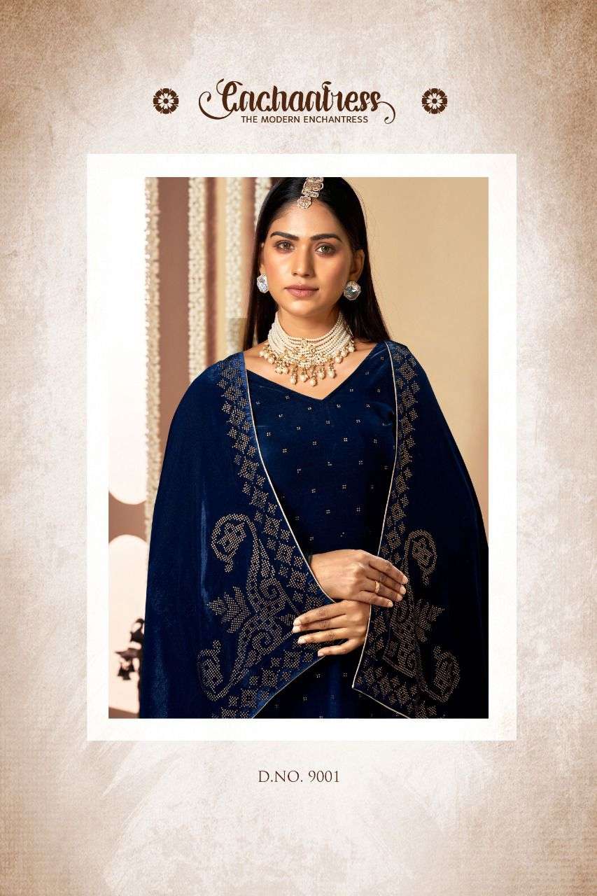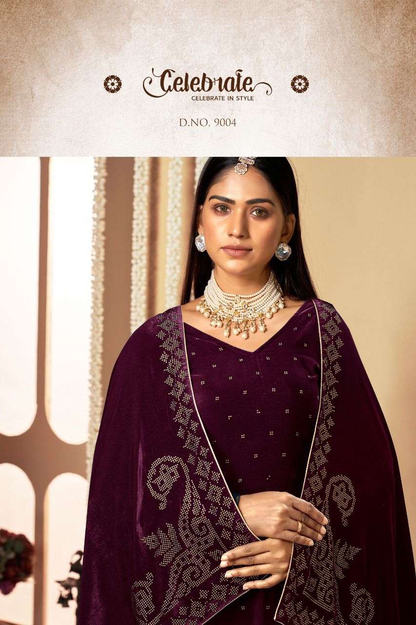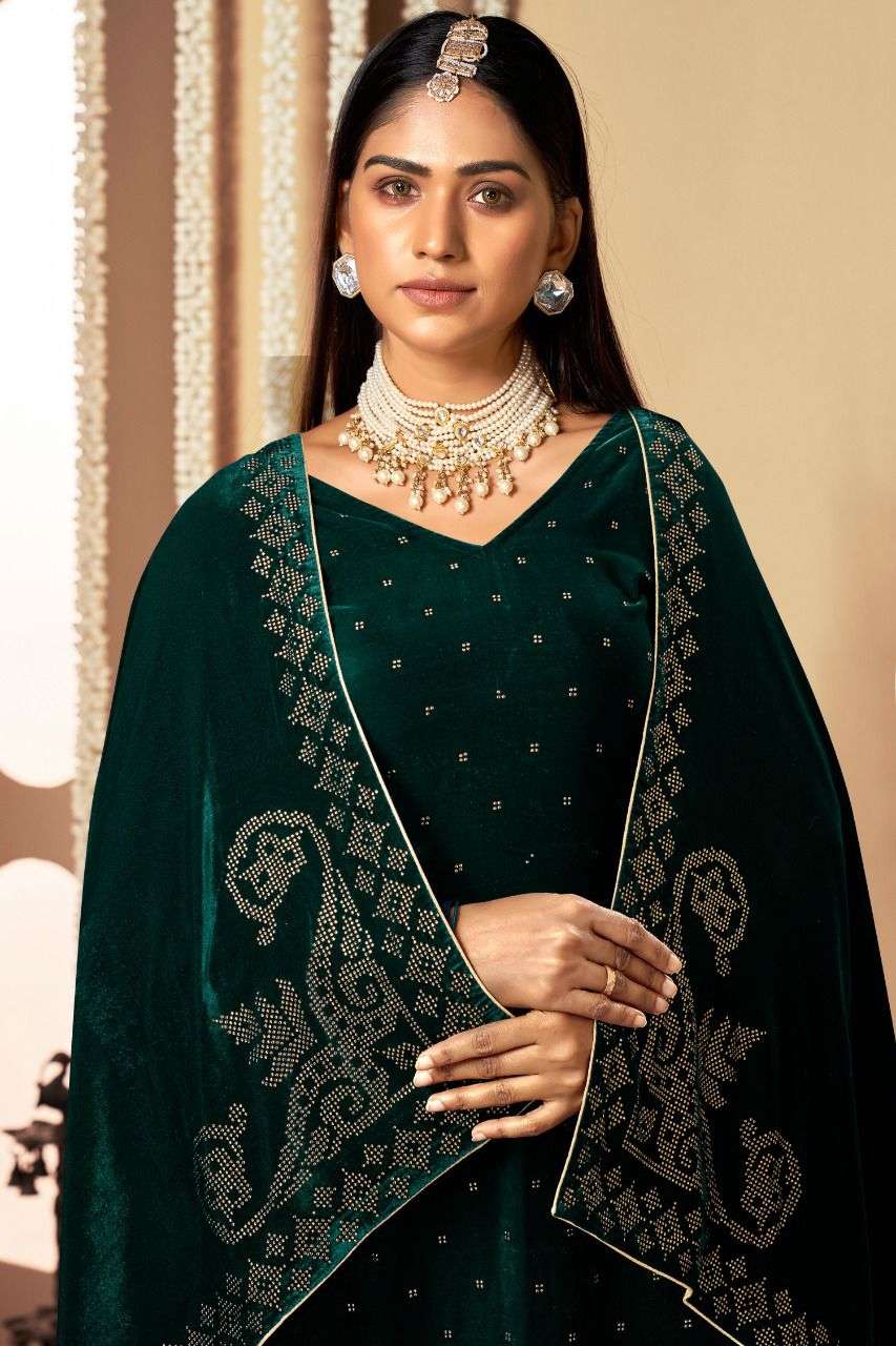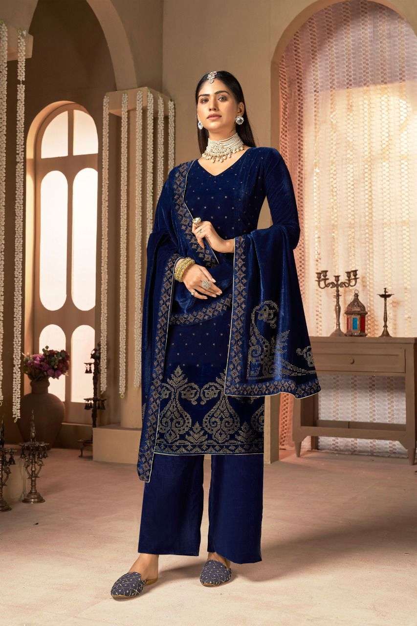 *BIPSON PRINTS PVT LTD * *TOP :PURE VISCOSE Velvet Dyed With Siroski Work 2.5 MTR BOTTOM Pure VISCOS Pashmina Dyed 2.5 MTR DUPATTA :- _ Pure Velvet Dyed with SIROSKI Work 2.25 MRT *@ 1445 /- * |