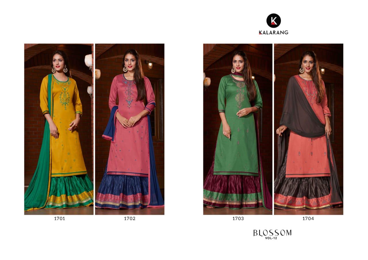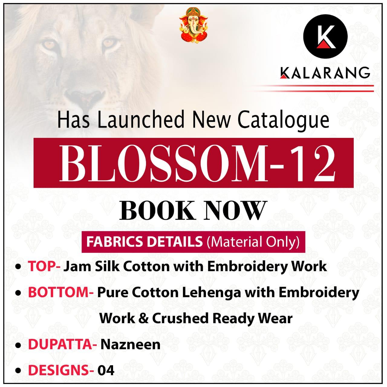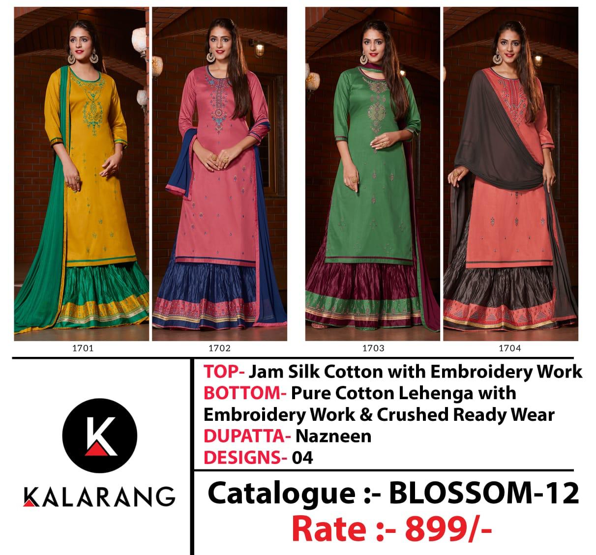 📌 KALARANG has launched Catalog name : * BLOSSOM VOL-12* 🔸 Fabric Details 🔸 👚Top:- Jam Silk Cotton With Embroidery Work 👖Bottom:- Pure Cotton Lehenga With Embroidery Work & Crushed Ready Wear 🧣Dupatta:- Nazneen 👜Total Design:- 4 Rate 899 per pcs . Set to set . GST 5 Percent Extra. ⏰Dispatching 5 to 6 days later |
