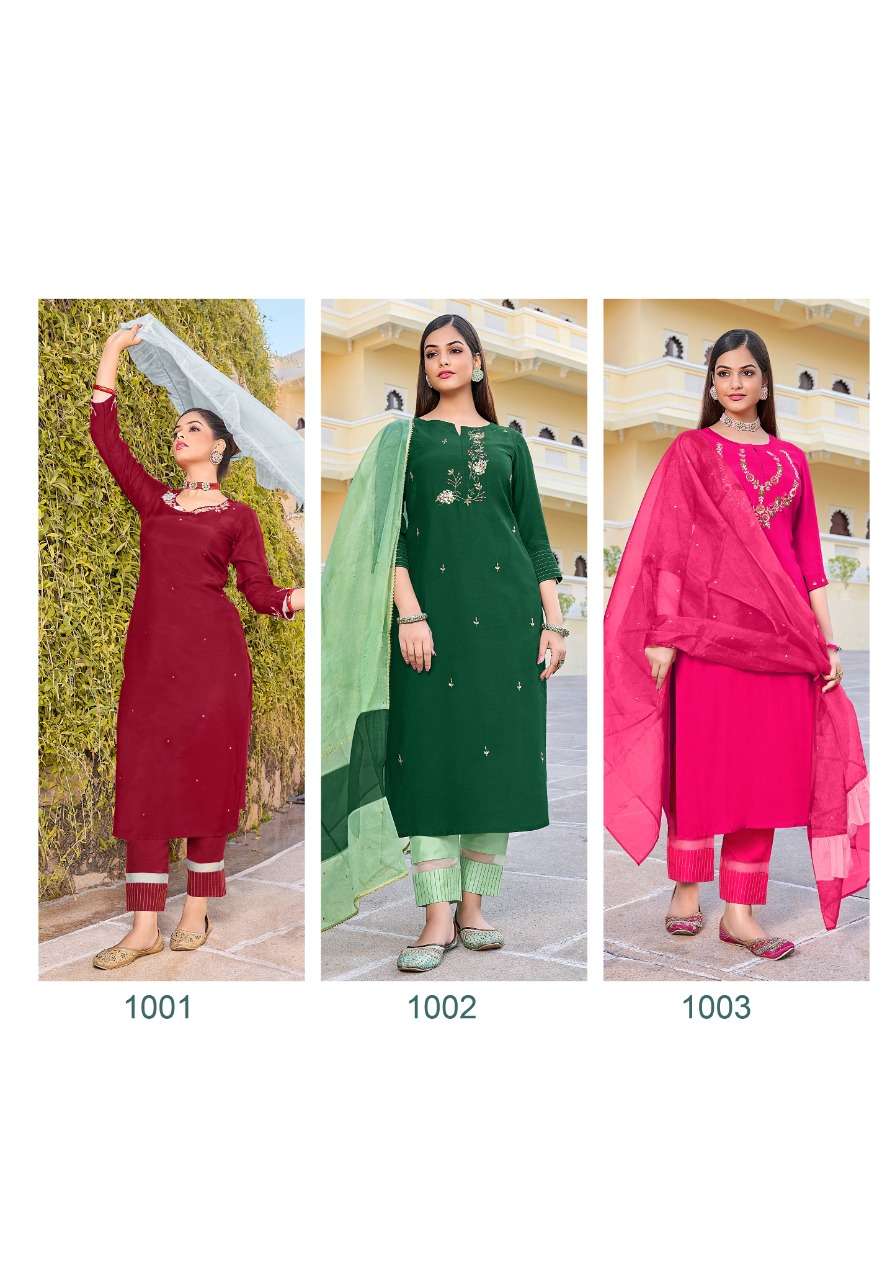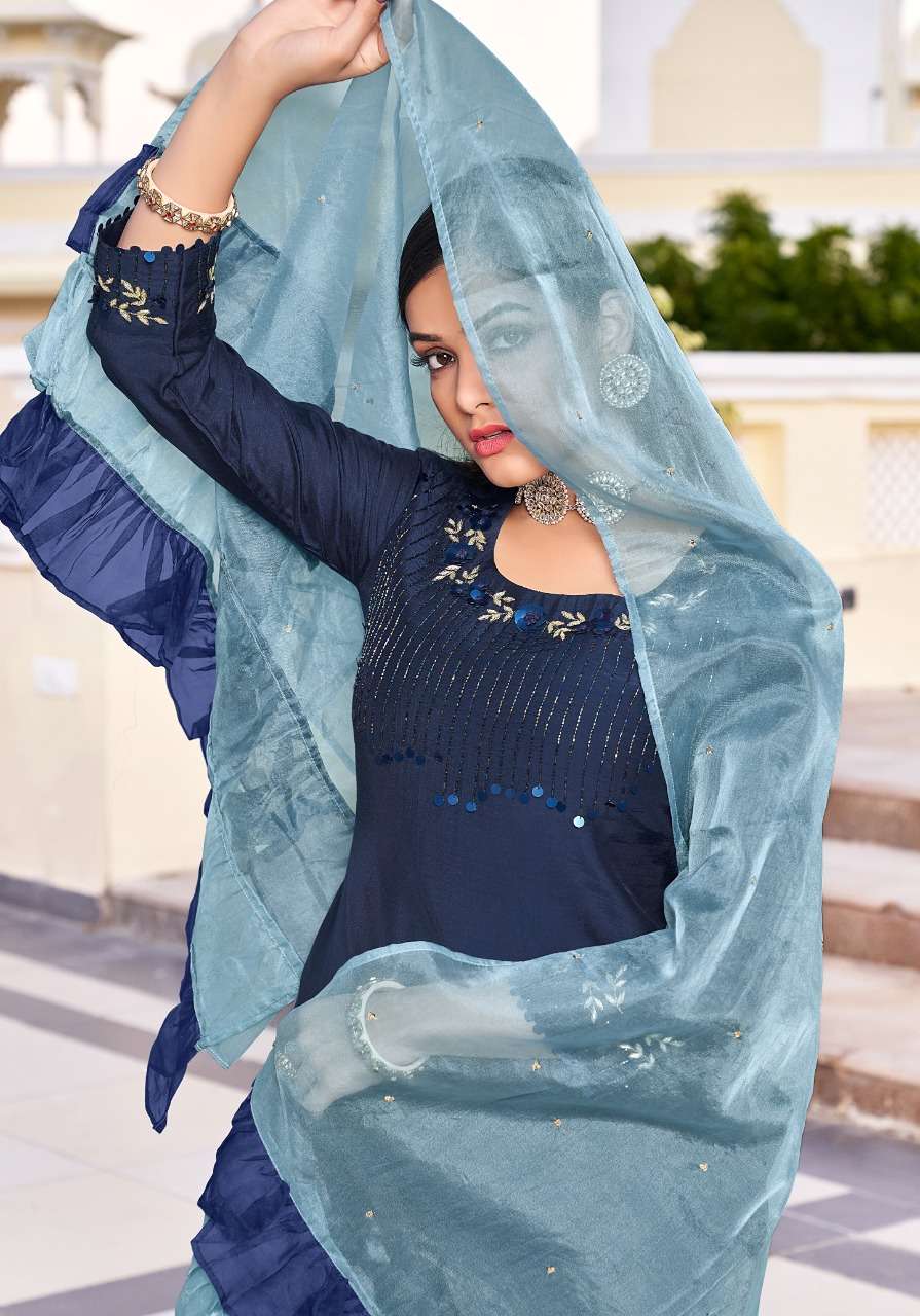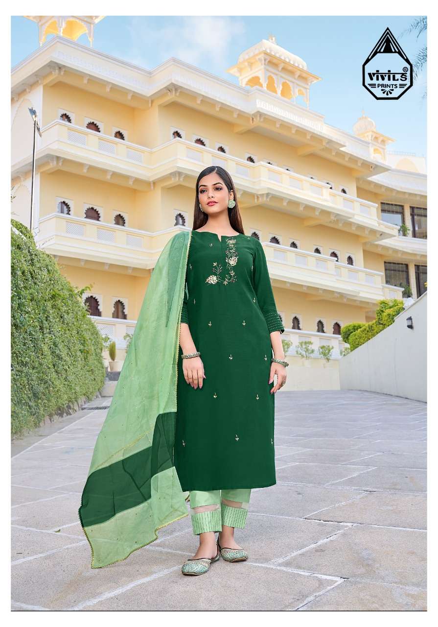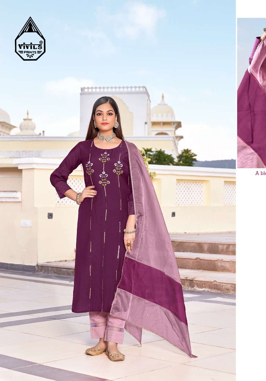 Vivils silk mills Pvt LTD Catlouge Name - BLOSSOM VOL 2 KURTI + PANTS + DUPPATA Fabric - ROMAN SILK ( PURE SILK ) DUPPATA - PURE VISCOSE WITH FOIL + BORDER WORK - PURE HANDWORK Length - 47 inches Price - 1195 /- + G.S.T Quantity - 5 PCS |