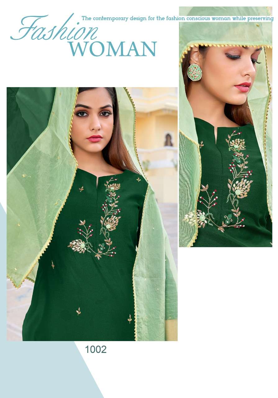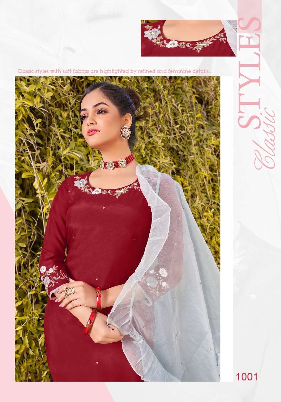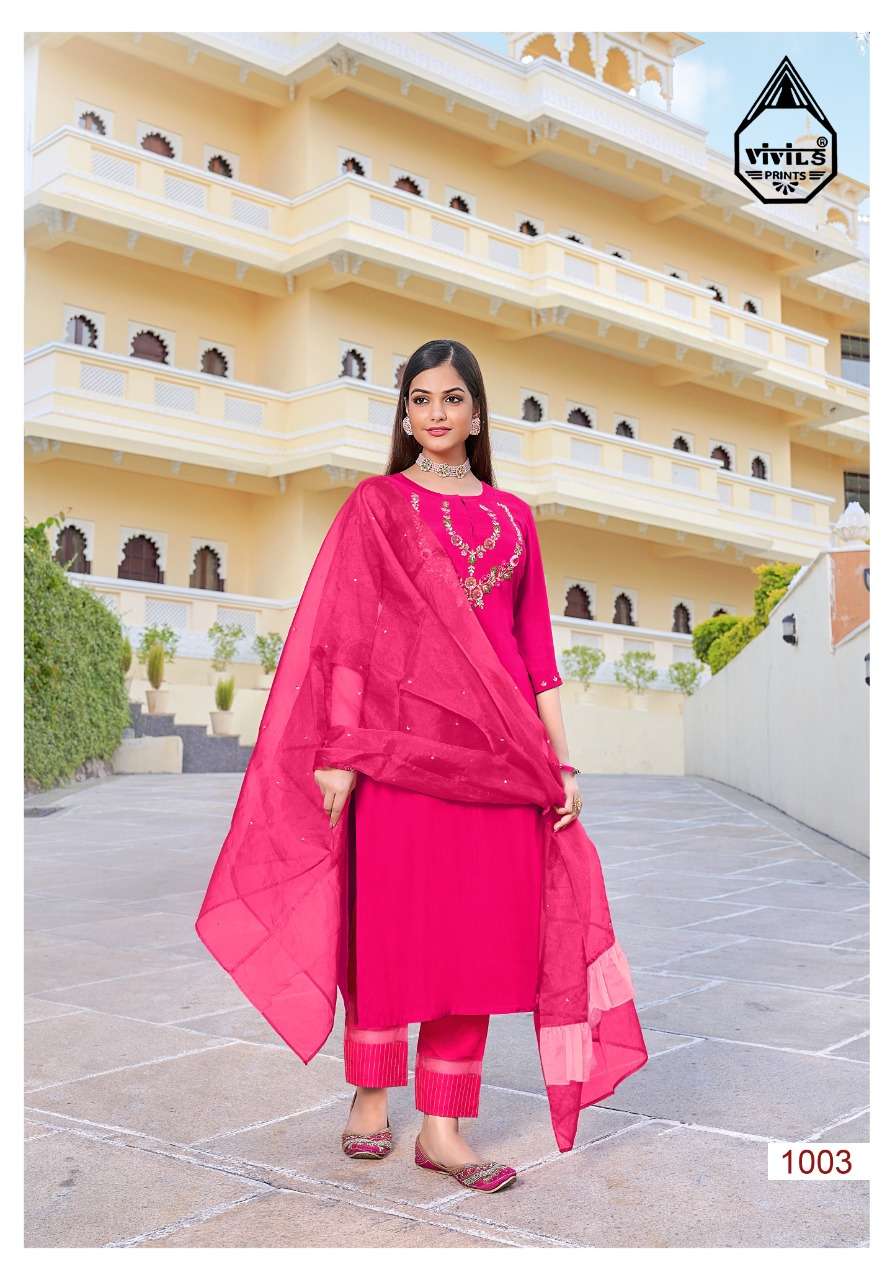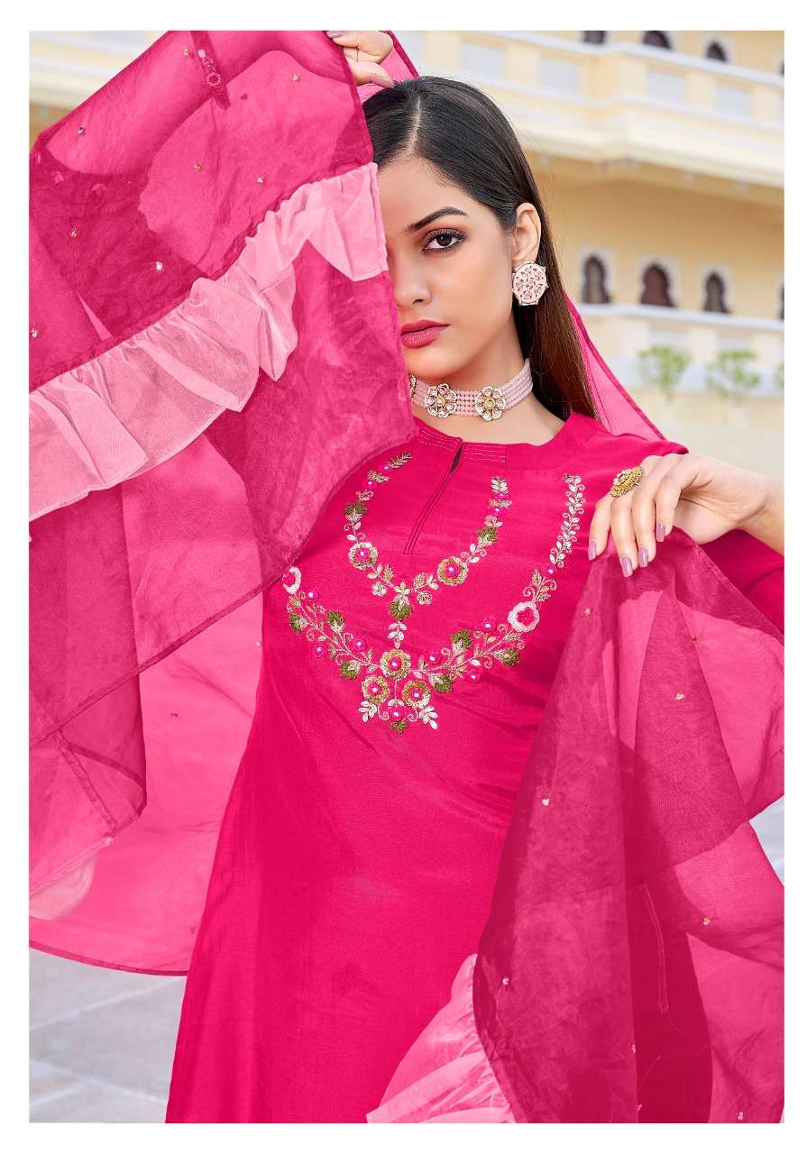 Vivils silk mills Pvt LTD Catlouge Name - BLOSSOM VOL 2 KURTI + PANTS + DUPPATA Fabric - ROMAN SILK ( PURE SILK ) DUPPATA - PURE VISCOSE WITH FOIL + BORDER WORK - PURE HANDWORK Length - 47 inches Price - 1195 /- + G.S.T Quantity - 5 PCS |