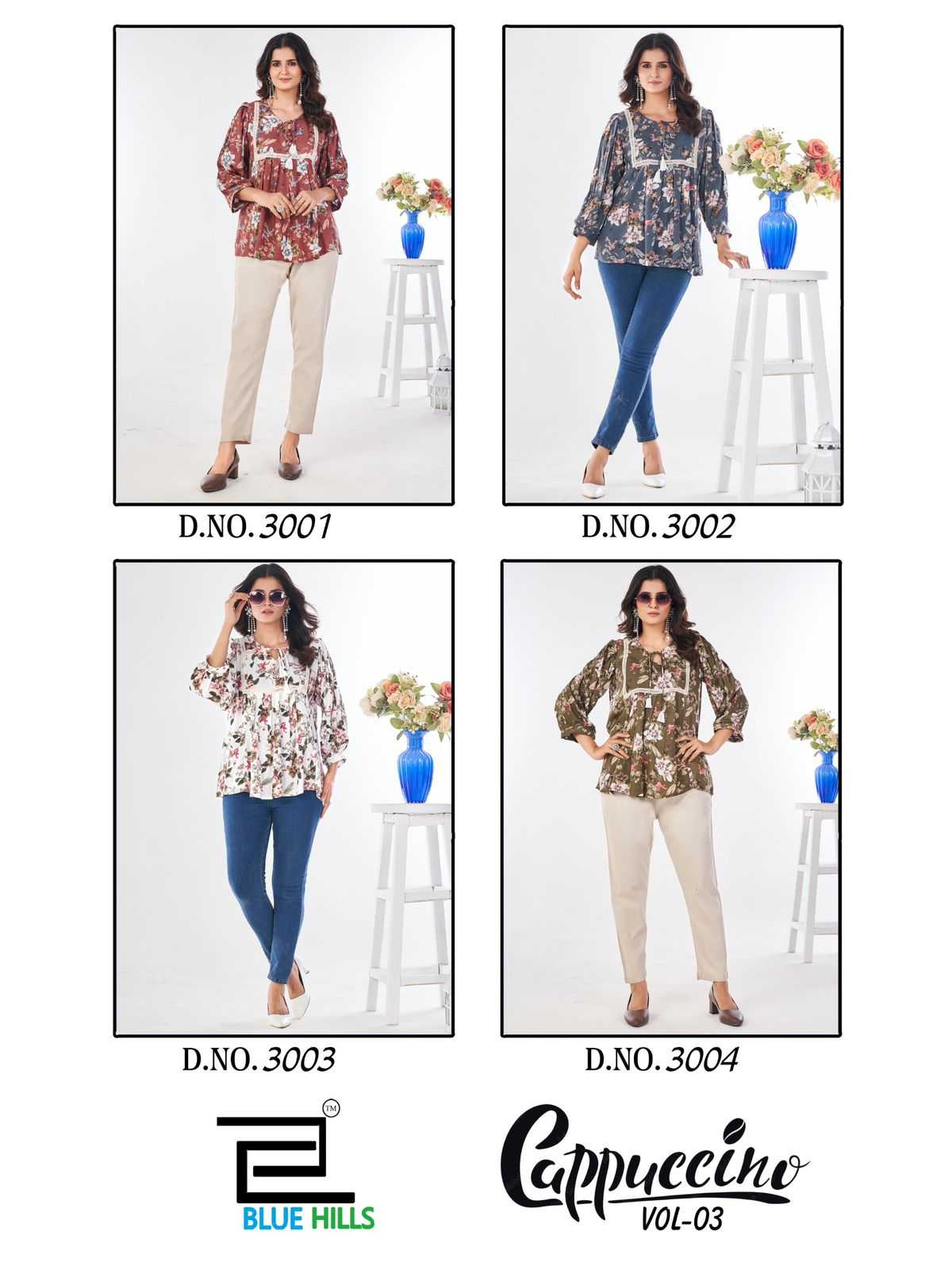#BLUE HILLS (KURTI) We are introducing OUR new catalog 📕Catalogue:☕️☕️CAPPUCCINO. Vol 3 ☕️ 👗CLOTH:- *HEAVY wrinkle RAYON print 14kg Length 32 Rate - ~ 350 +GST 4 beautiful colors |