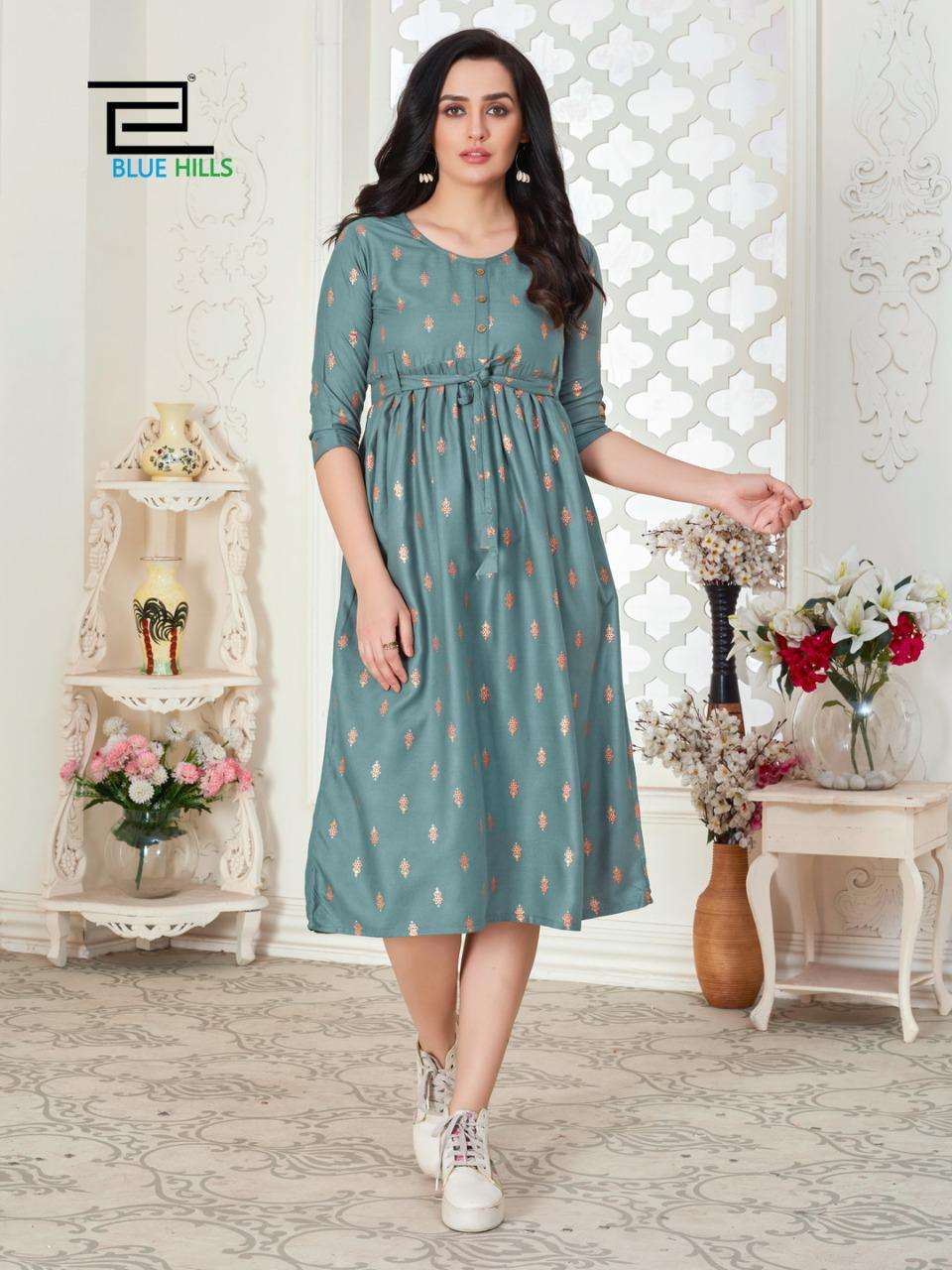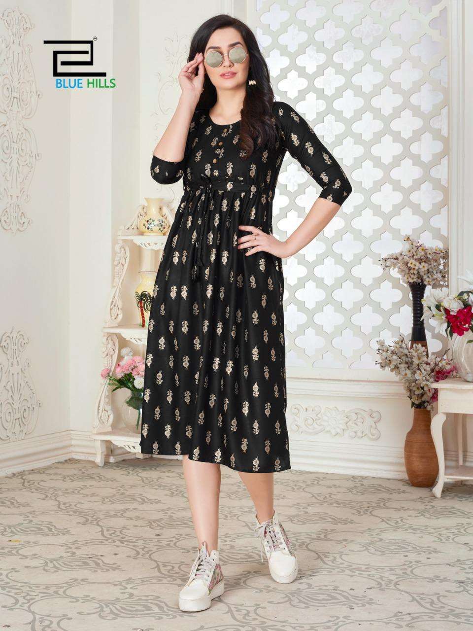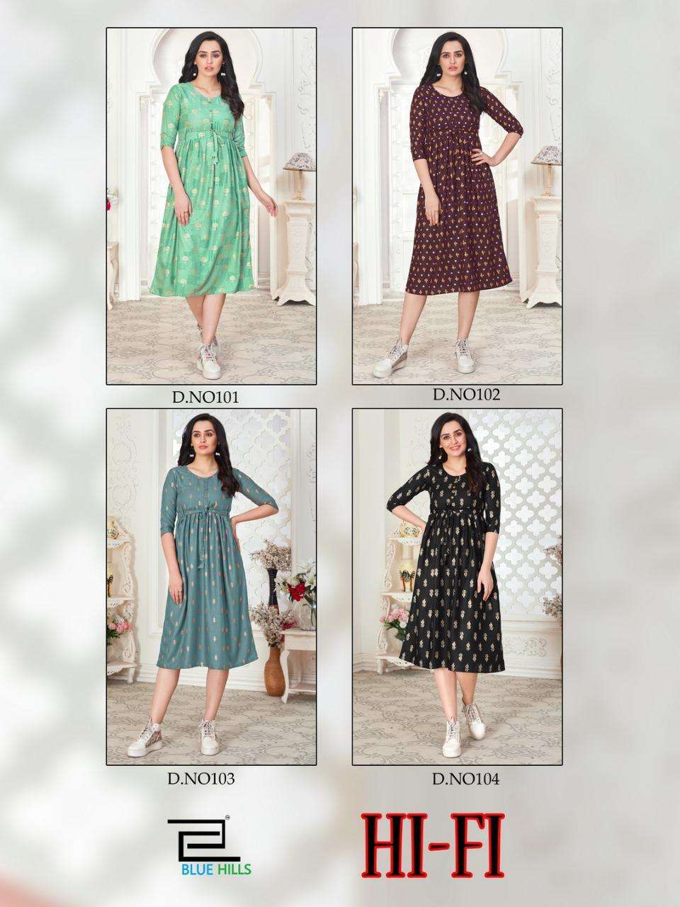 Brand name BLUE HILLS Catalogue name - HI FI Fabric rayon 14 kg with gold print Size M L XL XXL Length 45 Rate 399+GST Set to set . |