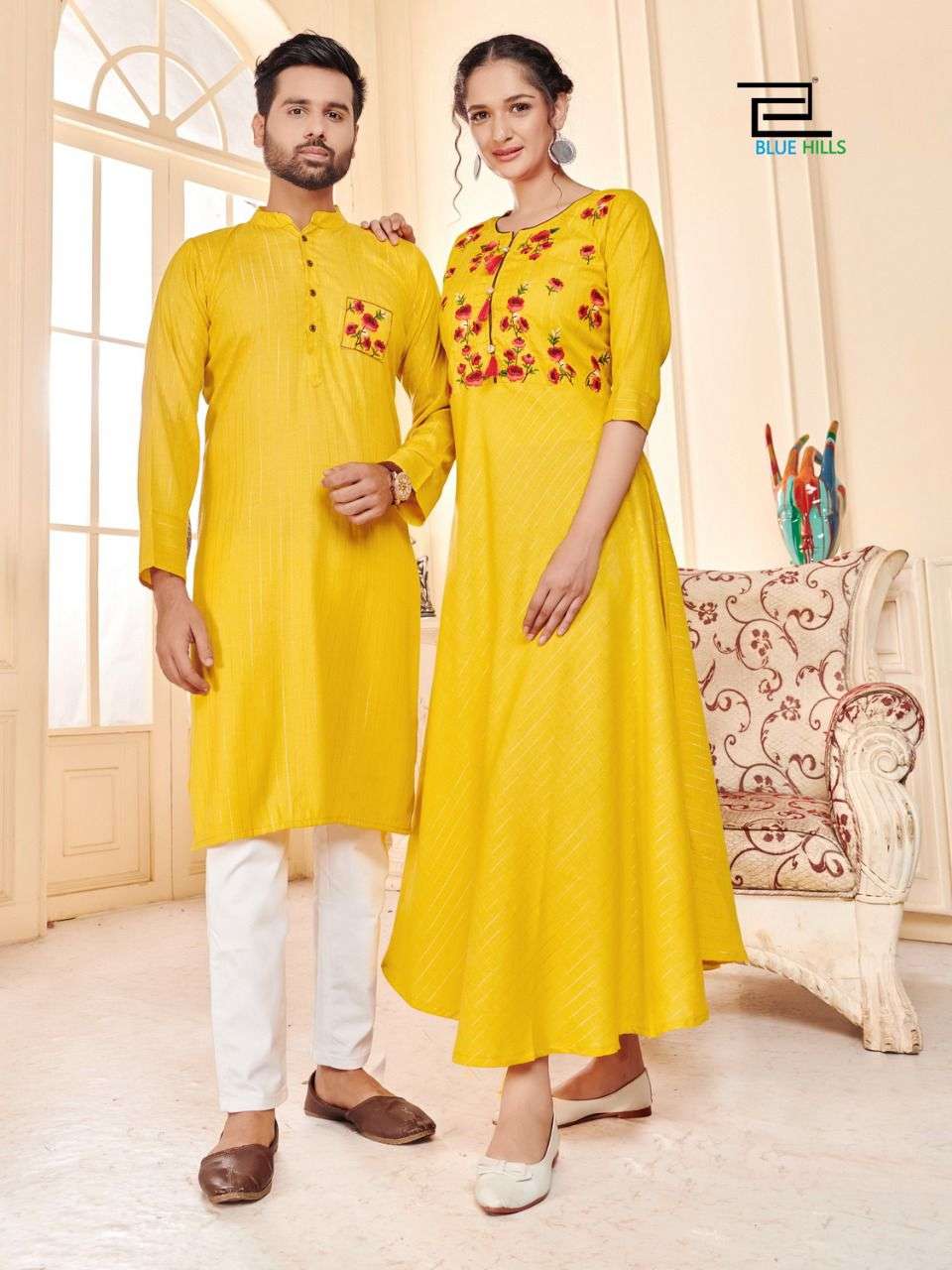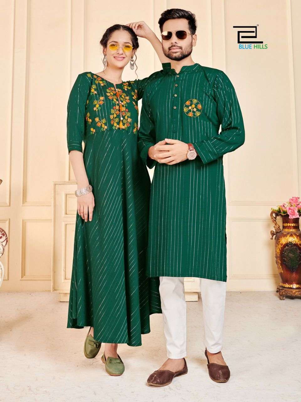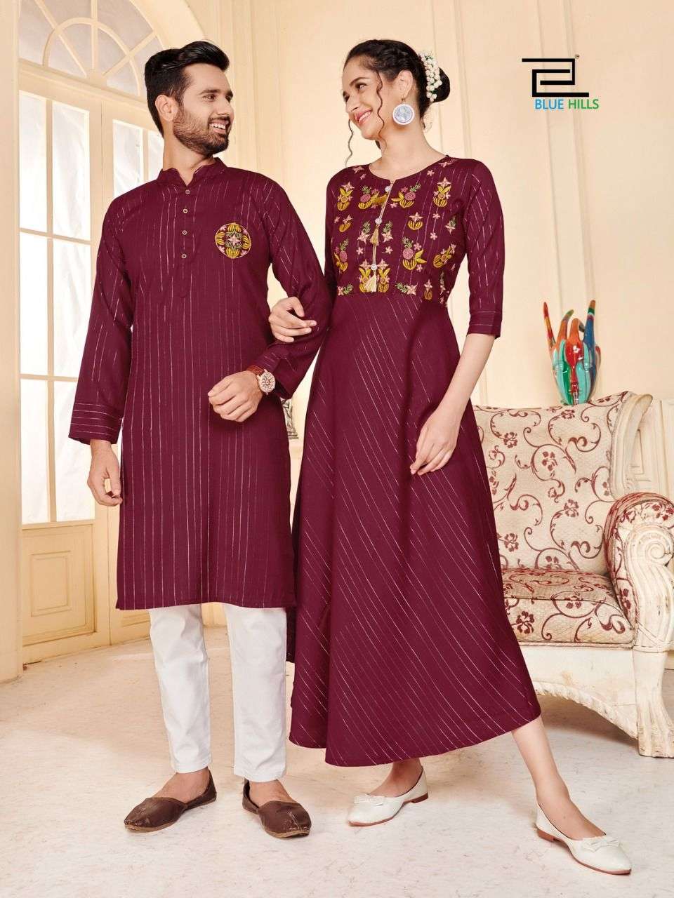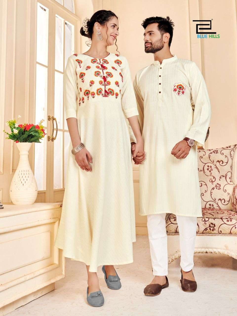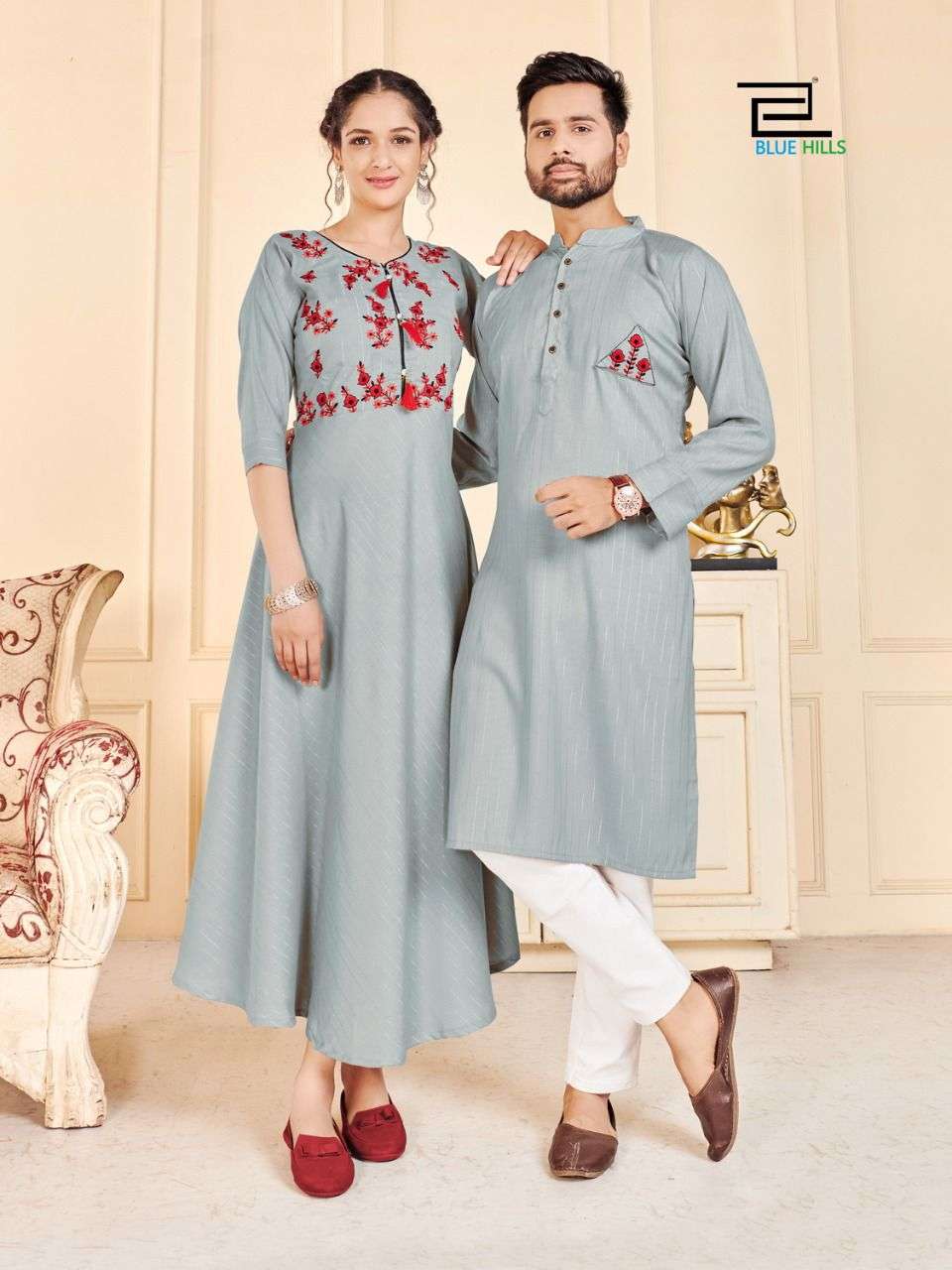 Blue Hills  Present-husband and wife combo Catalogue Name : LOVE BIRDS â Fabric-: RAYON LUREX Concept- partywear combo with Classic embroidery work Kurti-: women ( gown lenght 50) Size :- M(38), L(40), XL(42), XXL (44)*3Xl (46) Kurta:- men (length 42 ) 38 40 42 44 46 COMBO RATE - 795+GST ( size optional) 8 Beautiful design Dispatch tomorrow |