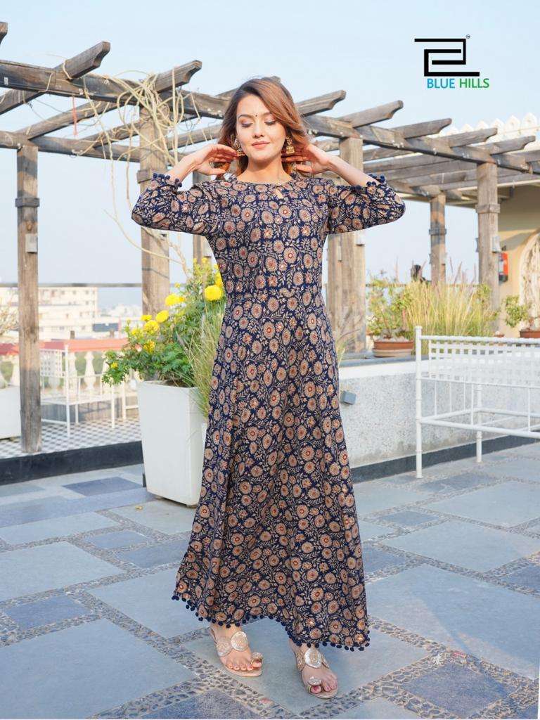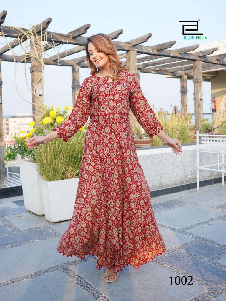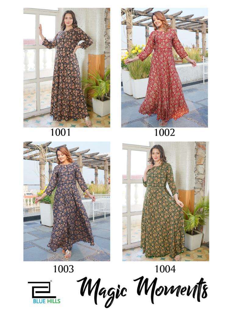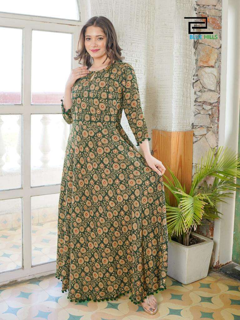 blue hills magic moments rayon foil print flair style kurtis best supplier in surat