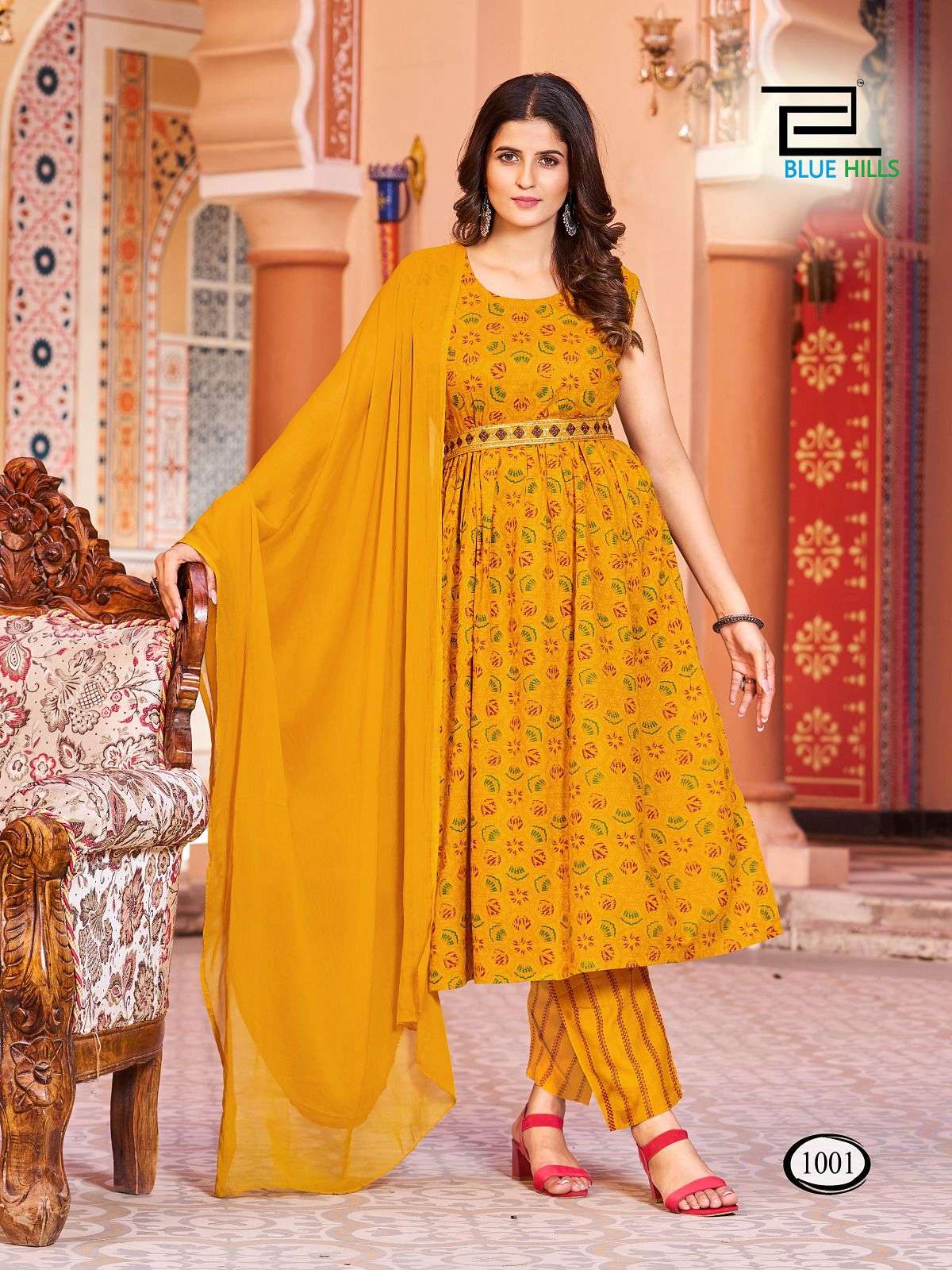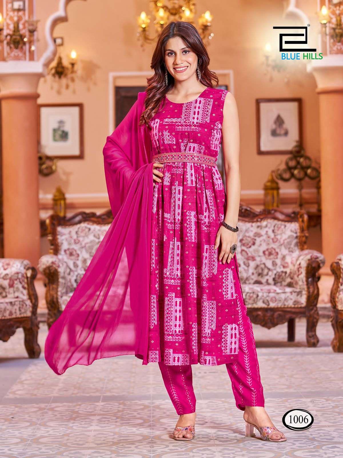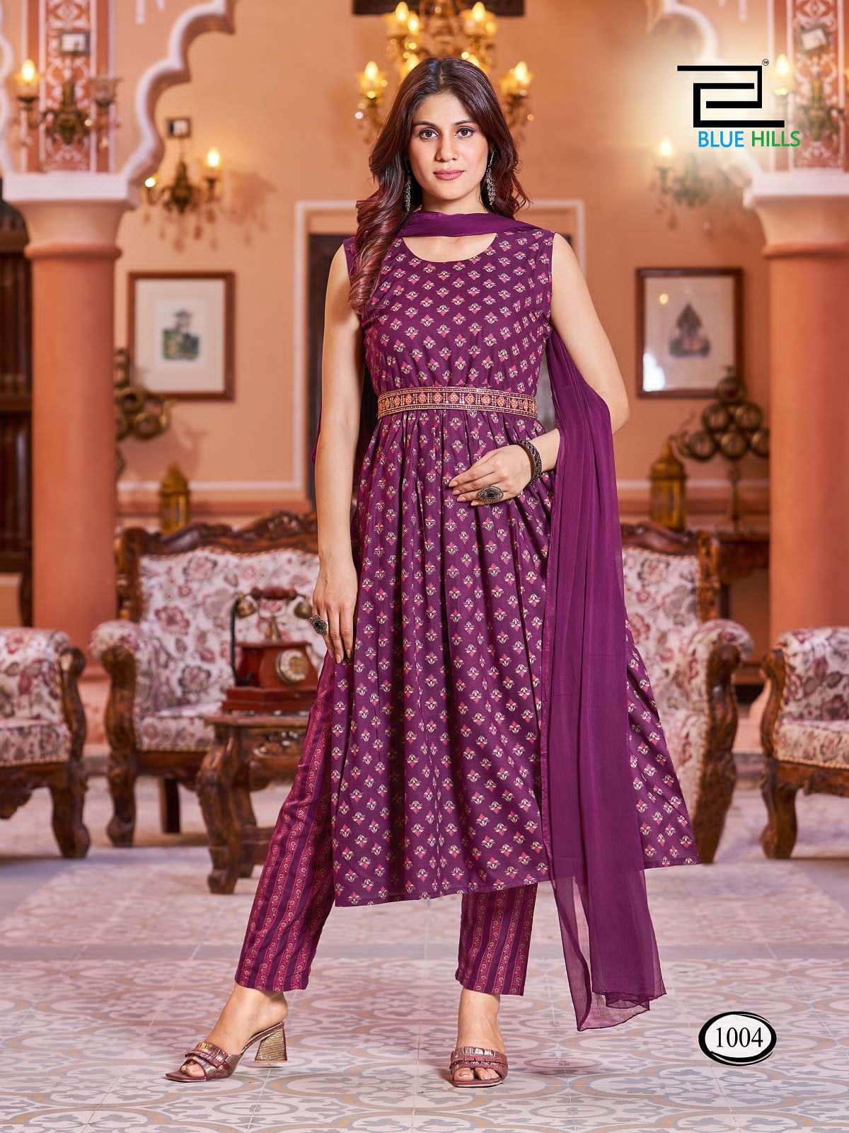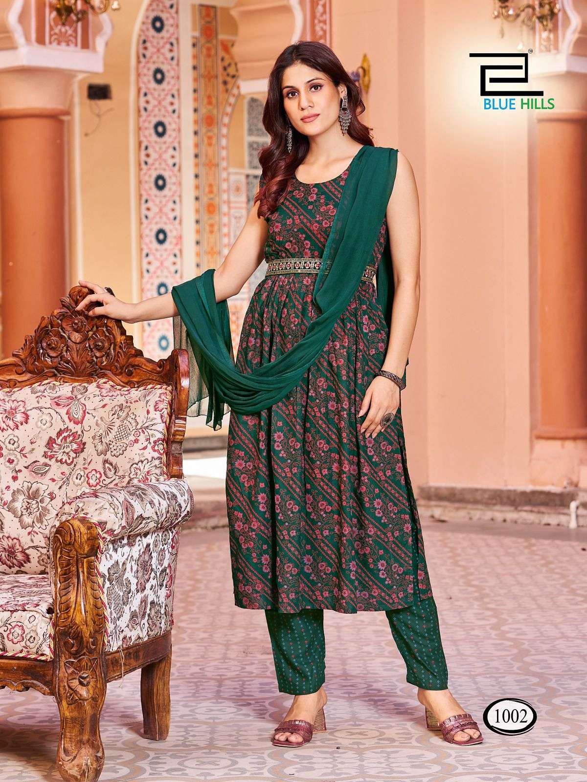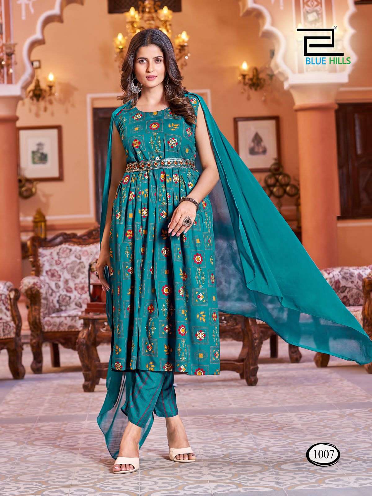blue hills paradise designer nayra style kurti with work belt and pant dupatta