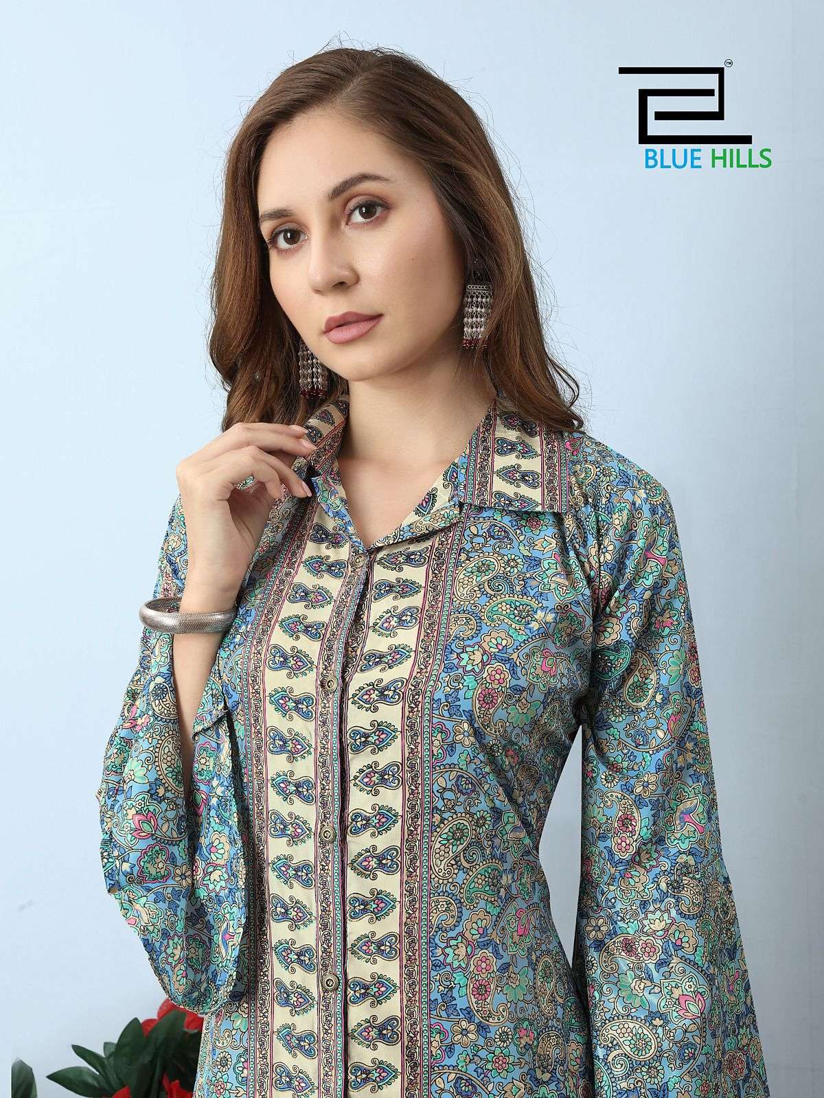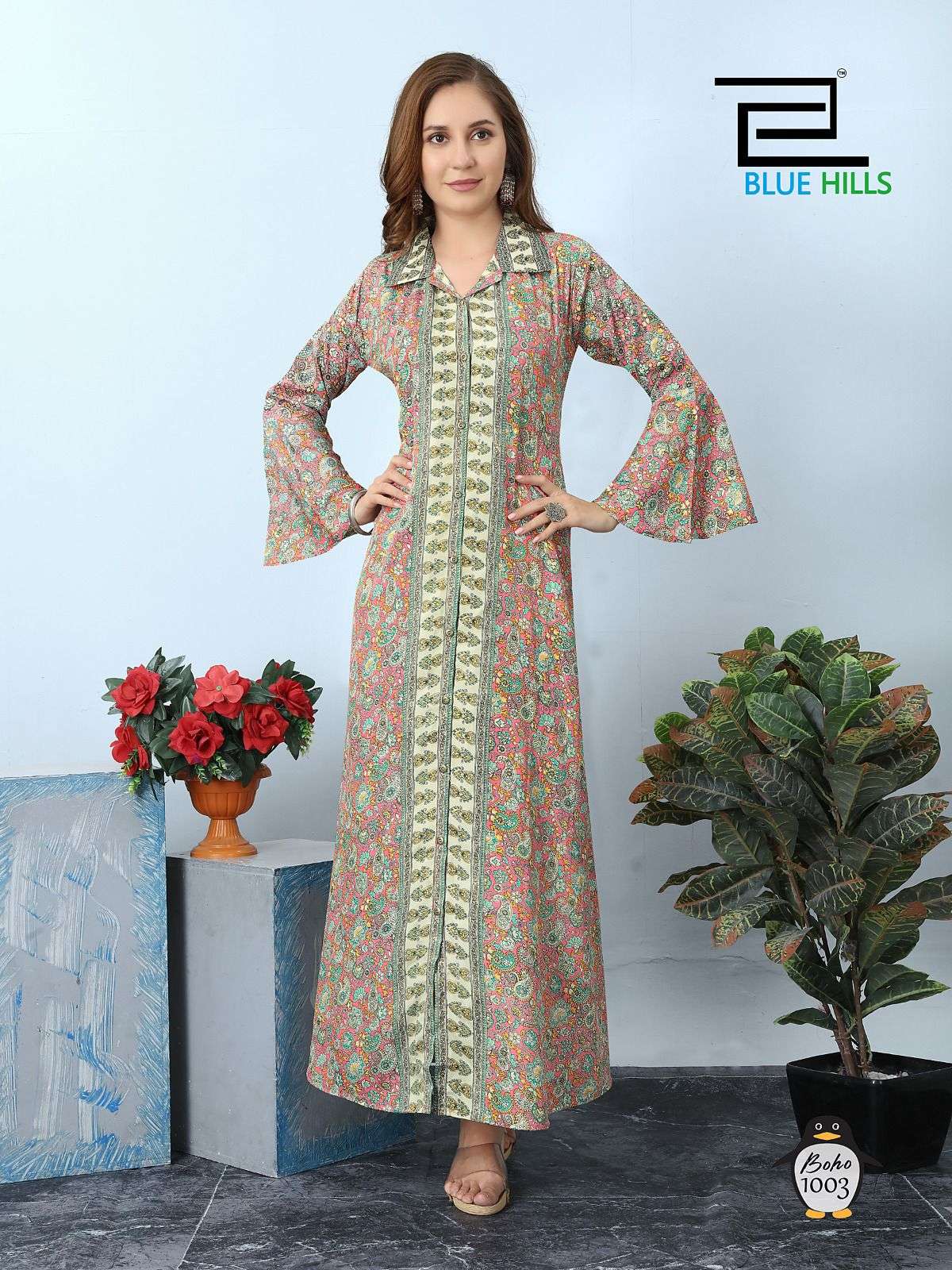 blue hills present boho fancy front open long stitch kurtis wear in two style