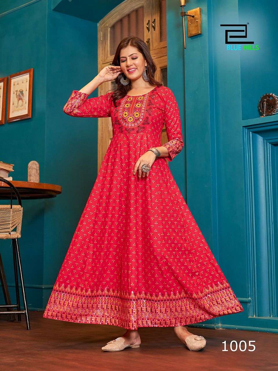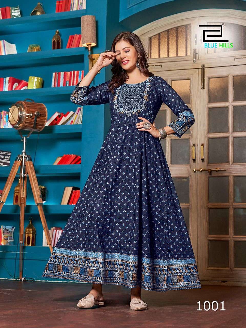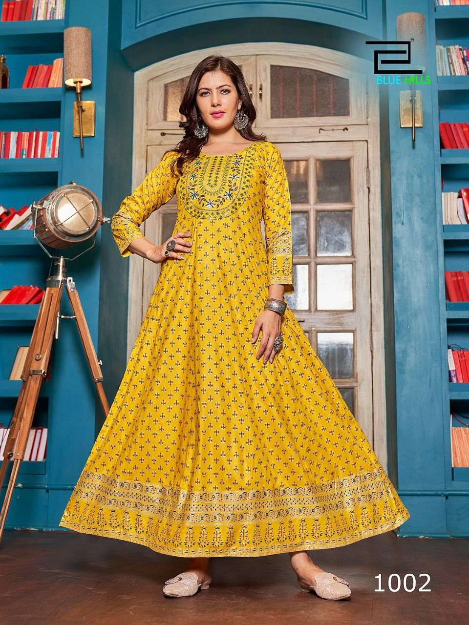 blue hills present cheese rayon anarkali gown plus size big size gown collection