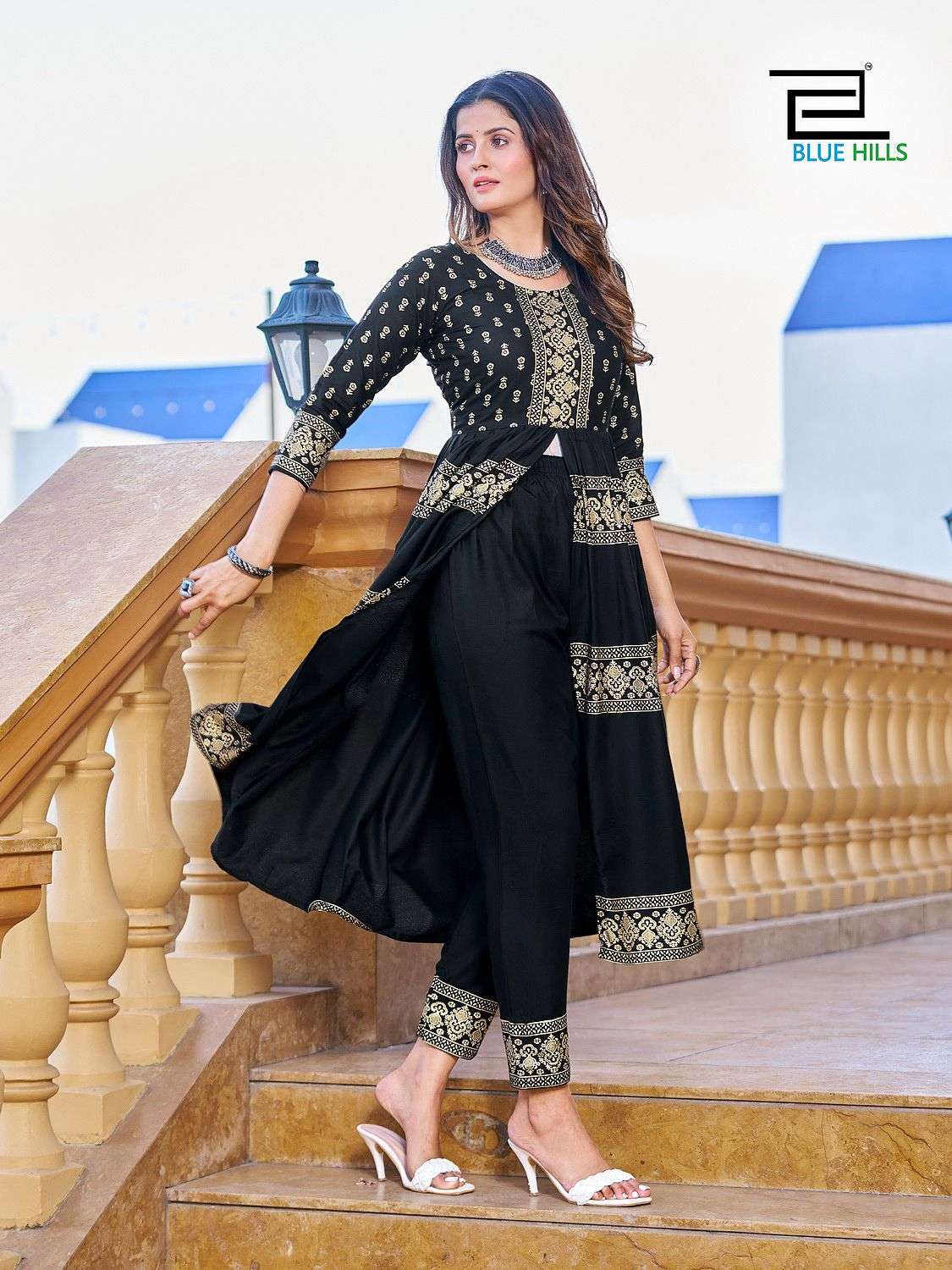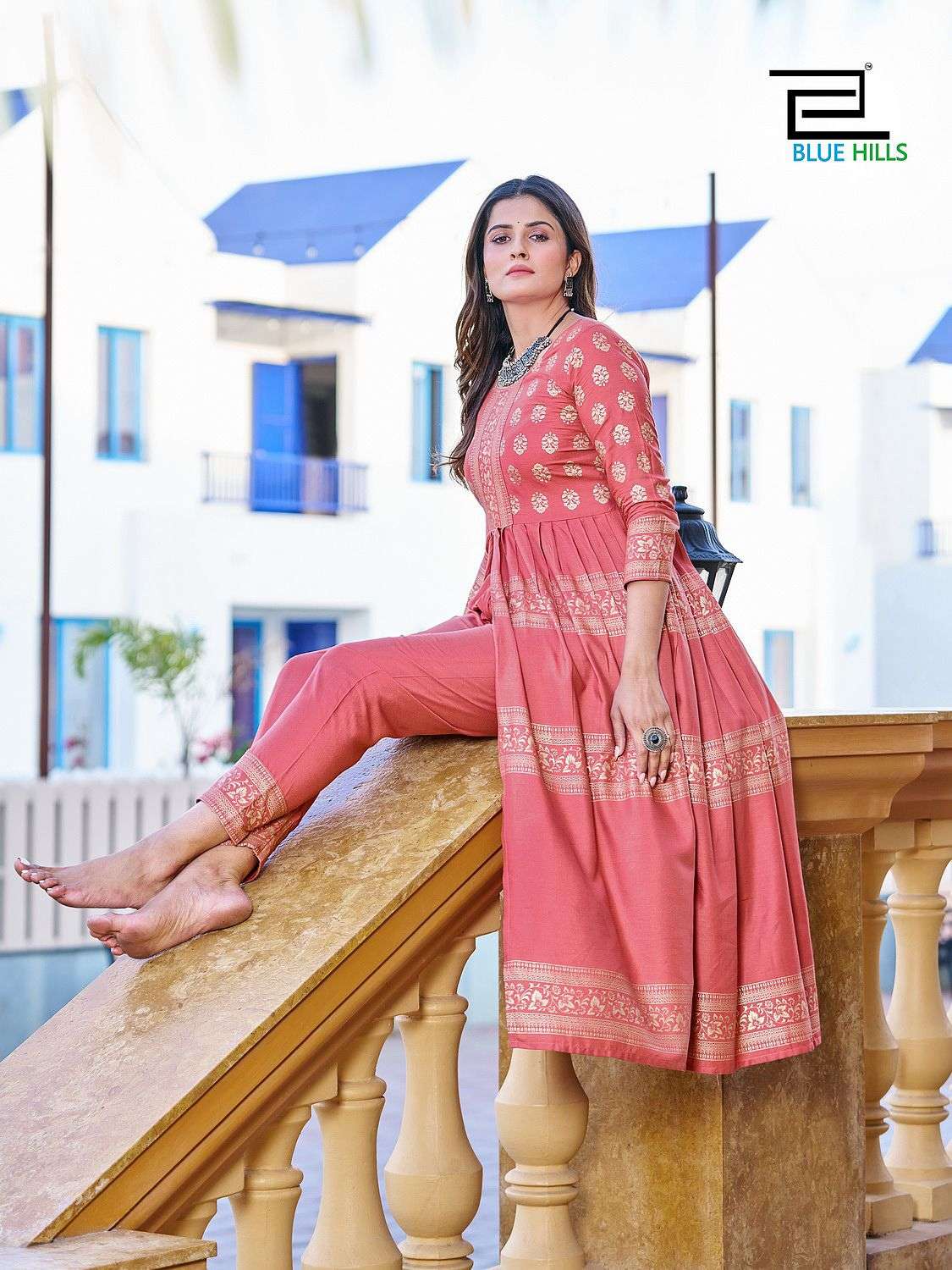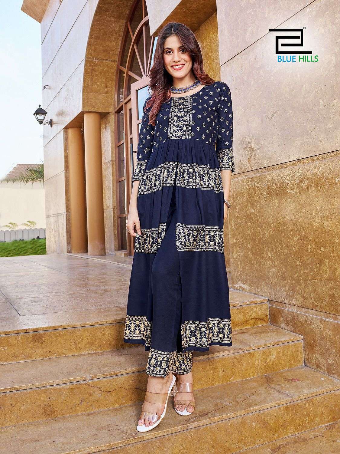 blue hills present maharani foil print centre cut pattern fancy kurti with pant