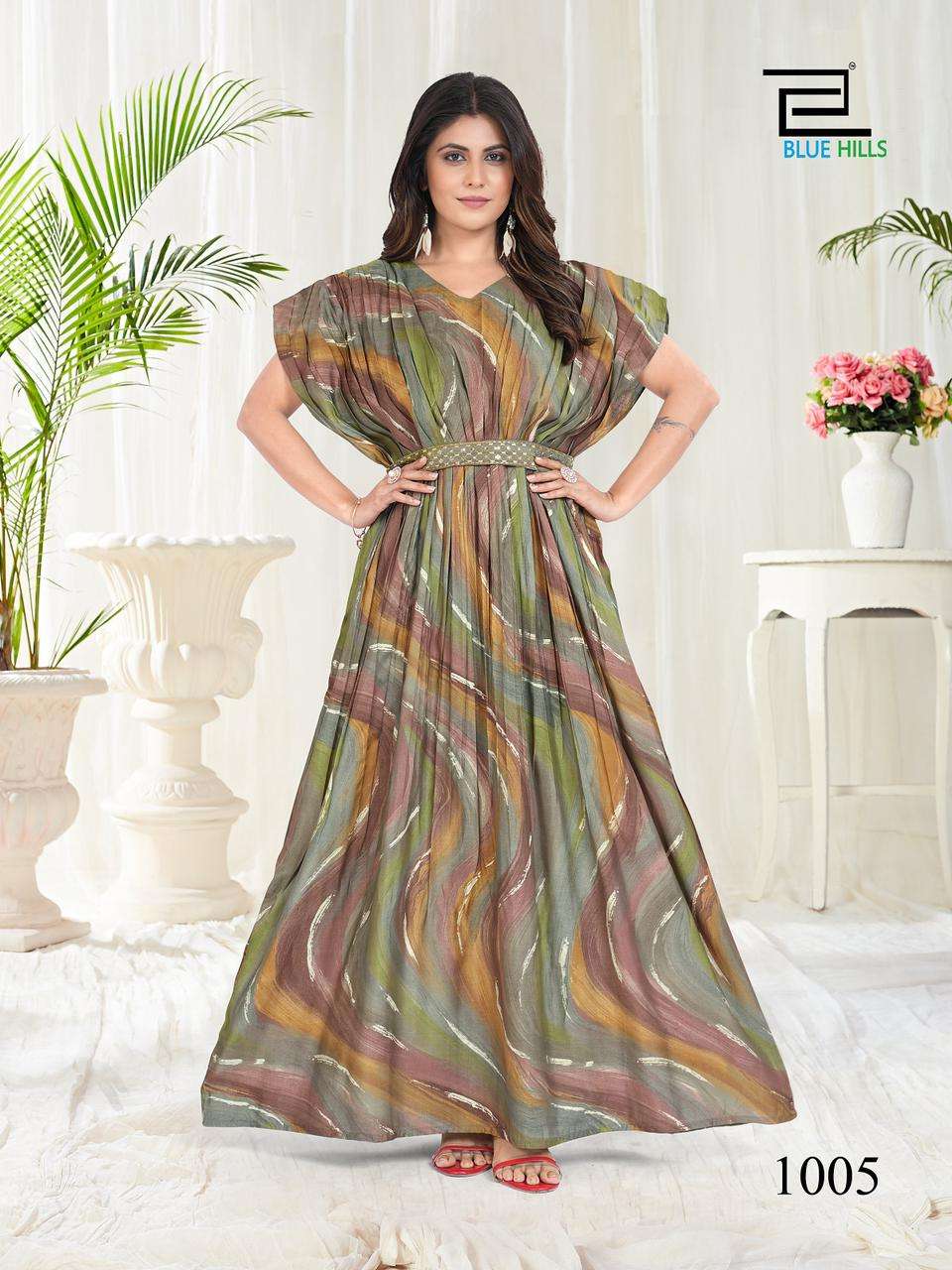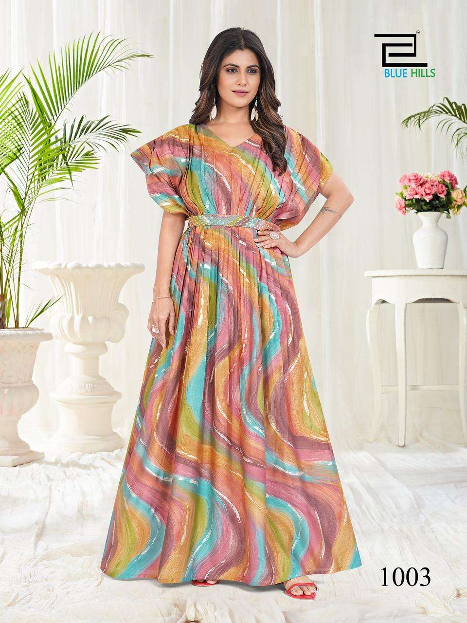 # BLUE HILLS With belt Length - 52+ Size - L (40) XL (42) XXL (44) 5 beautiful prints Rate - 750+GST Dispatch - 2 to 3 days Limited stock |