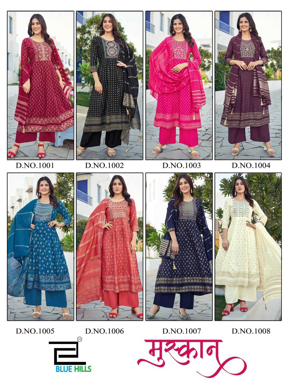 BLUE HILLS We are introducing OUR new catalog 📕Catalogue:- Muskan Concept:- 3pcs With Plazo 👗CLOTH:- Rayon 14kg Foil Print Dupatta:- Jequard Chanderi with latkan ✅ Embroidery Style:- Neck Embroidery Pant - RAYON PLAIN 14 KG PLAZZO Size:- M L XL XXL 3XL 4XL 5XL 6XL 7XL 8XL 9XL 10XL Rate - 995/- per pcs +GST Set to set ▶️ 8 Design CATALOGUE |