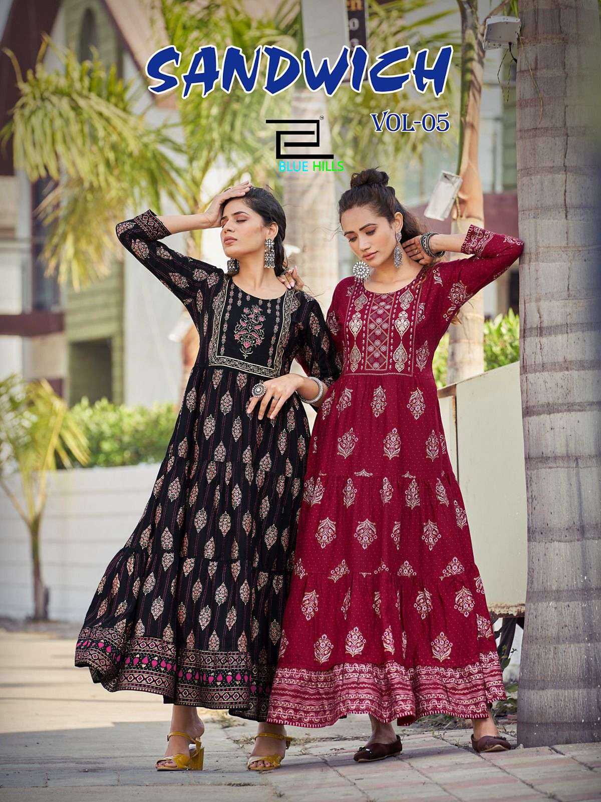 blue hills sandwich vol 5 designer foil print long gown kurtis in plus size