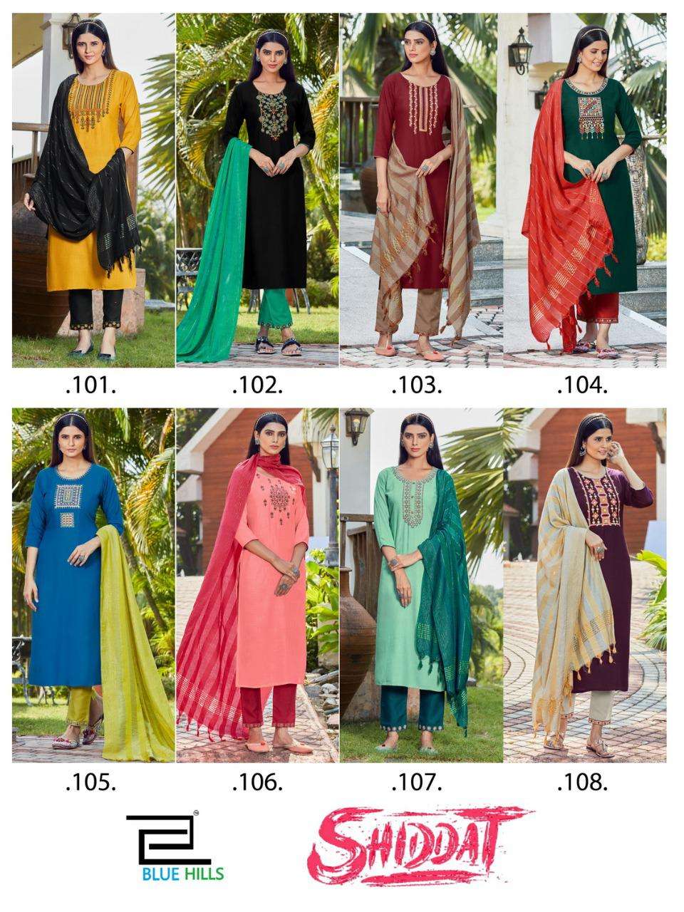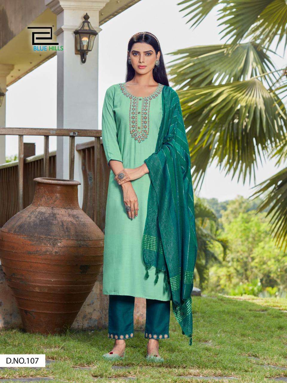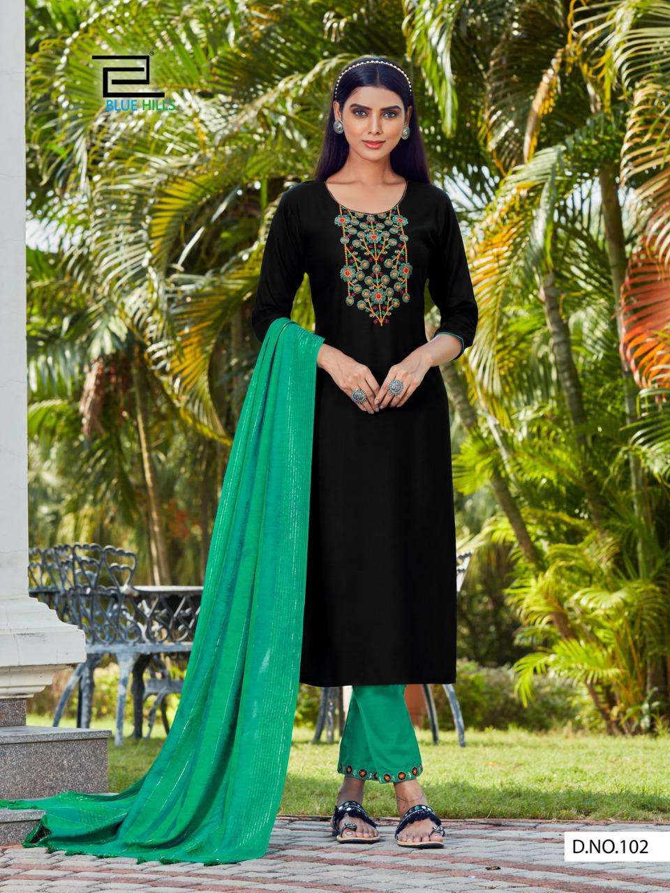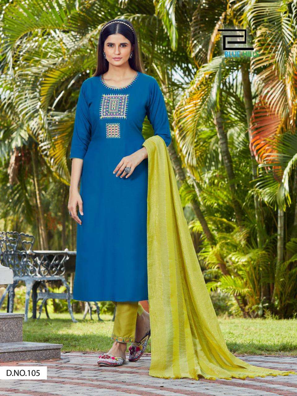 # BLUE HILLS (KURTI) TOP - BOTTOM - DUPATTA SHIDDAT VOL-1 TOP - RAYON SLUB 14kg WITH Embroidery work Bottom - magic slub With embroidery work DUPPATA- fancy viscose duppata Size - M (38) L (40) XL (42) XXL (44) 3XL (46) Rate - 675+GST 8 DESIGNS CATALOGUE Dispatch - Ready |