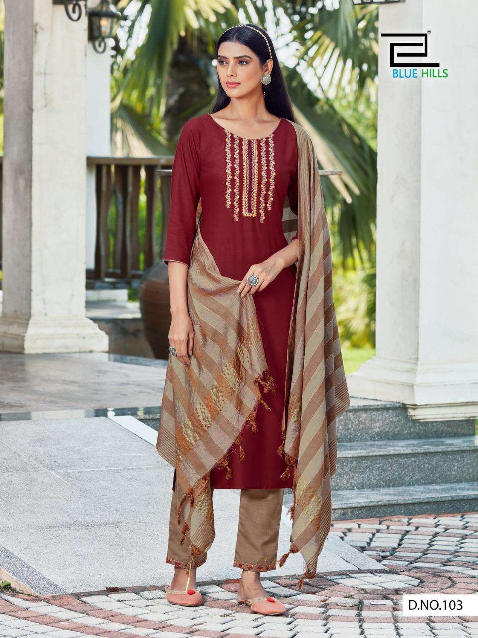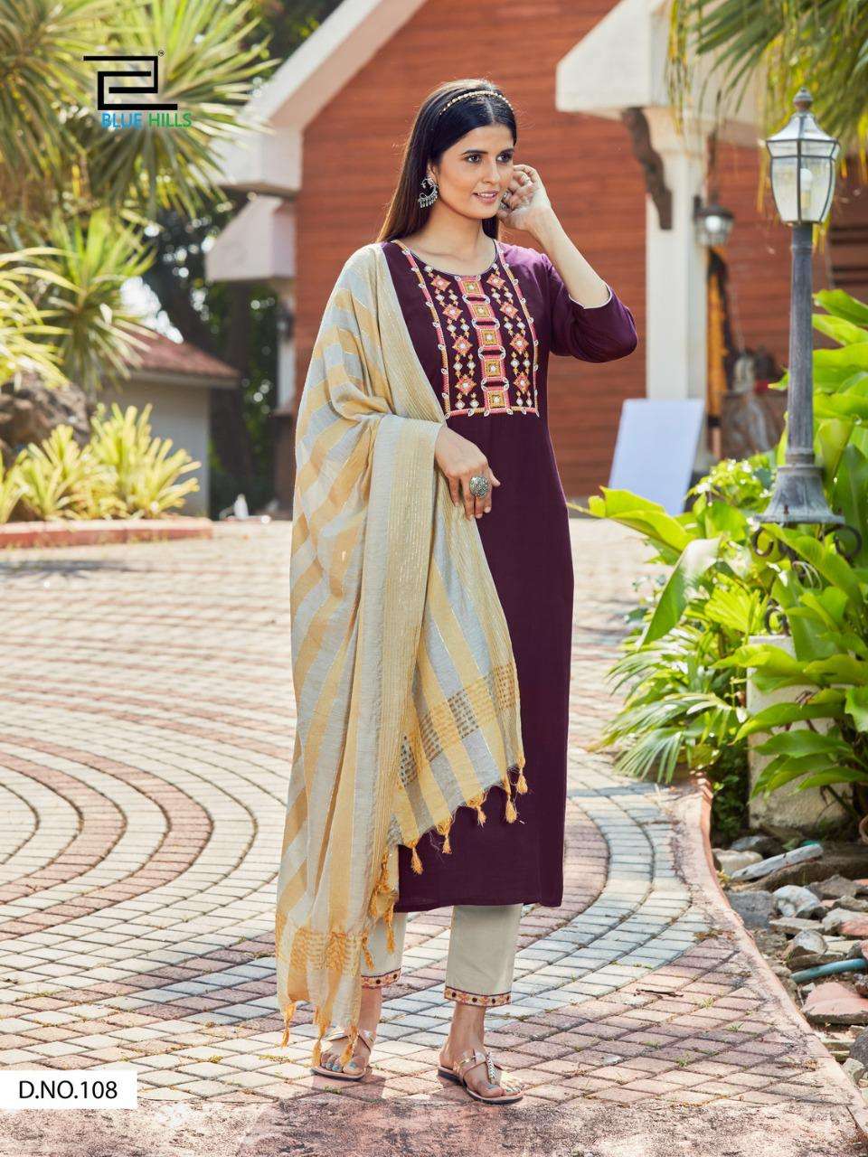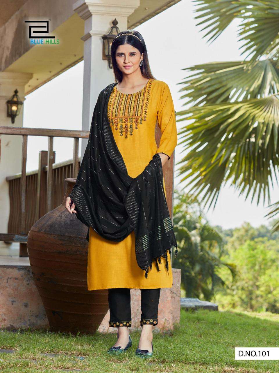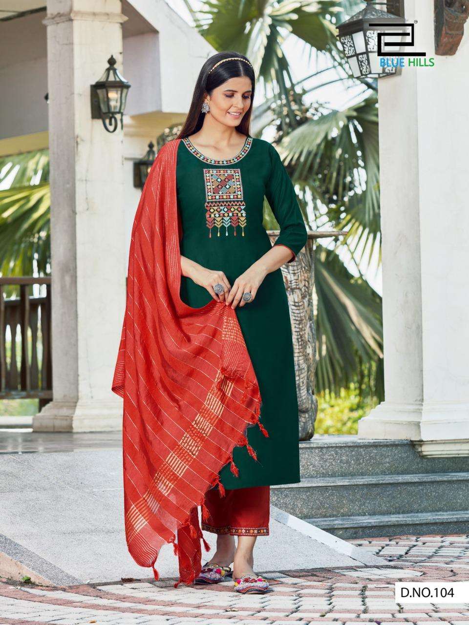 # BLUE HILLS (KURTI) TOP - BOTTOM - DUPATTA SHIDDAT VOL-1 TOP - RAYON SLUB 14kg WITH Embroidery work Bottom - magic slub With embroidery work DUPPATA- fancy viscose duppata Size - M (38) L (40) XL (42) XXL (44) 3XL (46) Rate - 675+GST 8 DESIGNS CATALOGUE Dispatch - Ready |