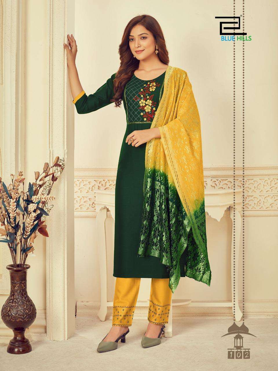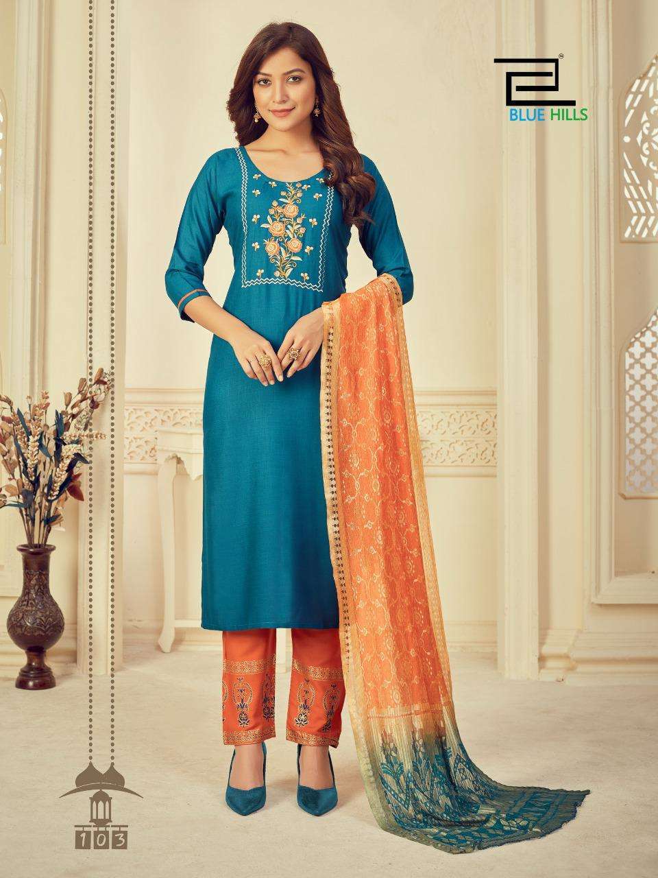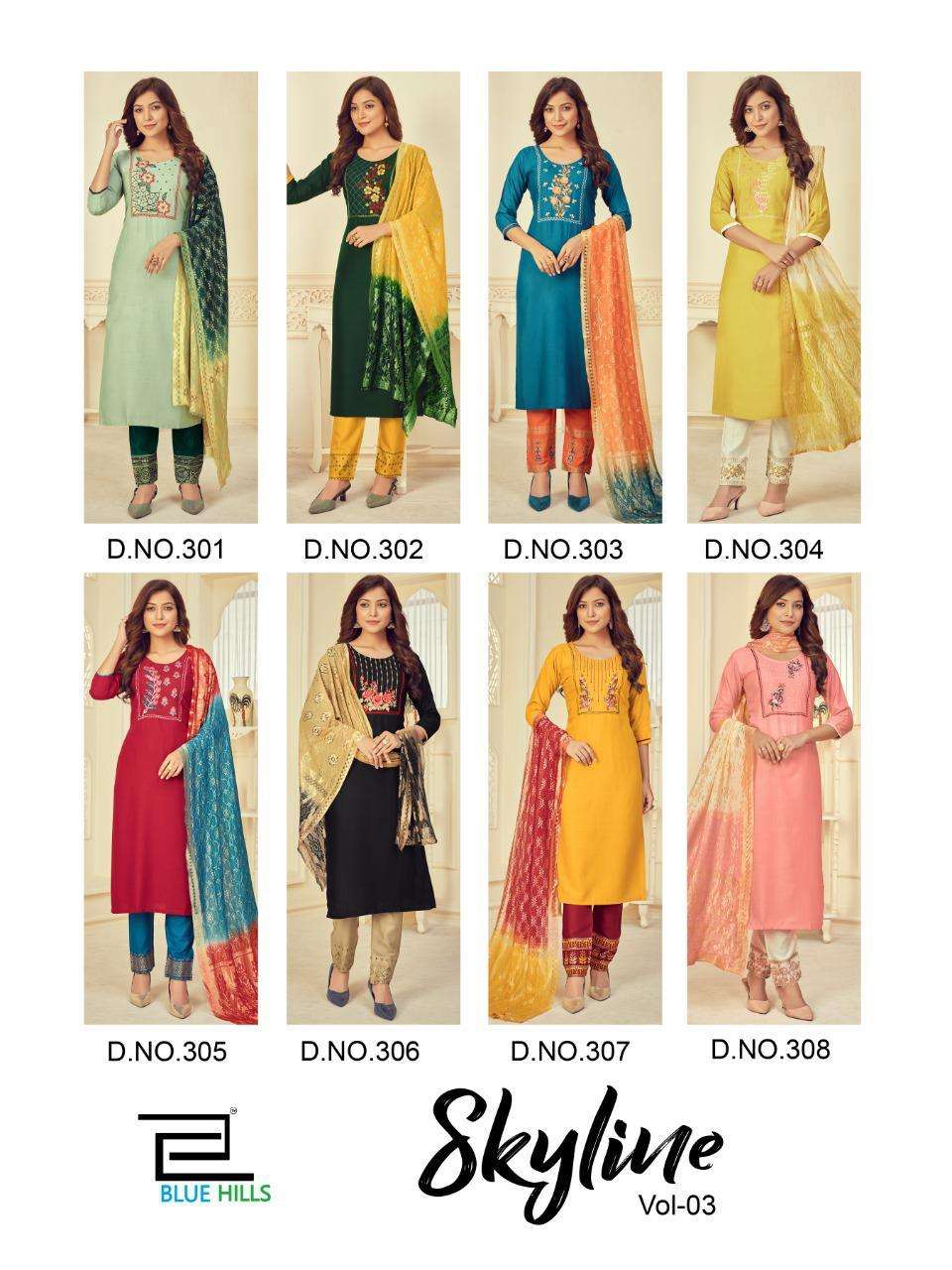 #BLUE HILLS Presents Skyline VOL 3 TOP- BOTTOM -DUPATTA TOP:-RAYON SLUB 14kg WITH Embroidery work Bottom - RAYON 14kg print DUPPATA - fancy duppata - 3PCS CONCEPT Size:- M (38 ) L (40 ) XL (42 ) XXL (44 ) 3XL ( 46 ) Rate - 650+GST Set to set 8 BEAUTIFUL DESIGNS  |