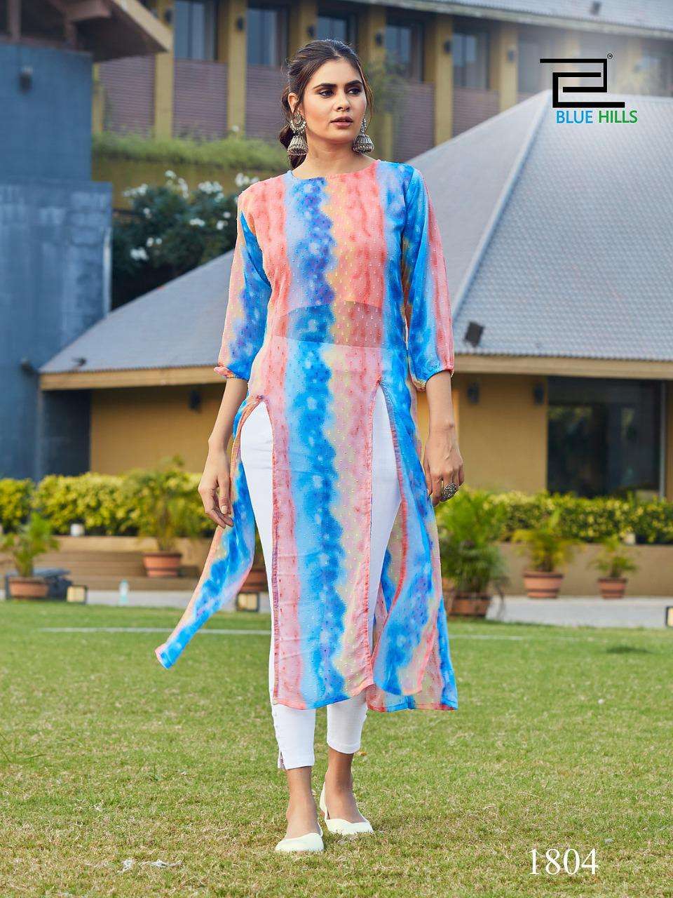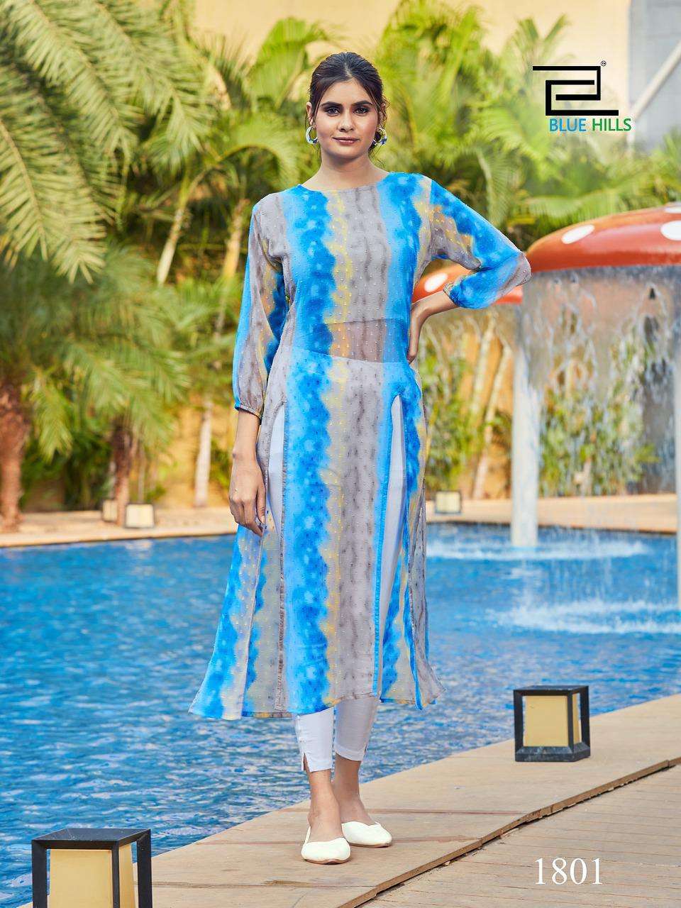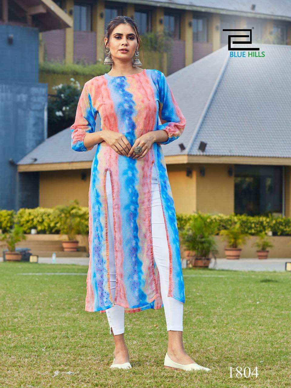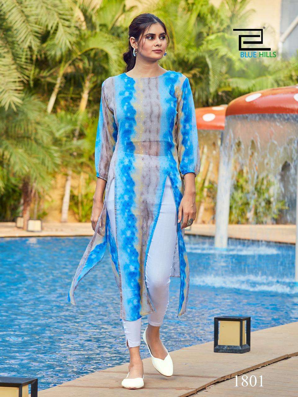 blue hills slit fancy georgette butti print kurti with inner pattern