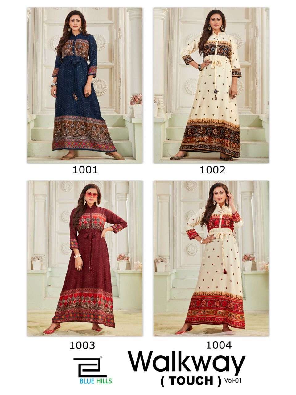 # BLUE HILLS 🌴WALKWAY TOUCH VOL 1 🌴 Long Gown Style Size: M (38) L (40) XL (42) XXL (44) 3XL (46) Rate - 630+GST Lenght 50+ 4 beautiful designs Dispatch 2 to 3 days |