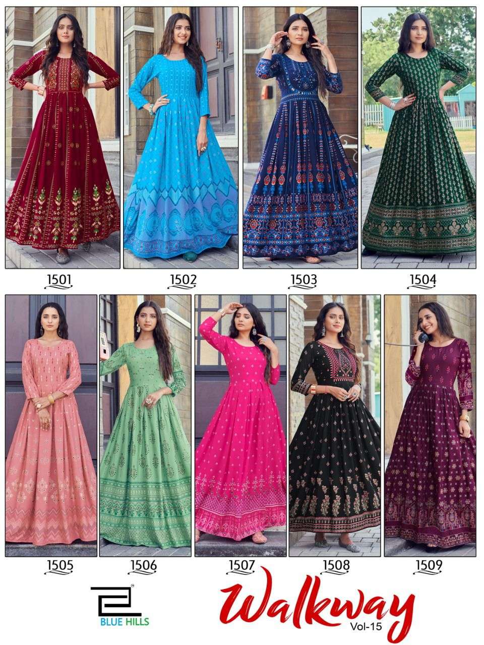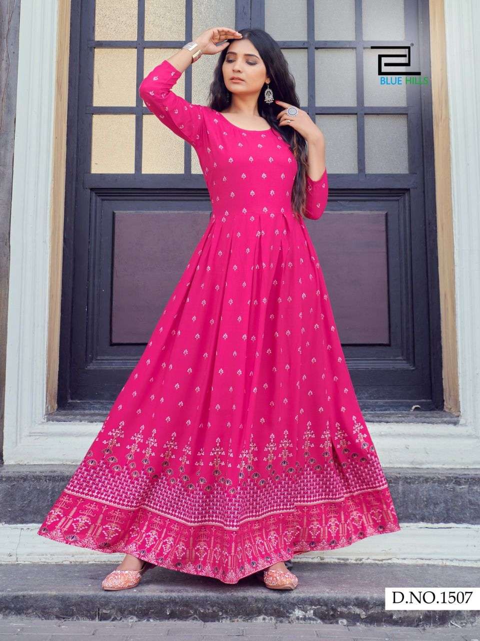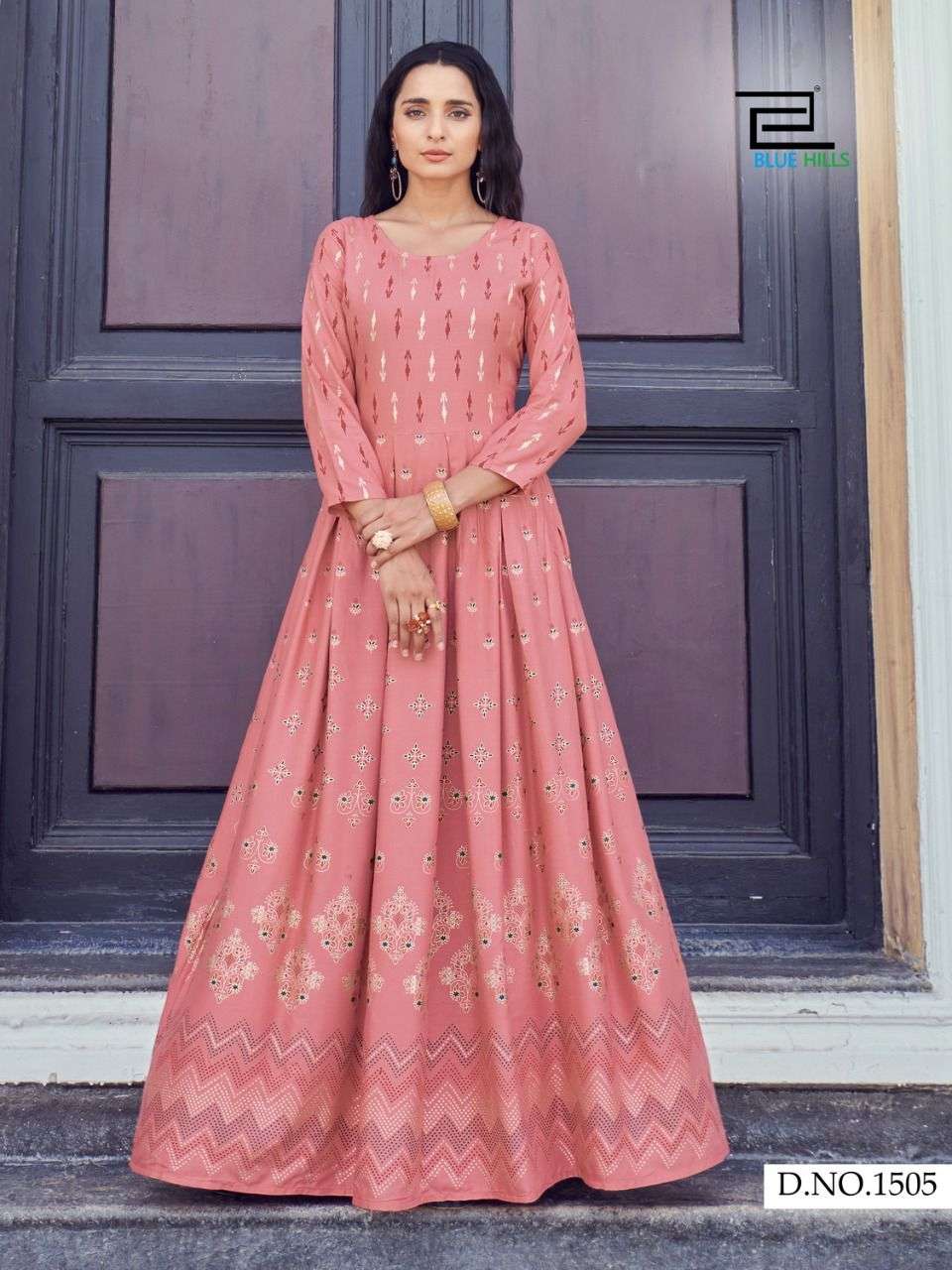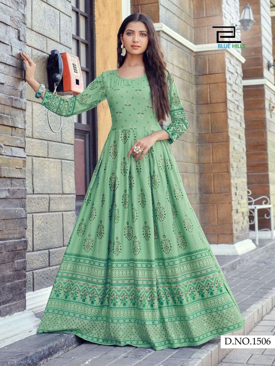blue hills walkway vol 15 rayon foil print long gown style kurtis supplier