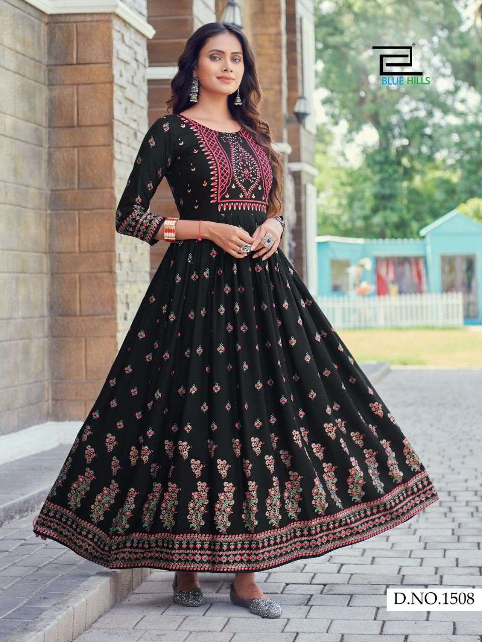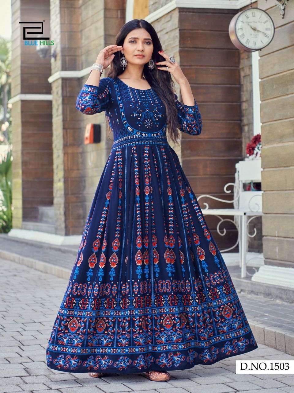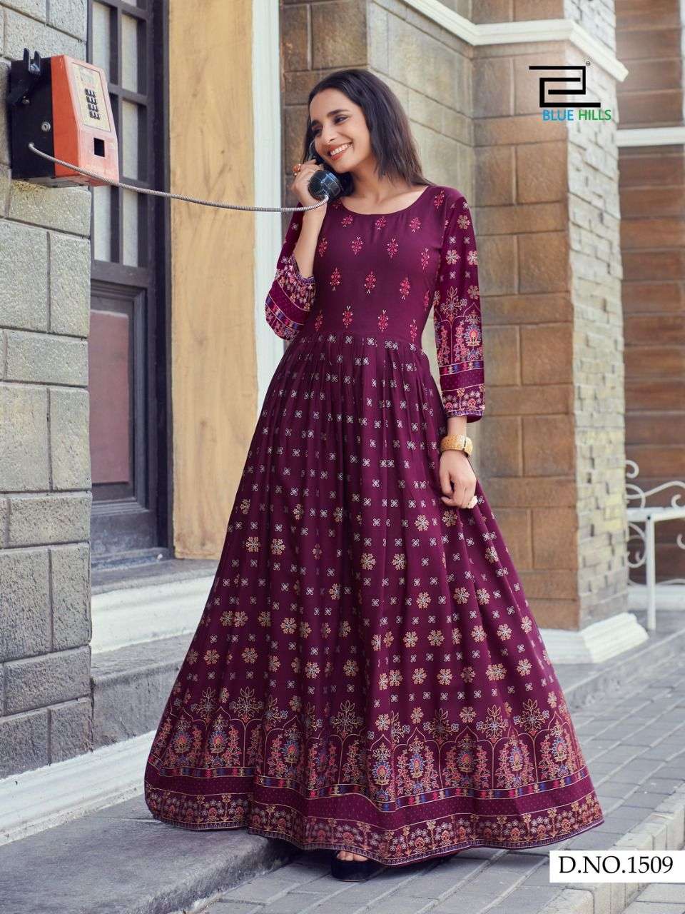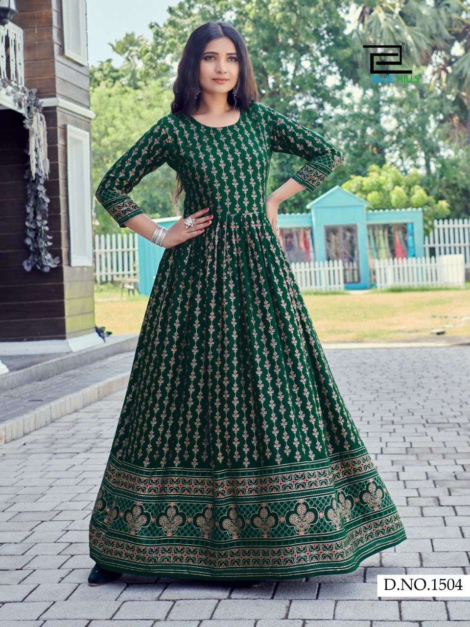 blue hills walkway vol 15 rayon foil print long gown style kurtis supplier
