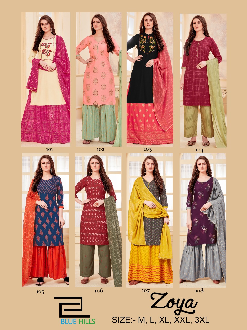 We are introducing BLUE HILLS new catalog 📕Catalogue name:- ___ZOYA__ 👗CLOTH TOP:- RAYON 14KG with Embroidery & Foil Print PLAZO:- Rayon 14kg with print SHARARA:- Rayon 14 kg foil print SKIRT-: Rayon 14 kg foil print DUPATTA-: Cotton mal with gold print FULL SIZE Rate 799+GST Set to set Size:- M,L XL XXL XXXL AVAILABLE 8 DESIGNS CATALOGUE  🚛 :-Booking Open Dispatched in 2 to days From:- VEE FAB INDIA |