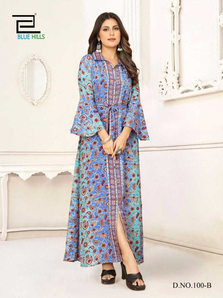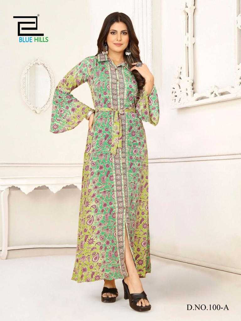# BLUE HILLS 👗CLOTH:- *Heavy French crape print Concept-: with same print belt ✅Pattern-: all button openable Length 53 Size:- M (38) L (40) XL (42) XXL (44) 3XL (46) Rate - 499+GST 4 DESIGNS CATALOGUE Dispatch 2 to 3 days |