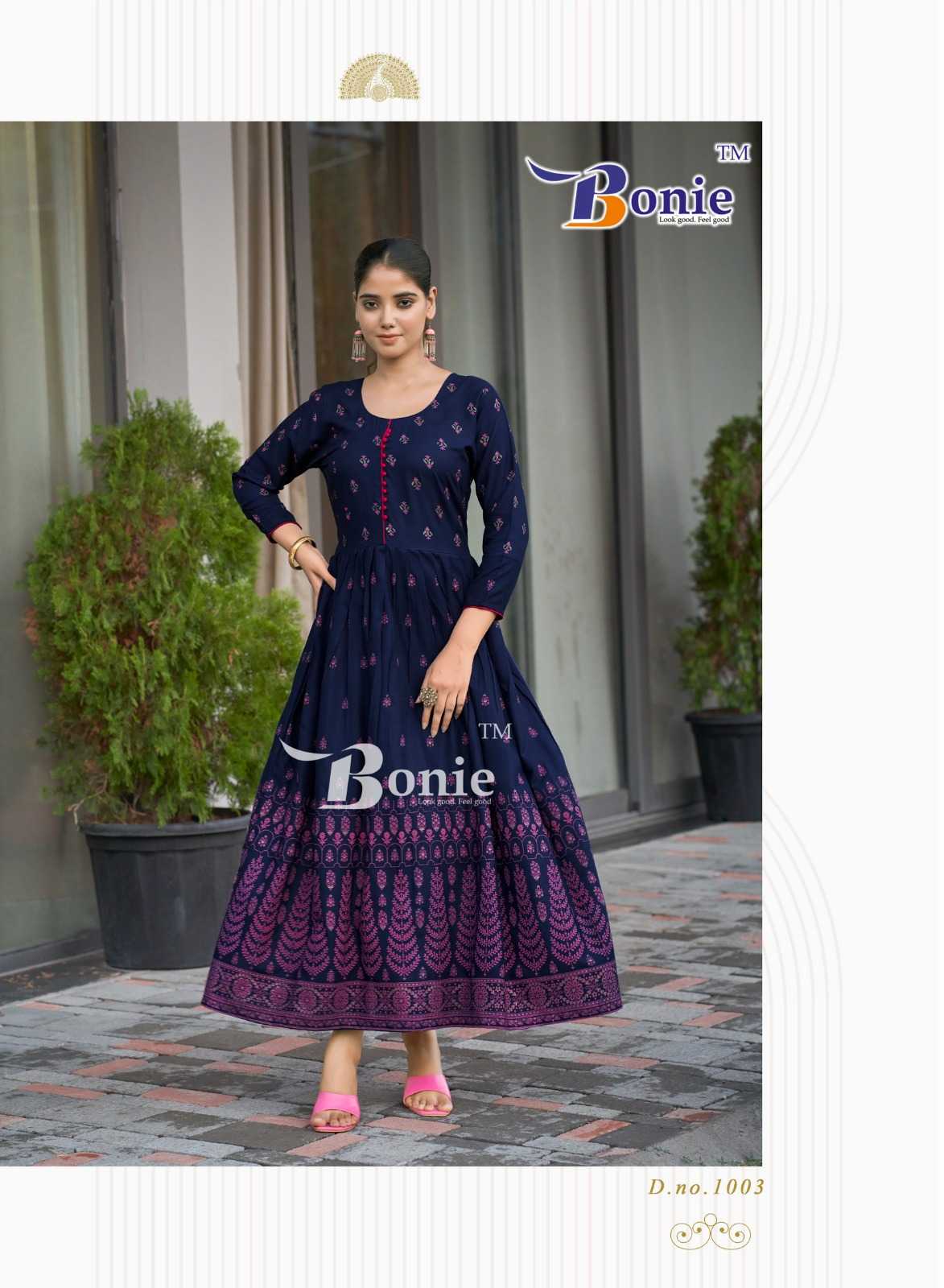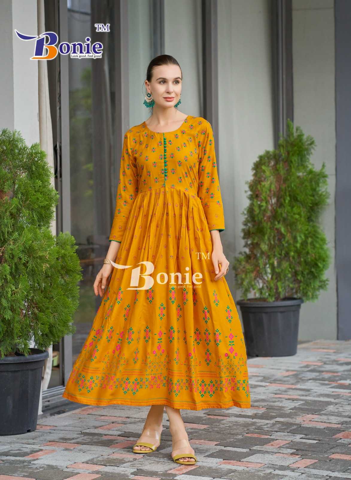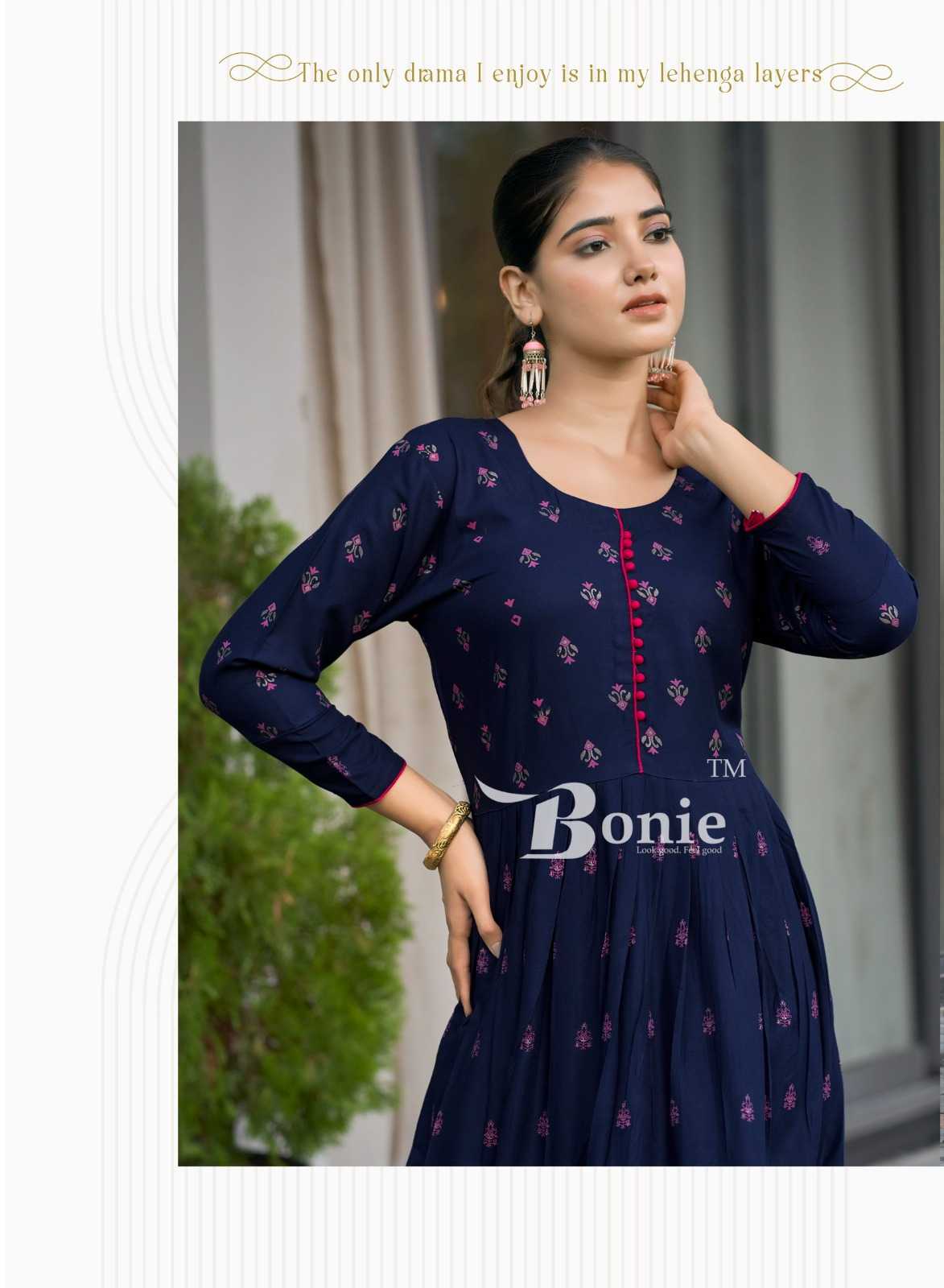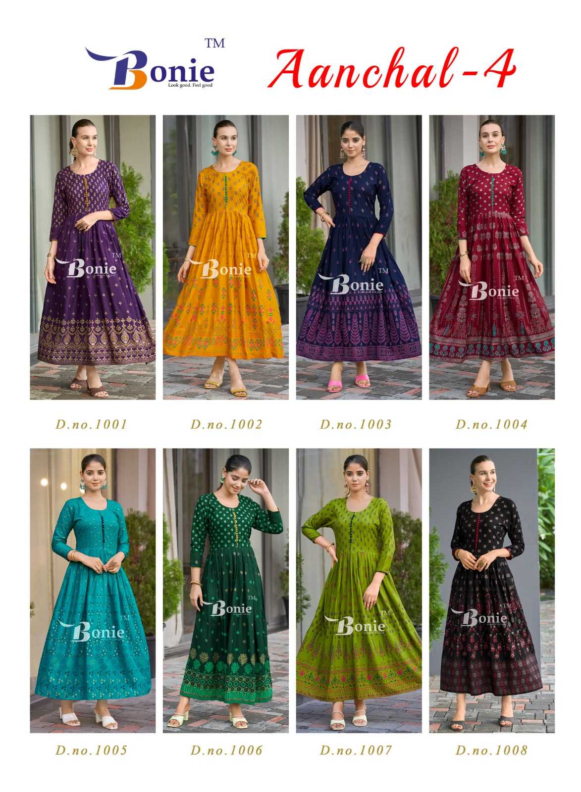 bonie aanchal vol 4 rayon print fancy comfy wear long ghera full stitch kurti