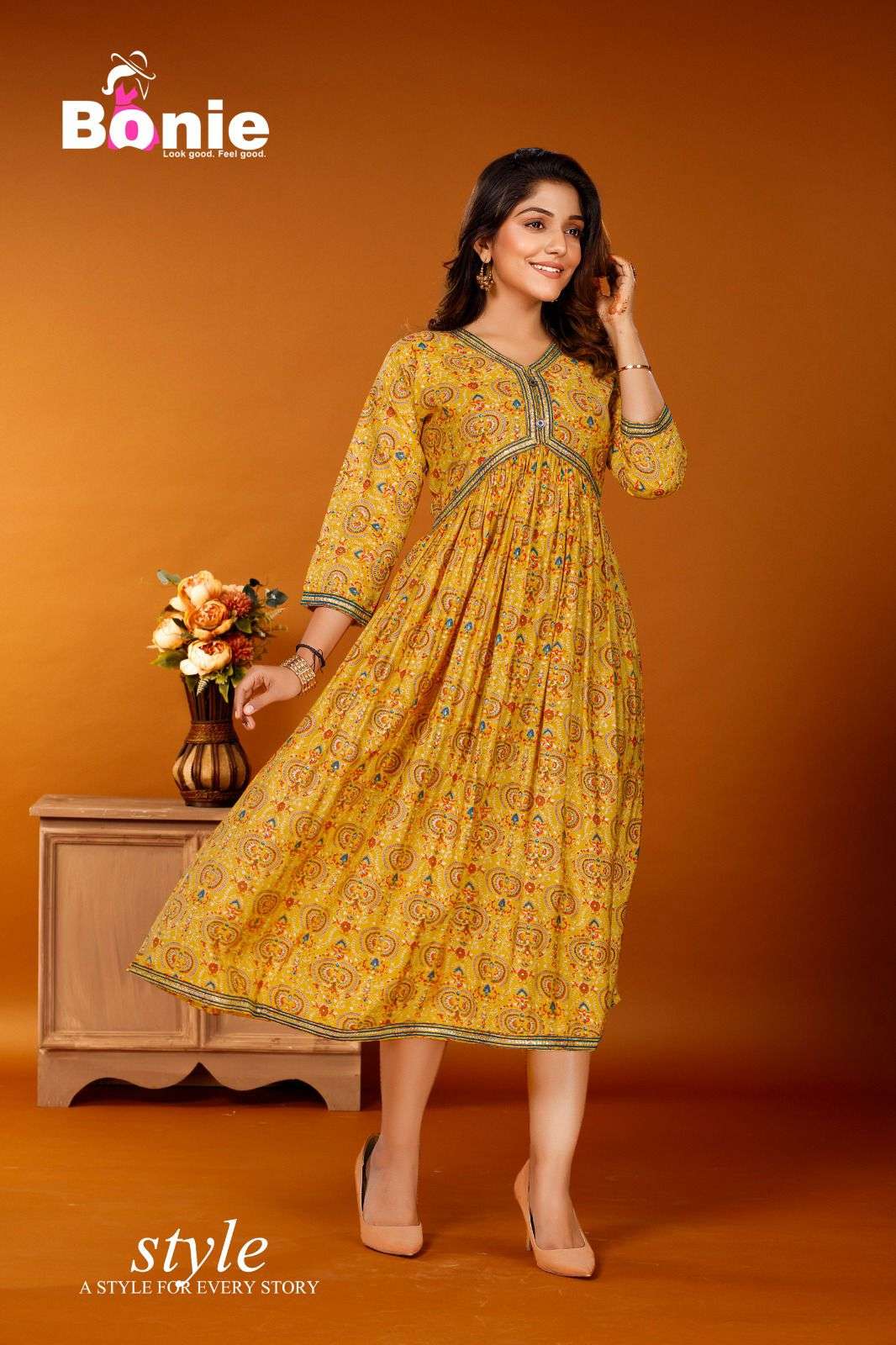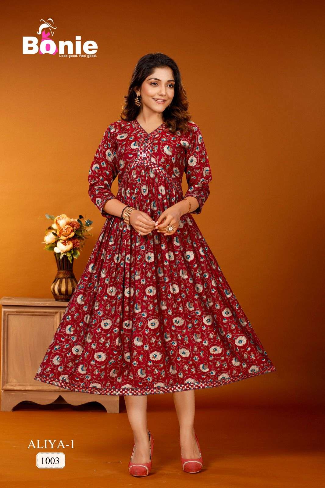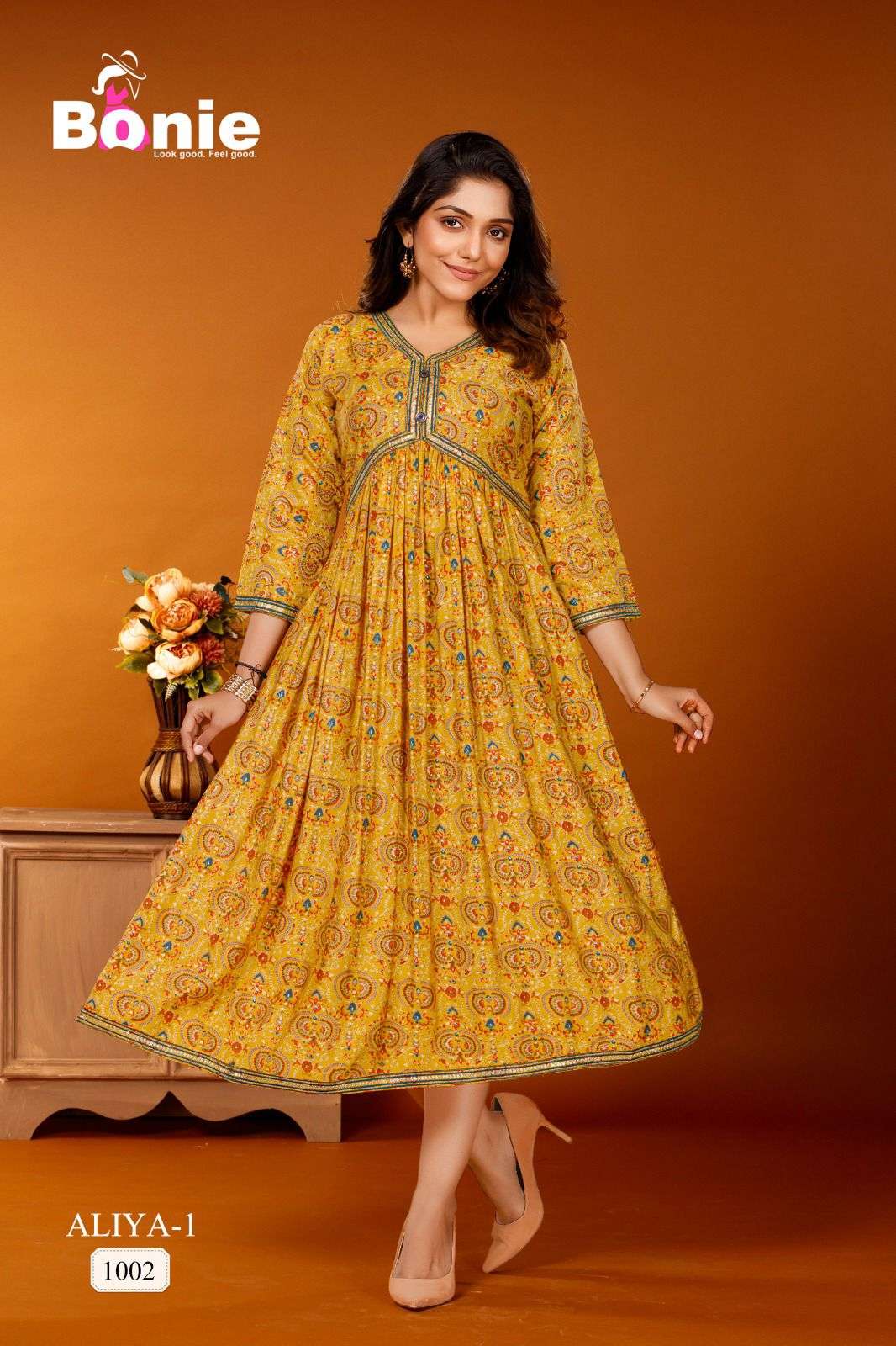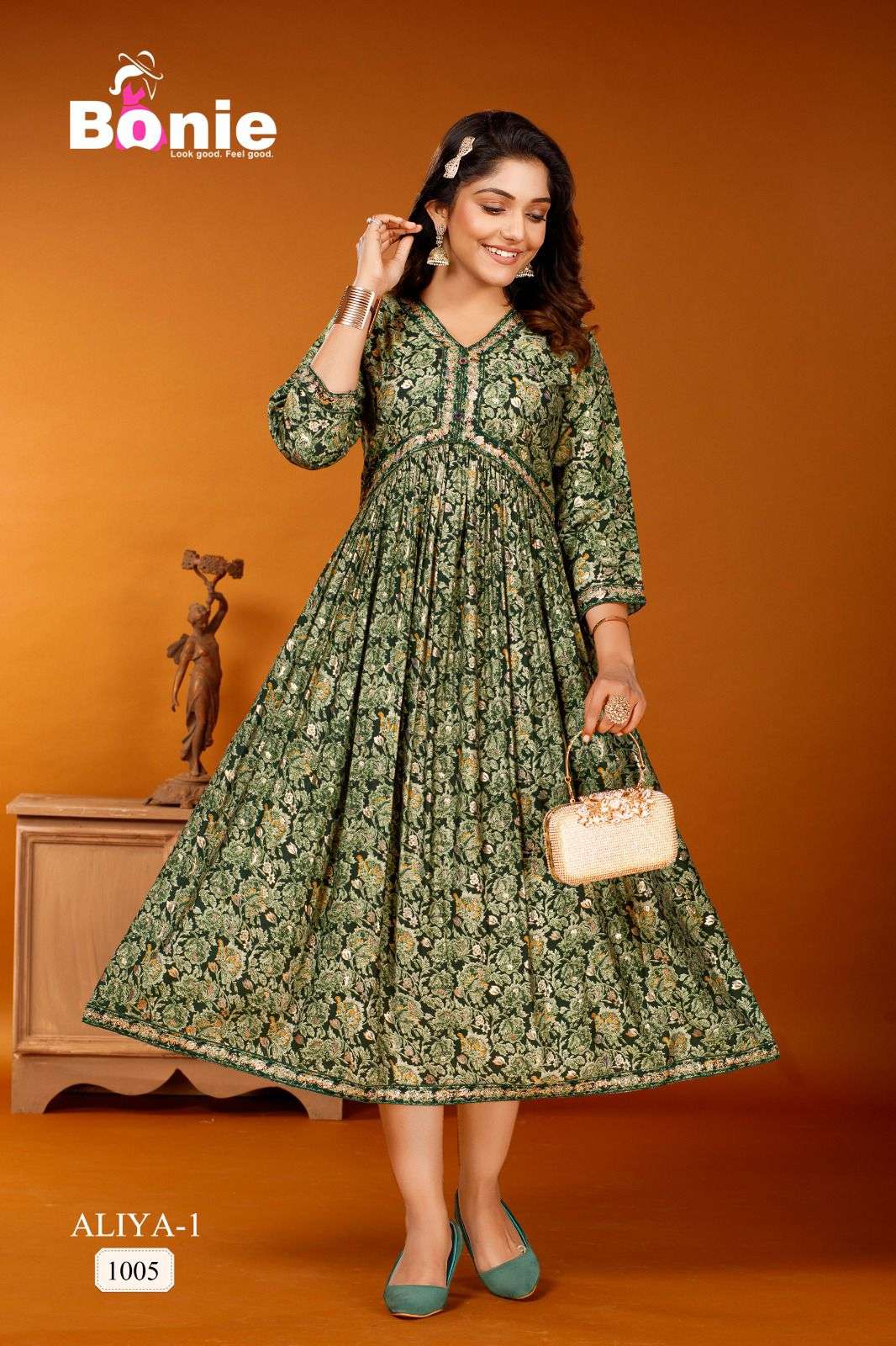 BONIE ALIYA CHANDERI PROSIUM PRINTED KURTI CATALOG WHOLESALER BEST RATE