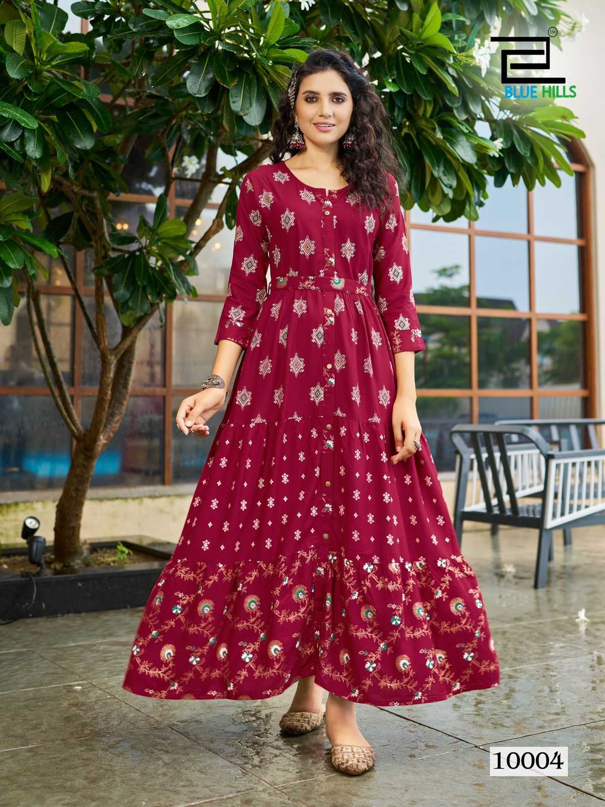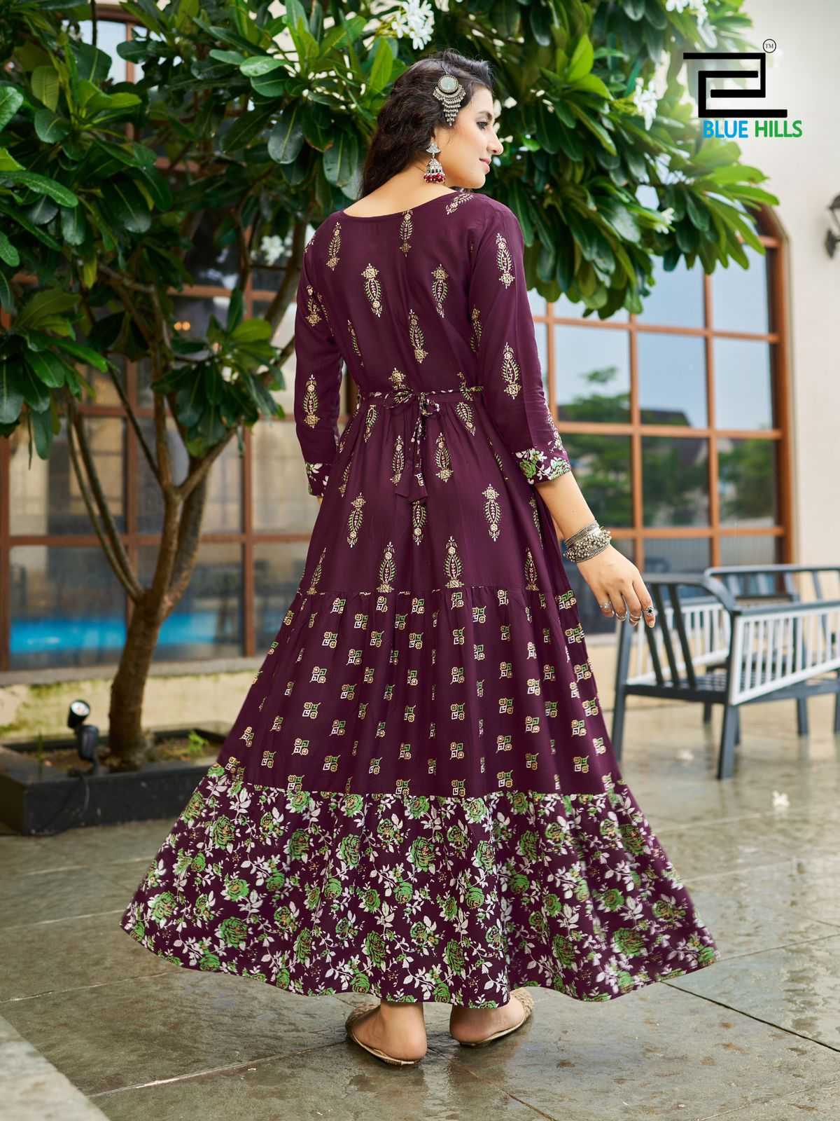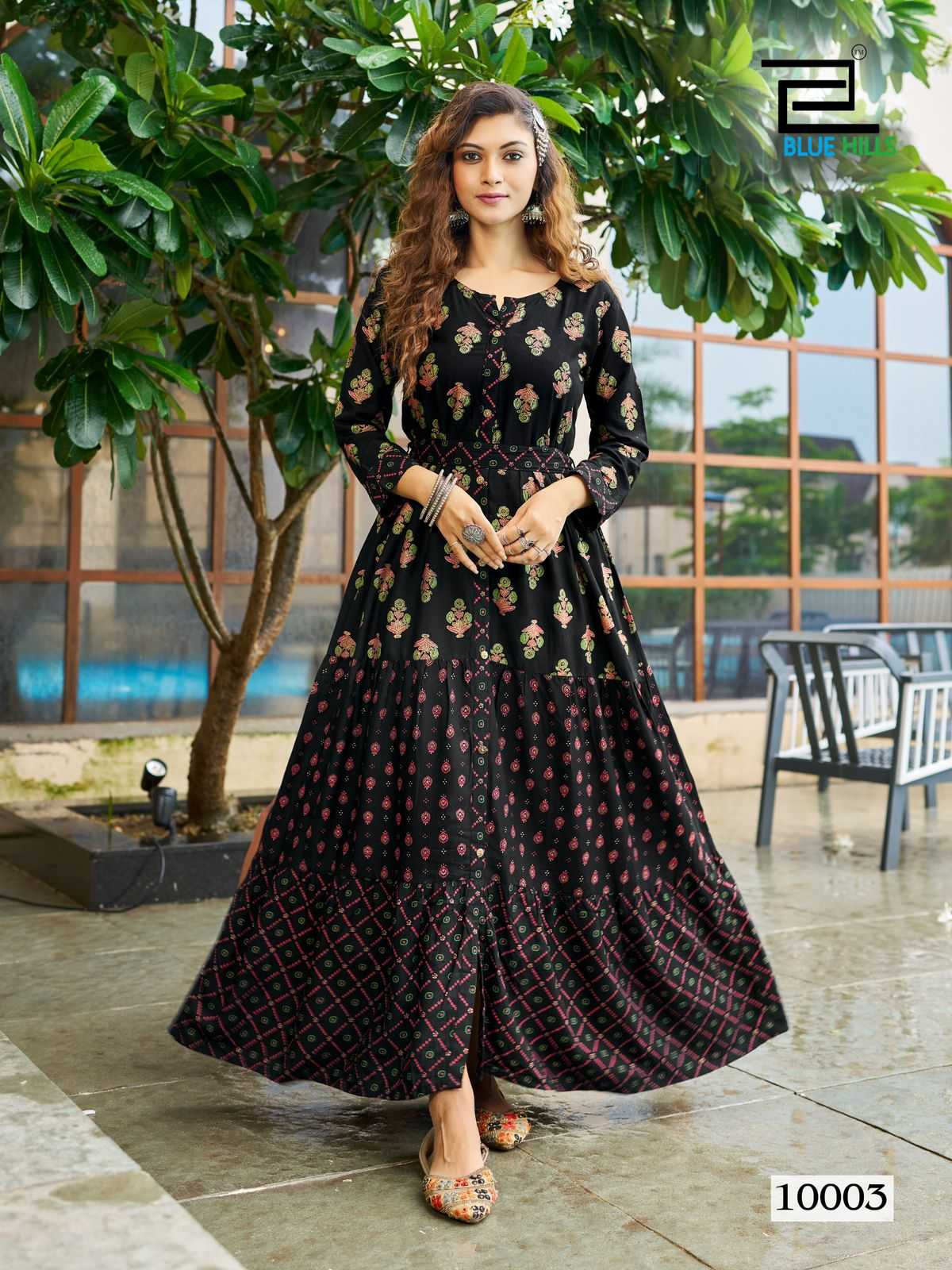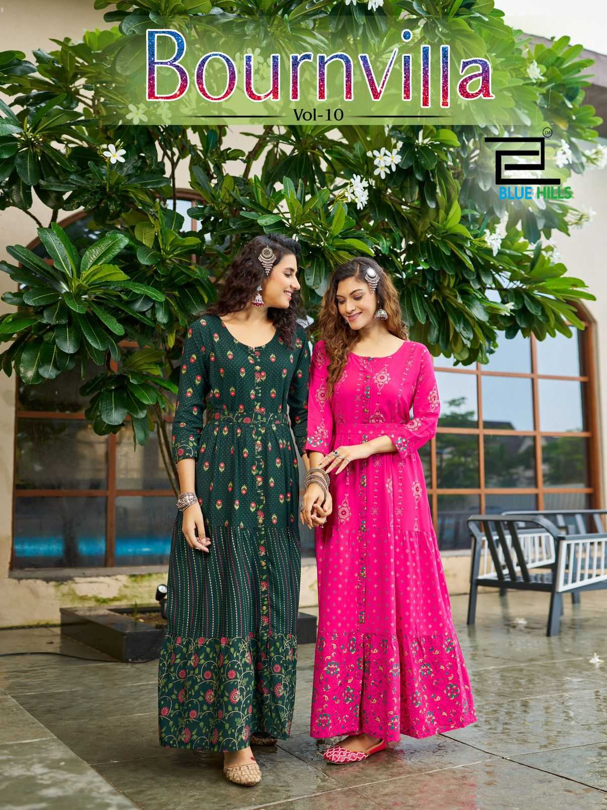 bournvilla vol 10 blue hills print rayon readymade big size frill gown