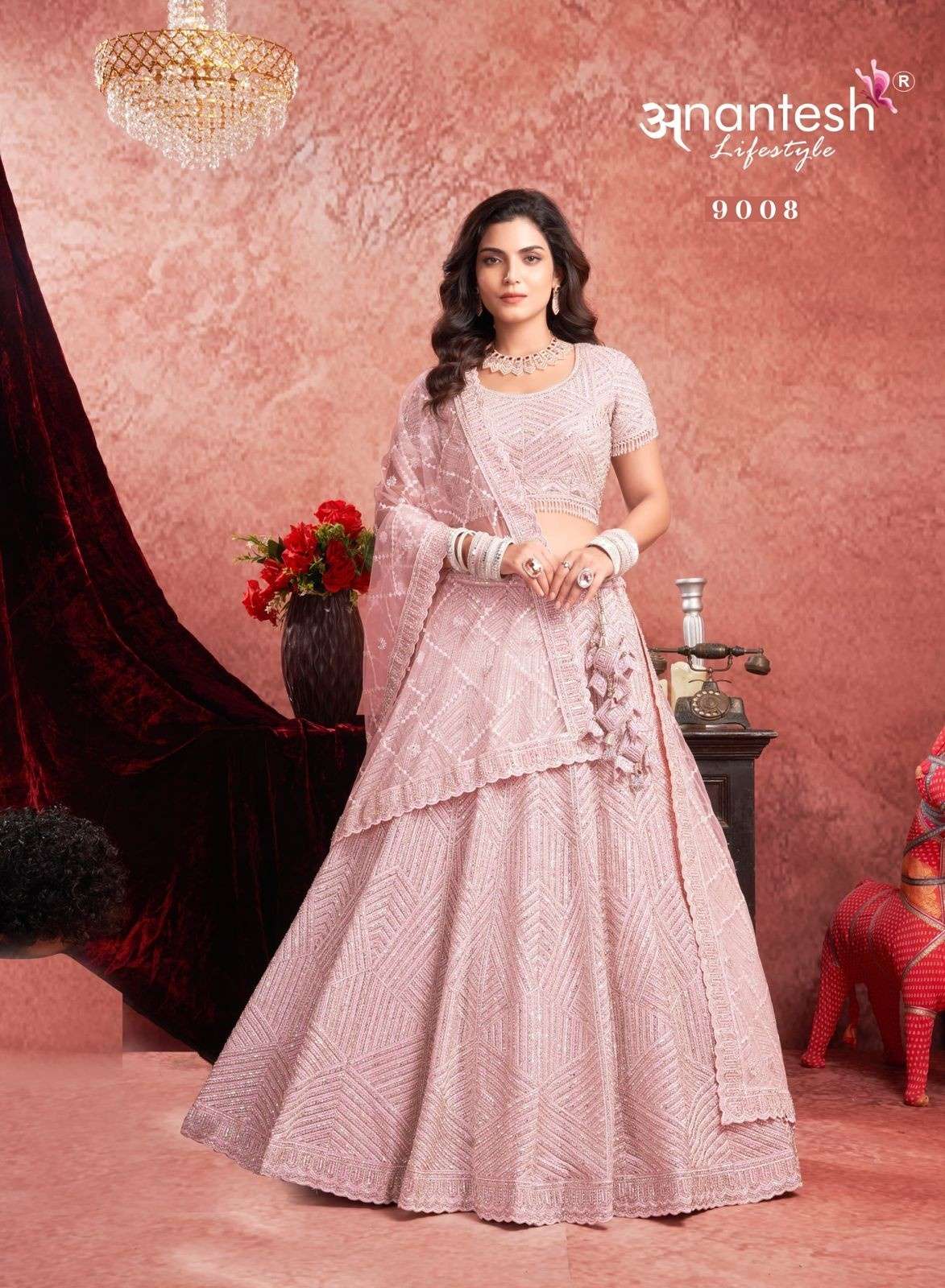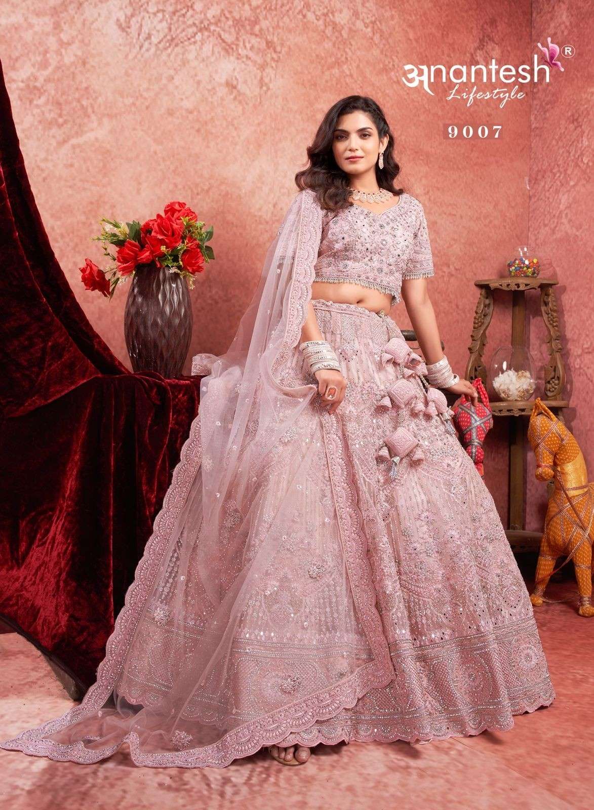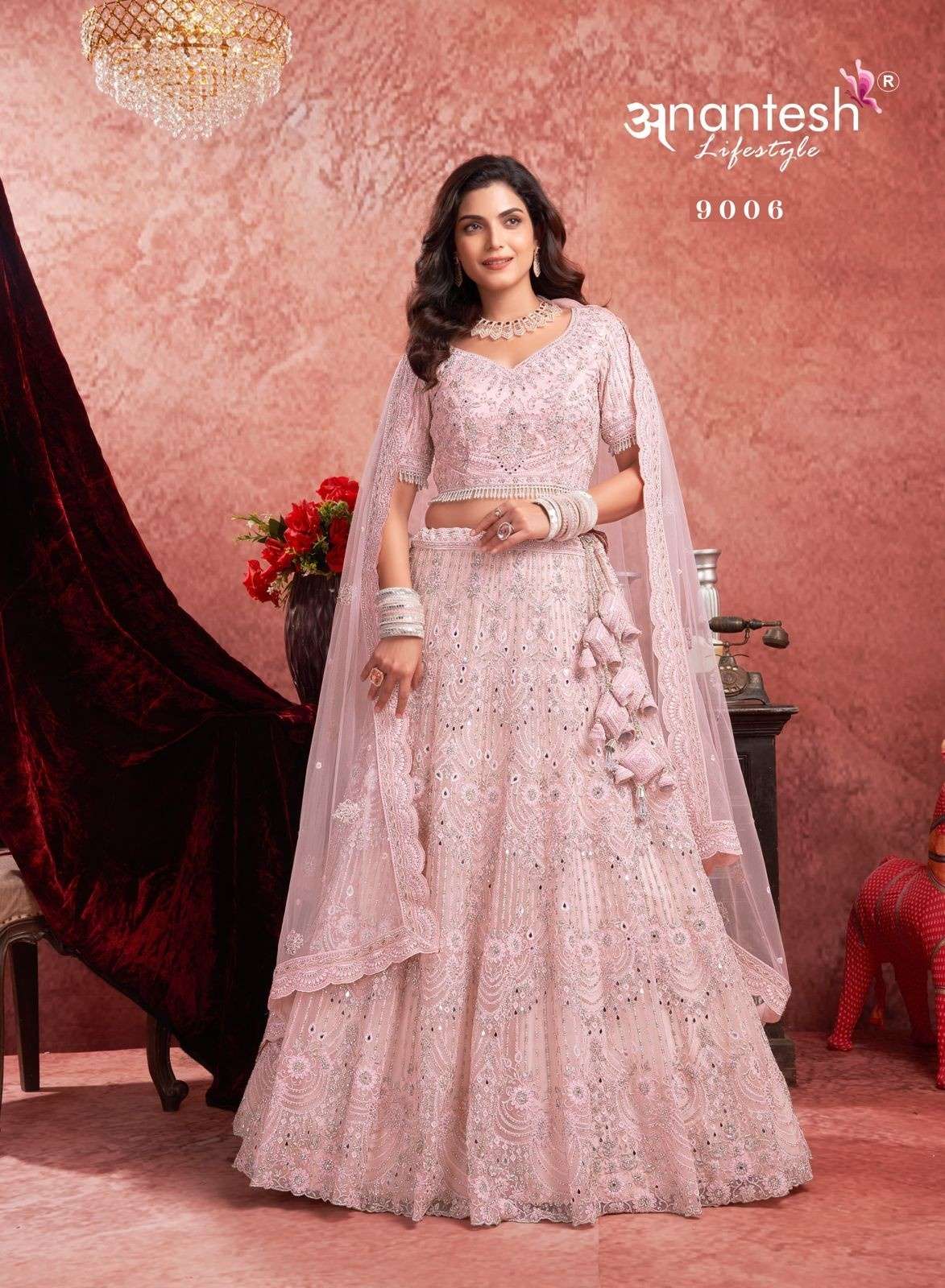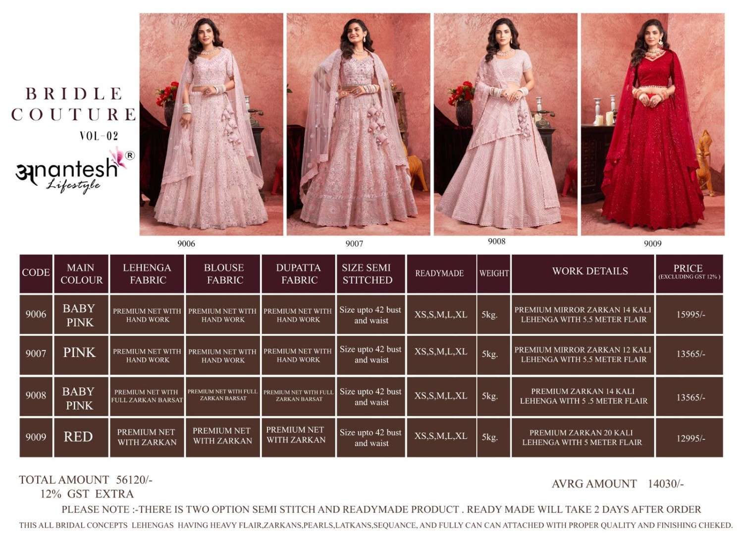ANANTESH ®️ LIFESTYLE BRIDAL COUTURE VOL 4 SERIES 9017 TO 9020 LEHENGAS WITH BIG METER PLUS FLAIR,HEAVY LATKANS, ZARKANS,MIRROR HAND WORK,BRIDAL CONCEPT FOR ENGAGEMENT,WEDDING, SIDERS,PRE-WEDDING PARTIES RATE CARD AND FABRIC DETAILS ATTACHED GST 12% TAX EXTRA READY MADE AND UNSTICH BOTH OPTION IS AVAILABLE READ DETAILS CAREFULLY AND ORDER ACCORDING TO YOUR REQUIREMENT FULL CATLOGUE AVAILABLE |
