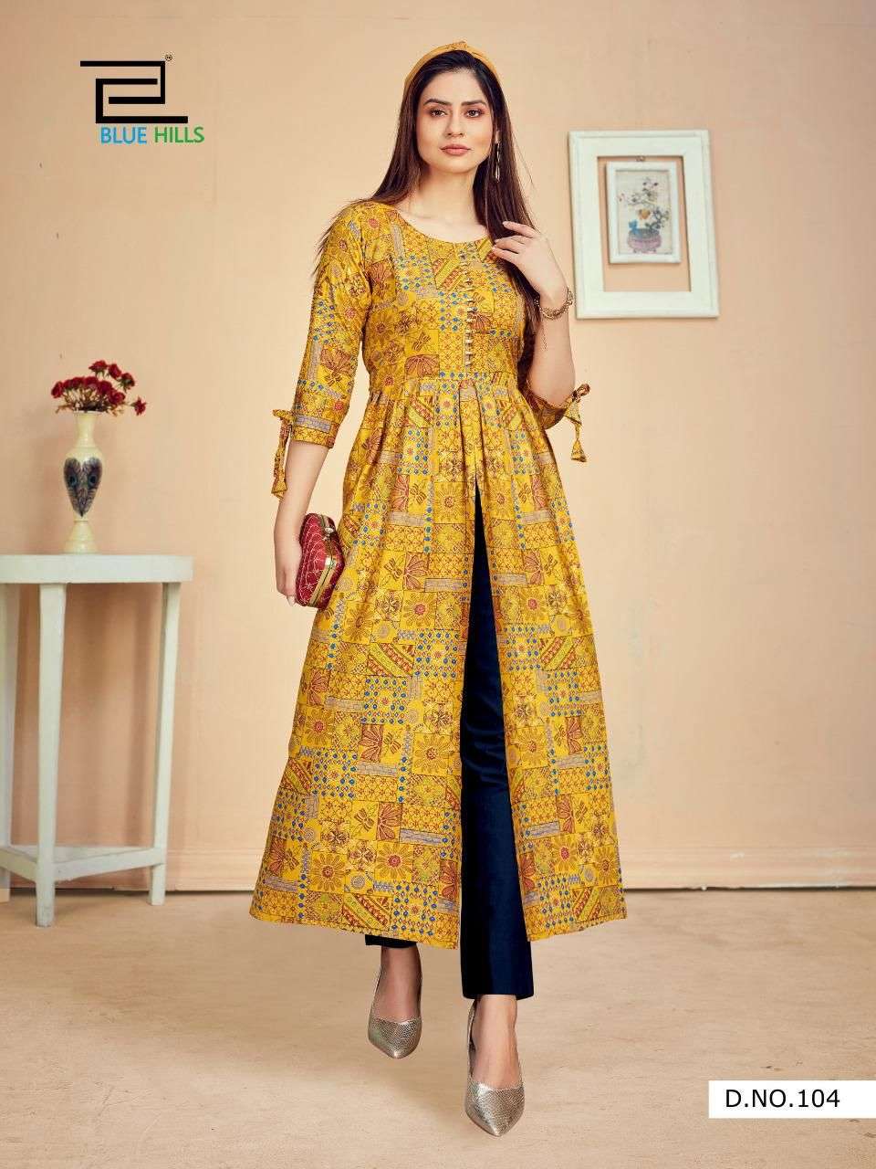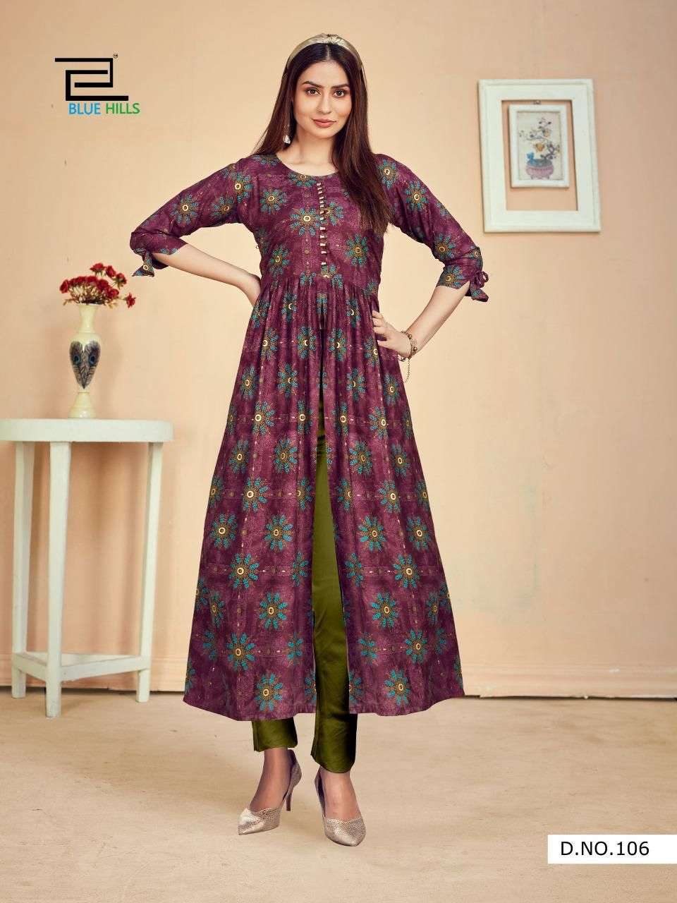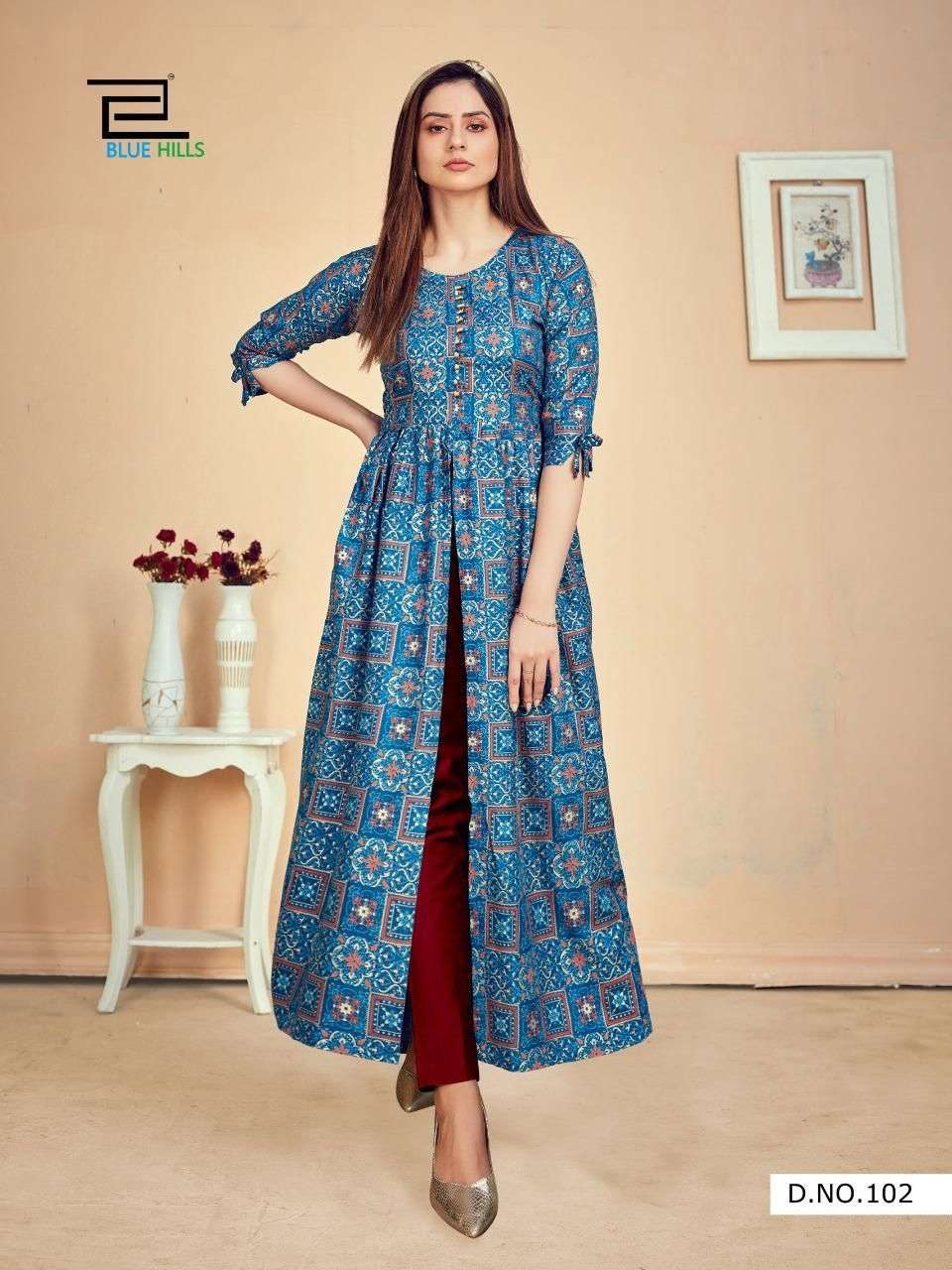 BLUE HILLS (KURTI) Presents      CALENDER VOL -5 - RAYON 14 KG Foil print - centre Cut With Frill Size: M (38) L (40) XL (42) XXL (44) 3XL (46) 4XL (48) 5XL (50) Rate 499+GST Set to set . 8 BEAUTIFUL DESIGNS  Dispatch 2 to 3 days |