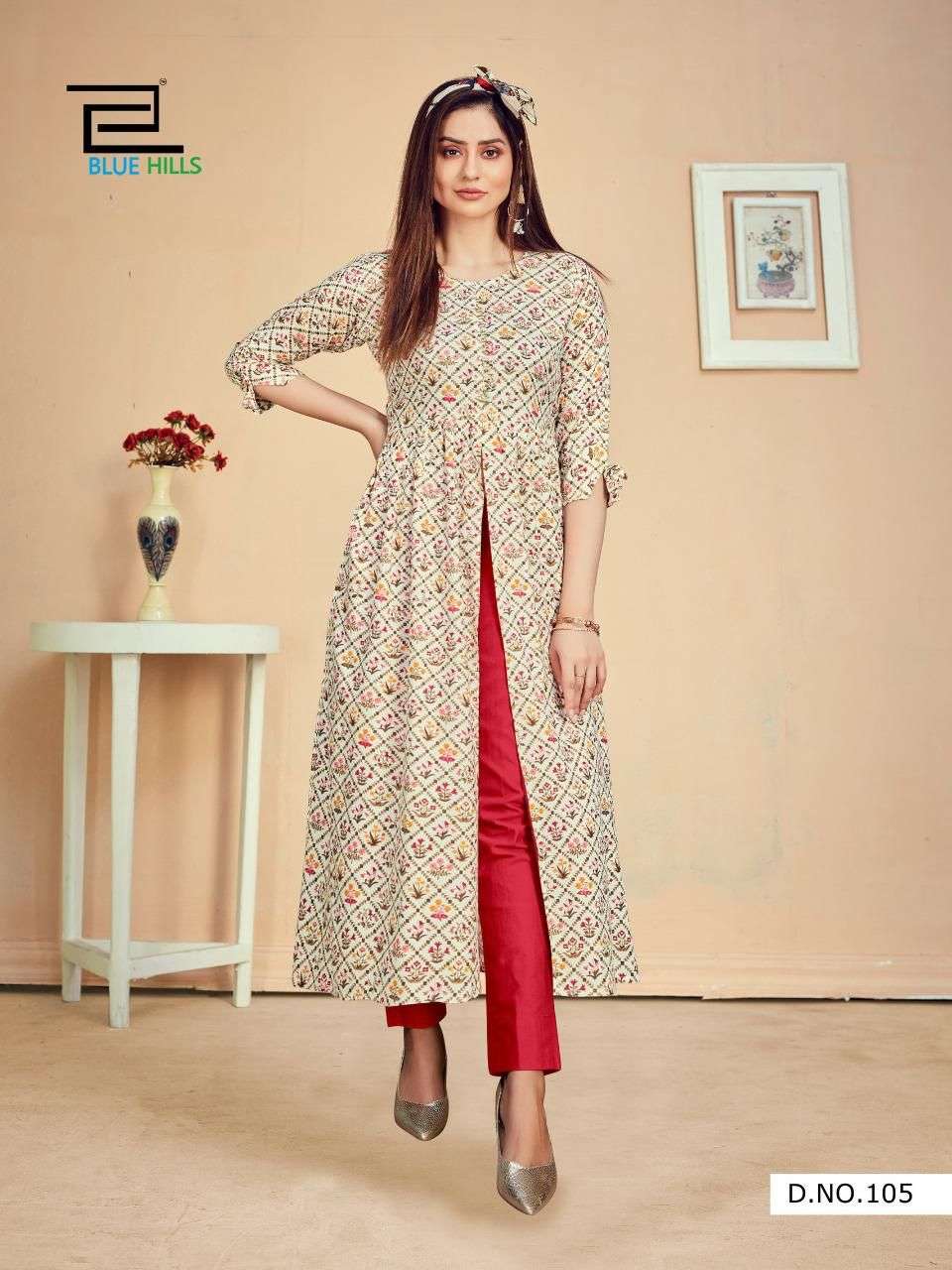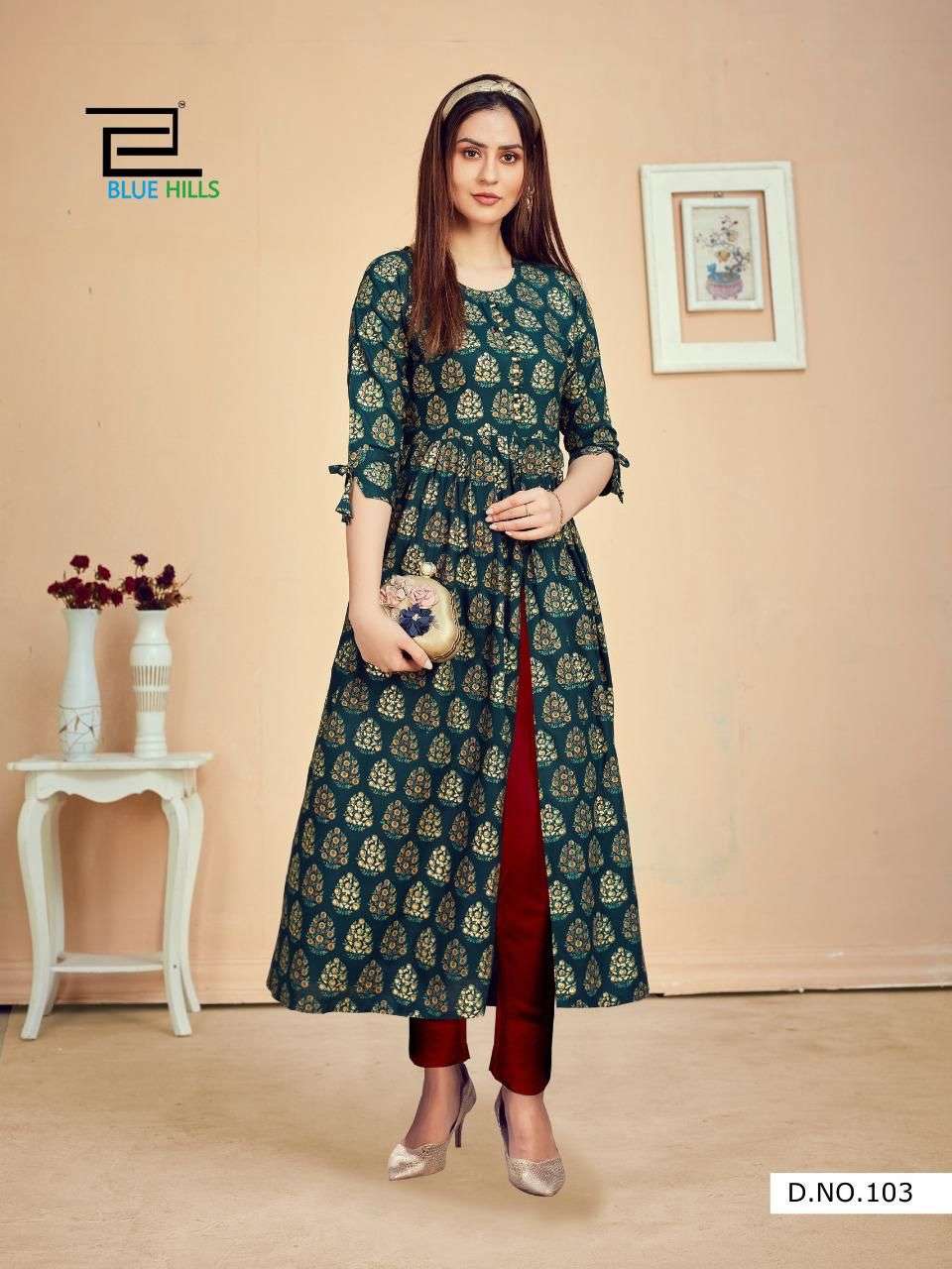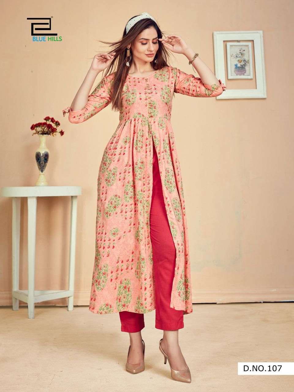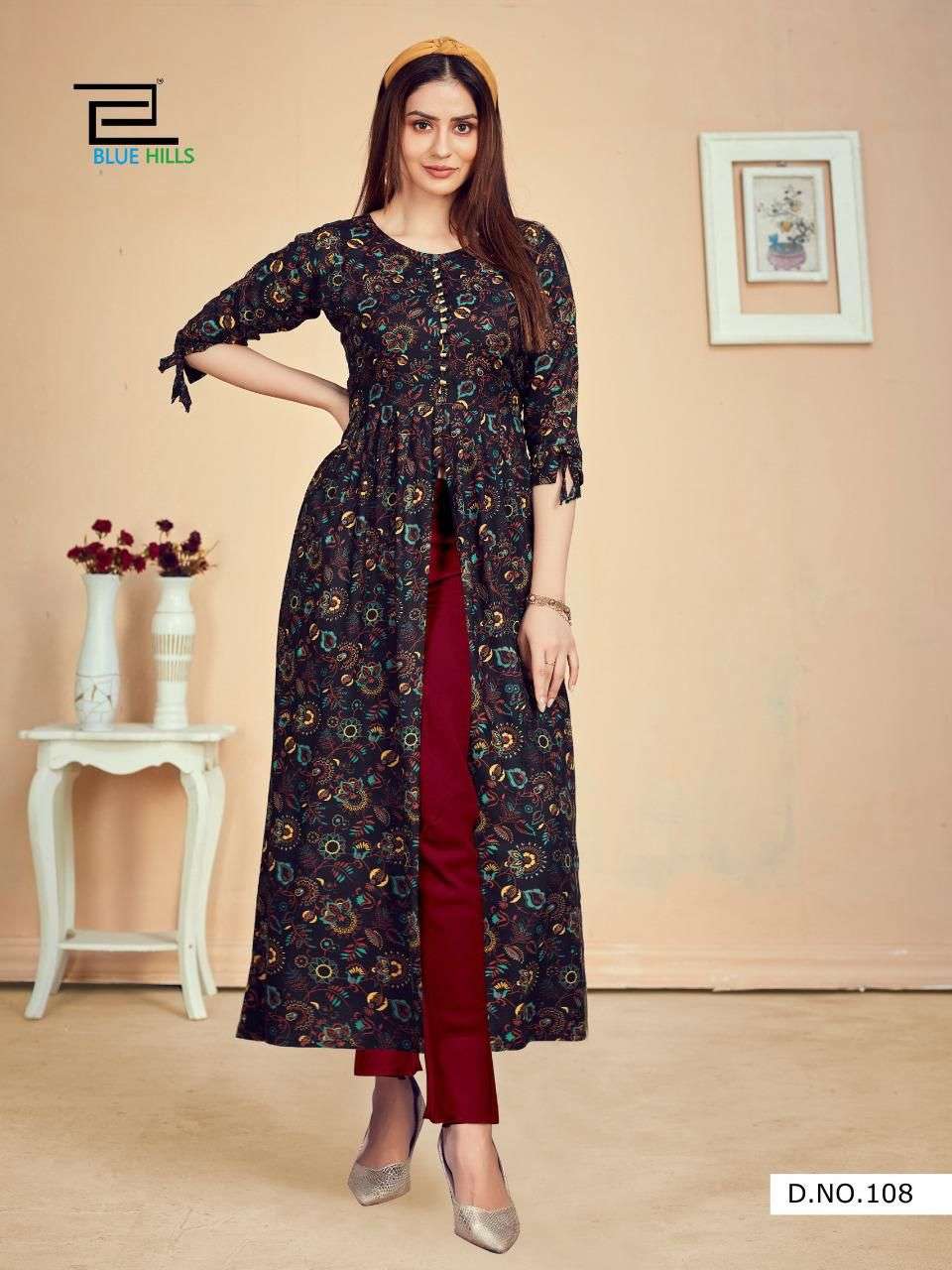 BLUE HILLS (KURTI) Presents      CALENDER VOL -5 - RAYON 14 KG Foil print - centre Cut With Frill Size: M (38) L (40) XL (42) XXL (44) 3XL (46) 4XL (48) 5XL (50) Rate 499+GST Set to set . 8 BEAUTIFUL DESIGNS  Dispatch 2 to 3 days |