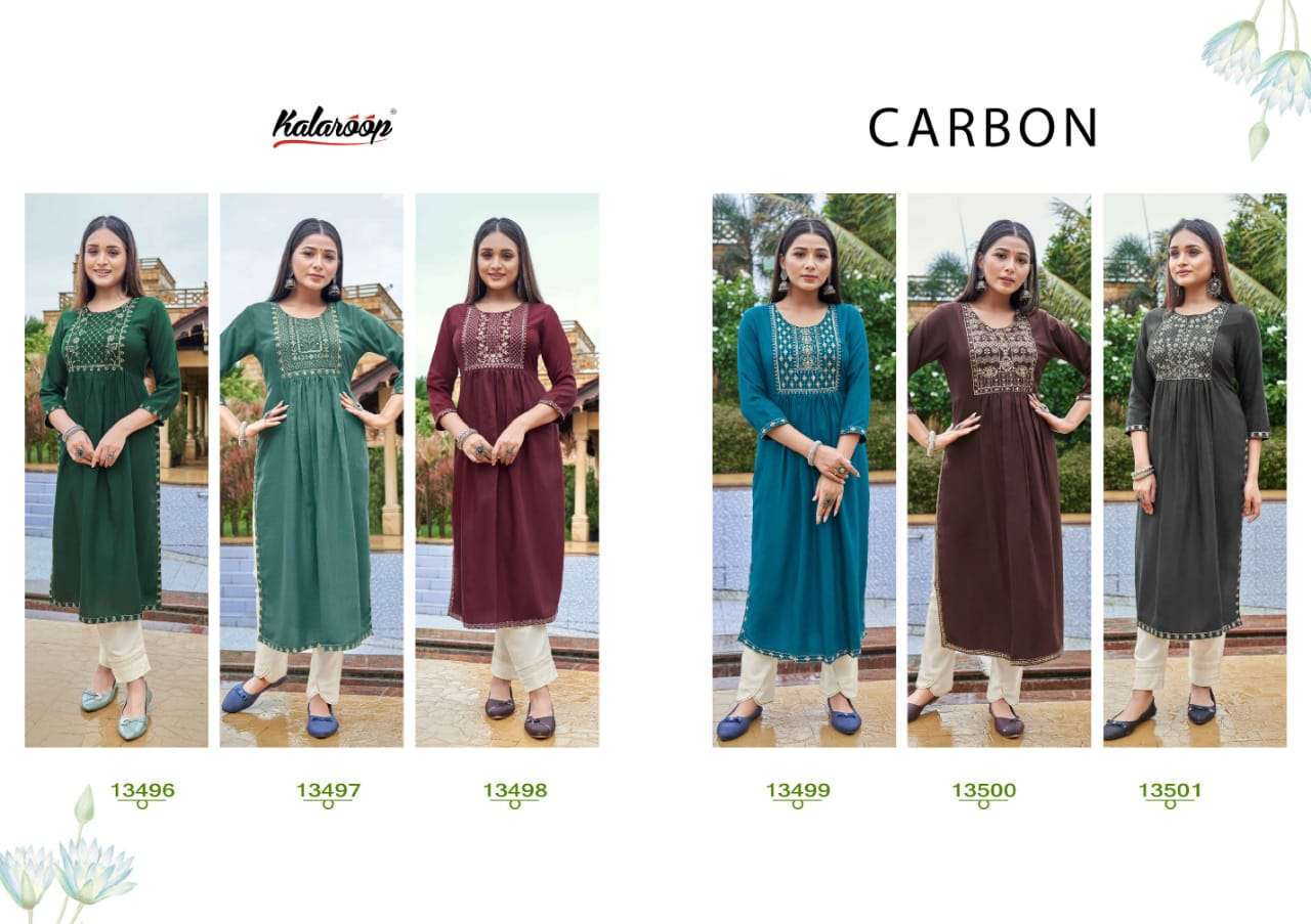 💕 Kalaroop by Kajree has launched Catalog name: Carbon 🔸 Fabric Details 🔸 ▪Top:- Fancy Rayon Silk Fabrics With Embroidery Work & Naira Cut. ▪Total Design:- 06 ▪Size:- M, L, XL, XXL, 3XL ⏰Dispatching 1 To 2 days After |