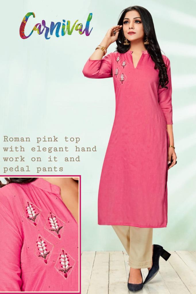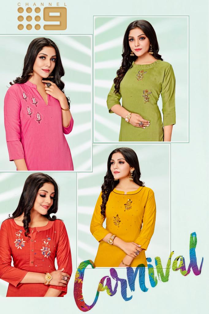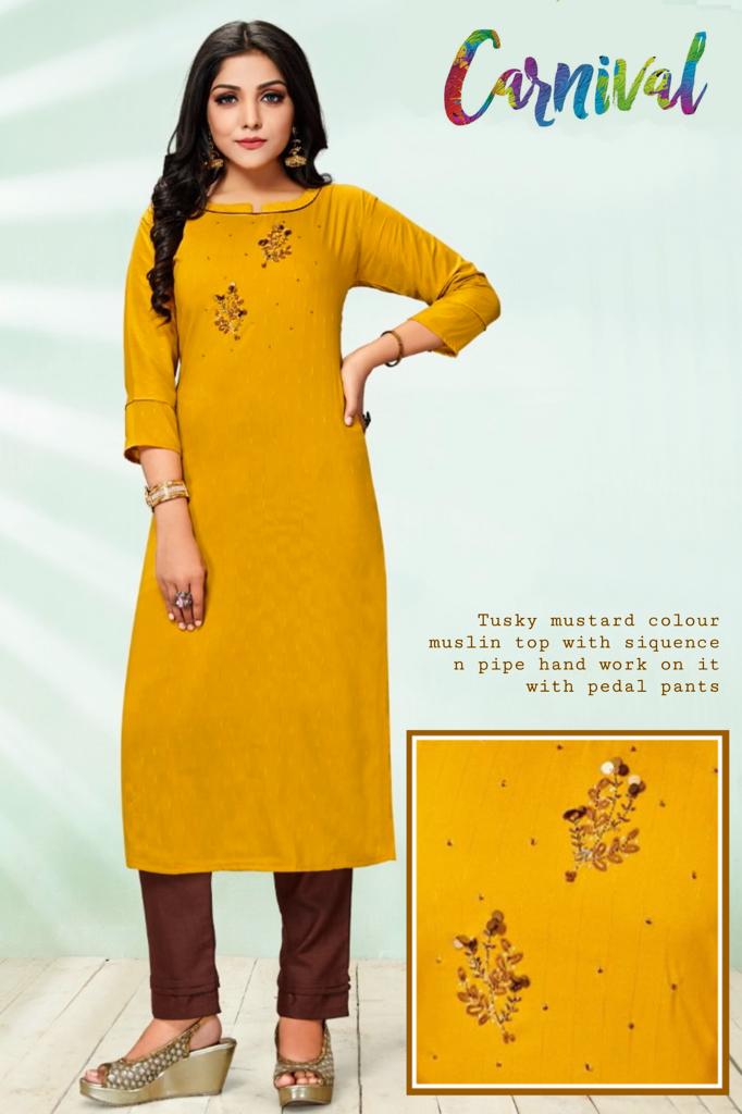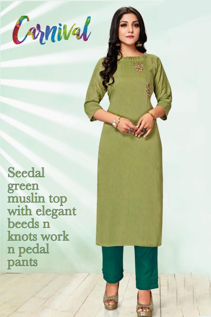 CARNIVAL PARTY POPS ————————————— *New Super MUSLIN PATTERN Kurti With Elegant knot pipe n siquence work on it and pedal pants Catalogue * 📙Catalogue # CARNIVAL 💰Rate # *₹*6️⃣9️⃣5️⃣ *only 👗Designs # 04 ✂Sizes #. L- XL-XXL 👘*Fabric Details * Kurta- Finest Quality of muslin pant - duke cotton Regards__ Channel 9 SURAT |