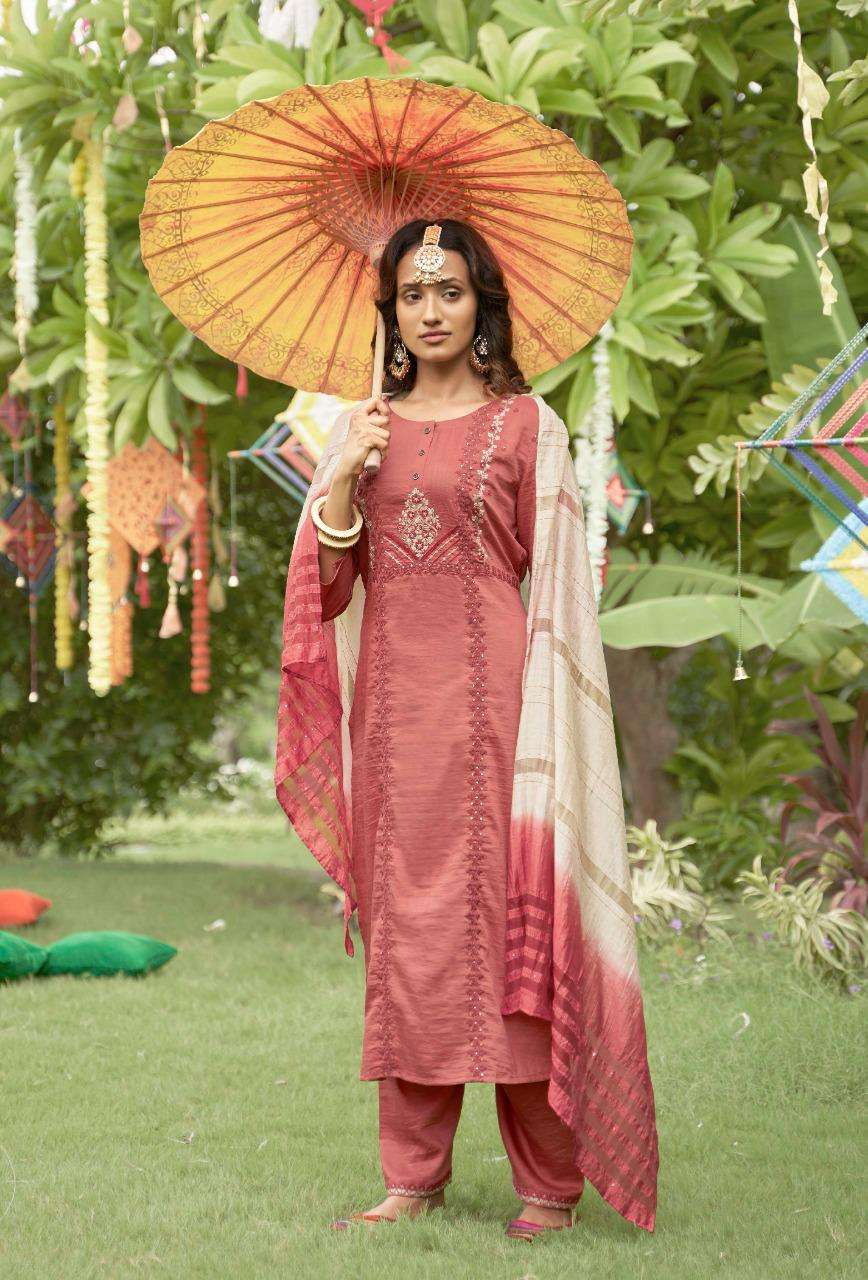 *Celebration (Rs2180)* Fabric : vichitra dyed./ fancy padding / coding spun. Blouse : heavy embroidery work silk base. 8 Designs |