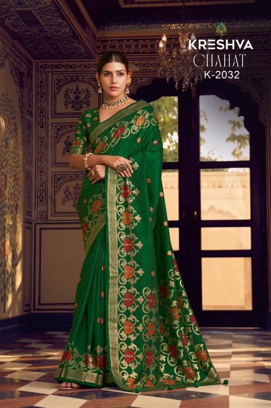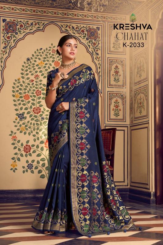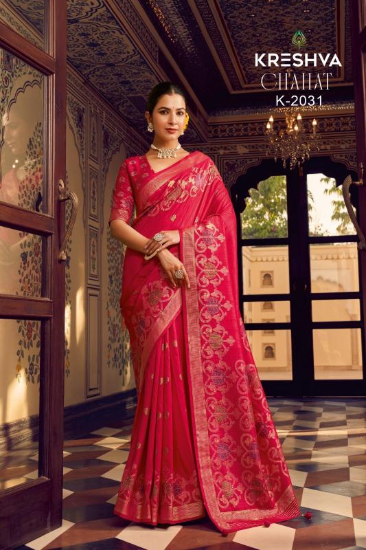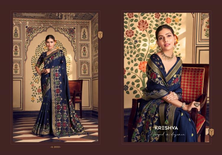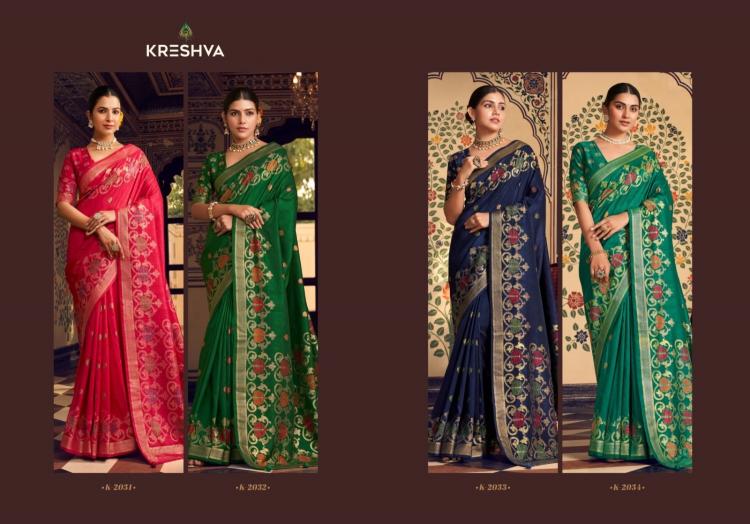 Brand : Kreshva Catalog: Chahat Series : 2031 To 2034 Saree : Super P.V. Silk With 801 Banarasi Traditional Design Zari Work With Glam Soft Finish Blouse : Super P.V. Silk Price : 1295/- +5% Gst Occasion : Party Wear ,Festival Wear |